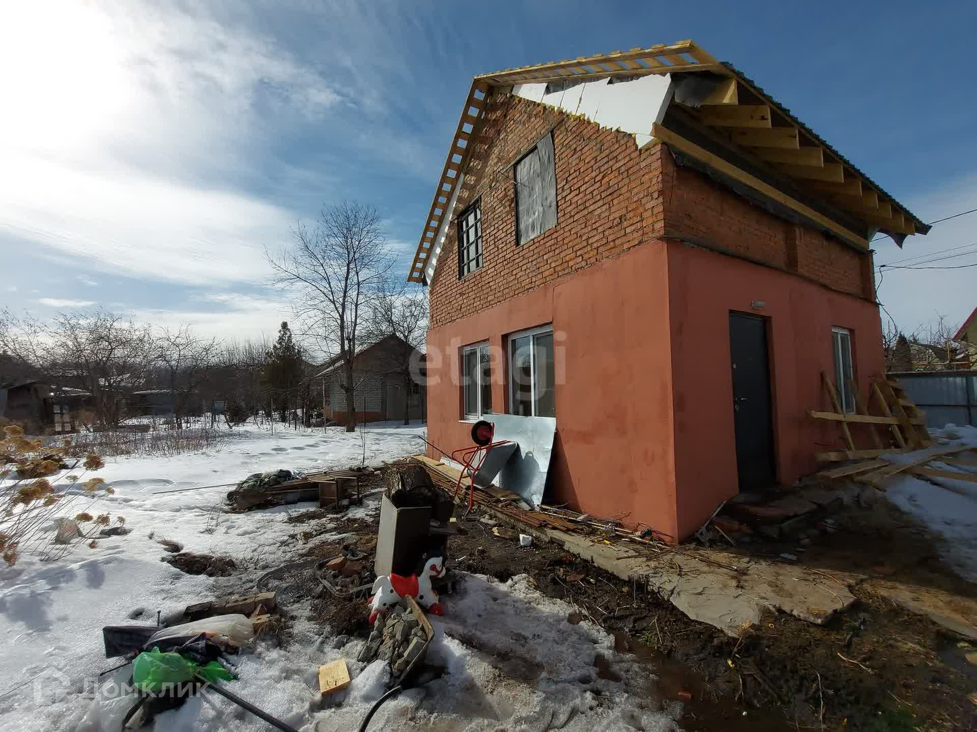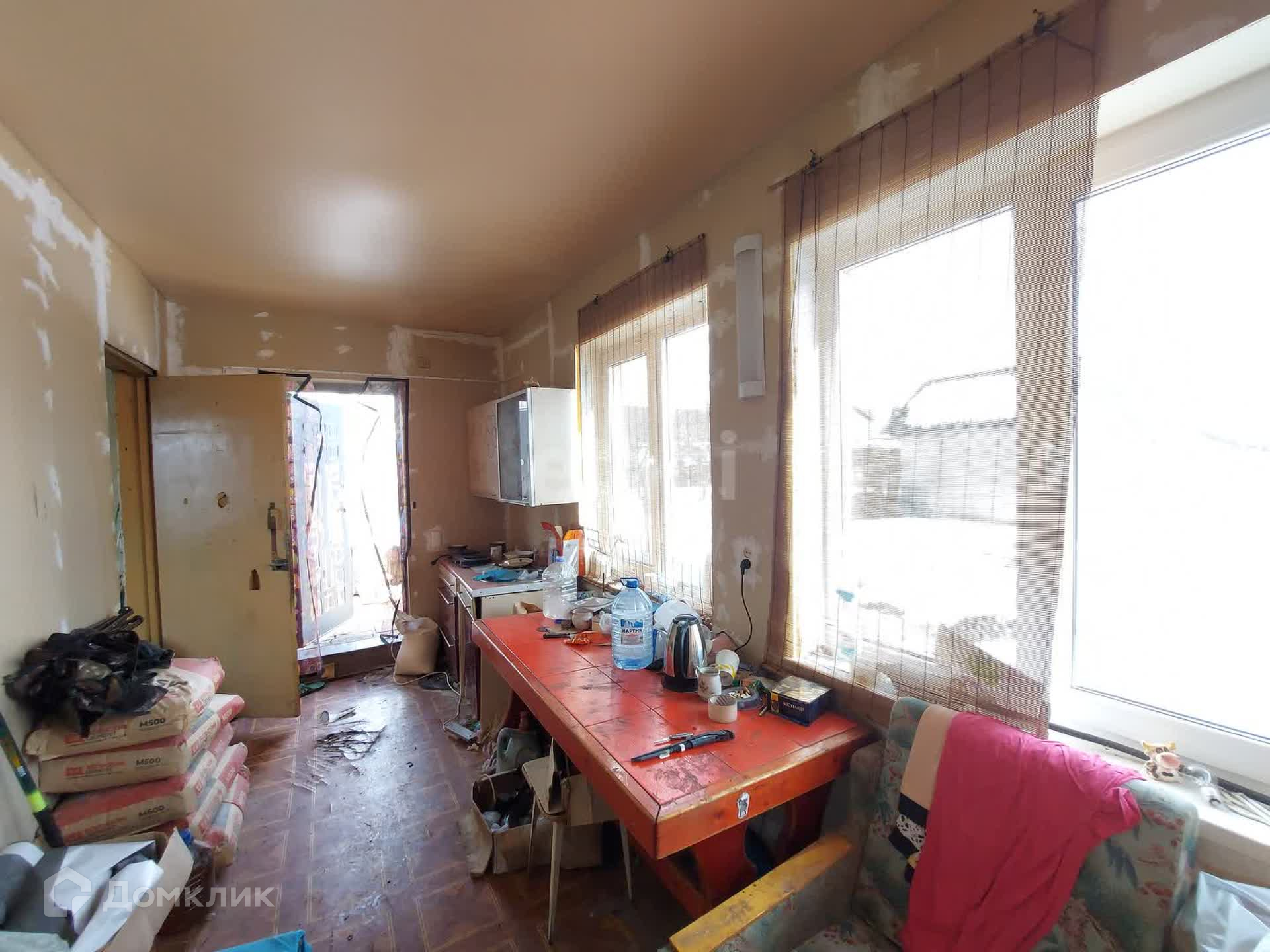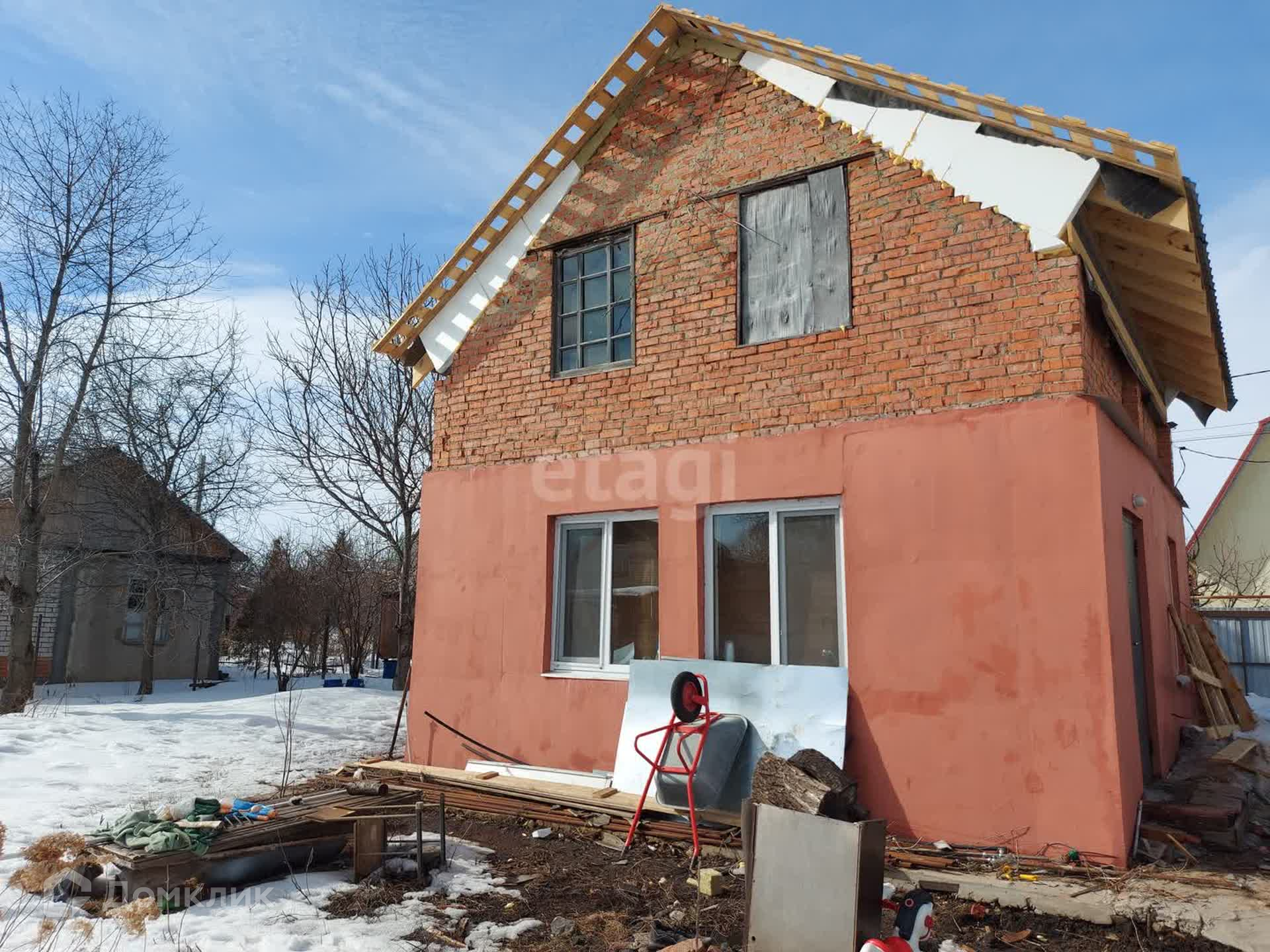 На первом этаже кухня и 2 равнозначные комнаты, второй этаж в свободной планировке, планировалась терраса с прямым выходом. На данным момент в доме произведены работы: заменена и утеплена крыша, установлены пластиковые окна и утеплен фасад на 1 этаже, заменена электро-проводка. Внутри дом готов к косметическому ремонту, стены выровнены, потолки в черновом виде. По договоренности можно оставить частично стройматериал для дальнейших ремонтных работ.