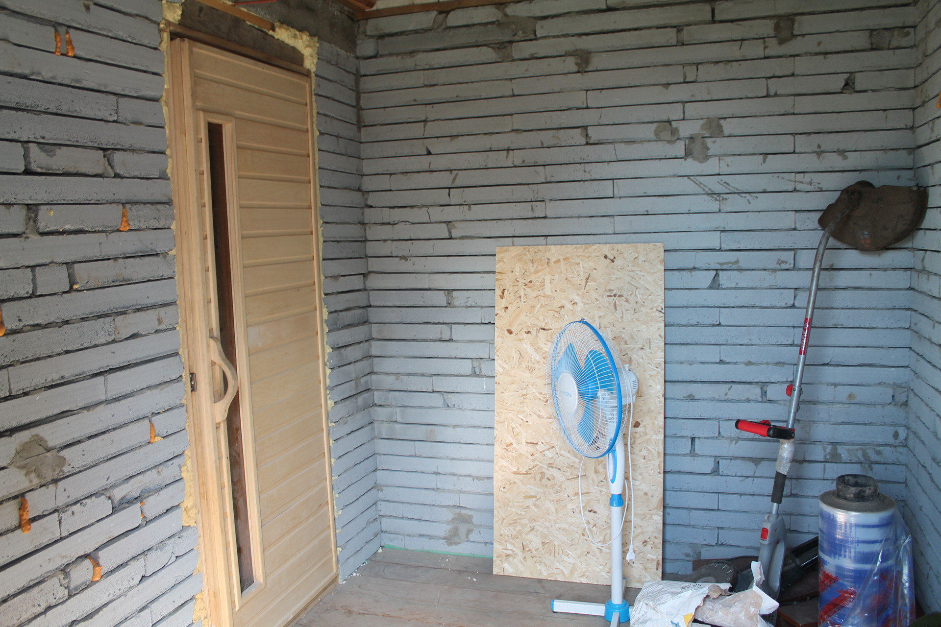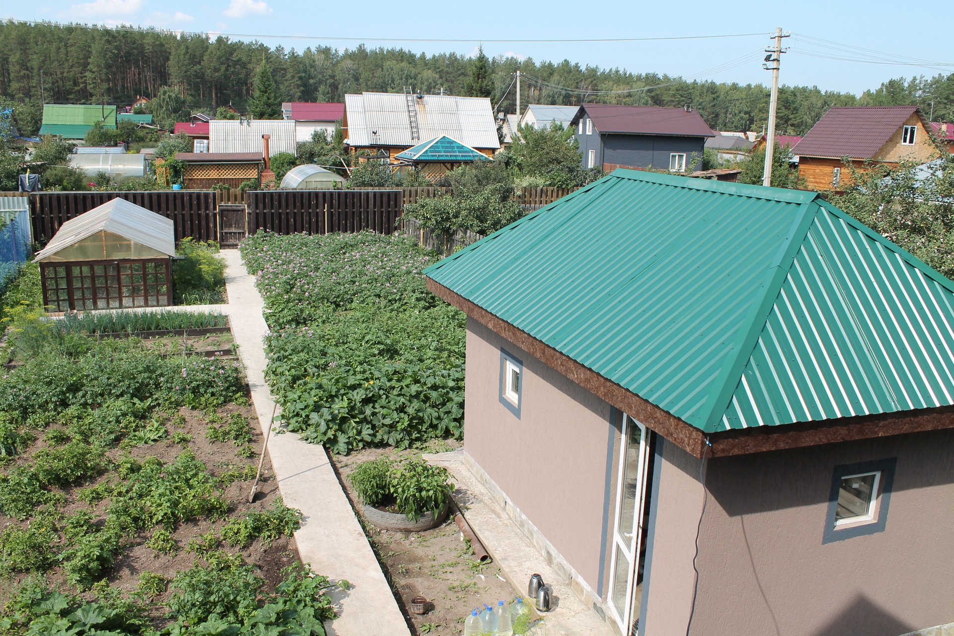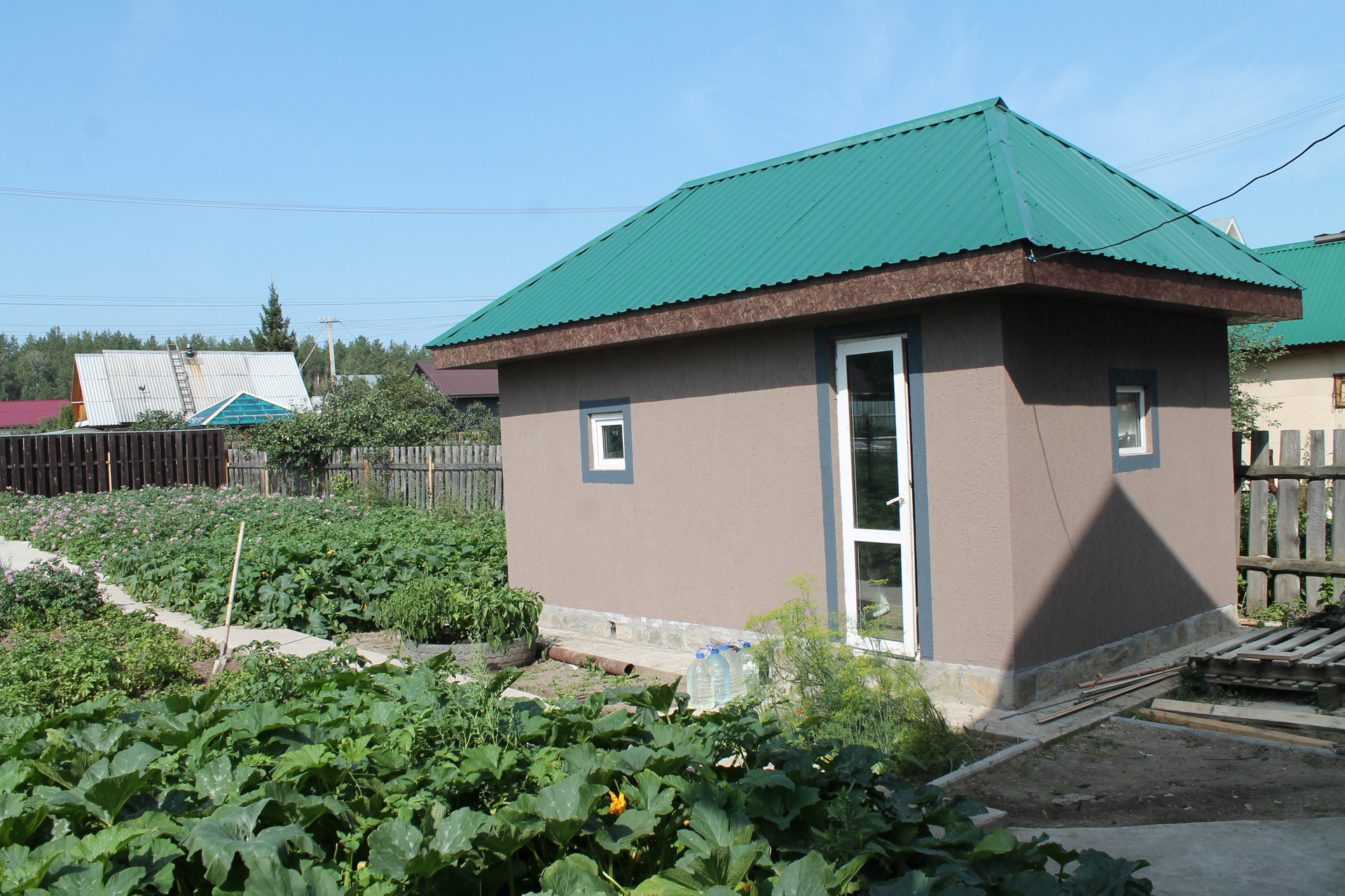 Есть баня из блоков, 5,5 х 3,2 кв. м., капитальная теплица.