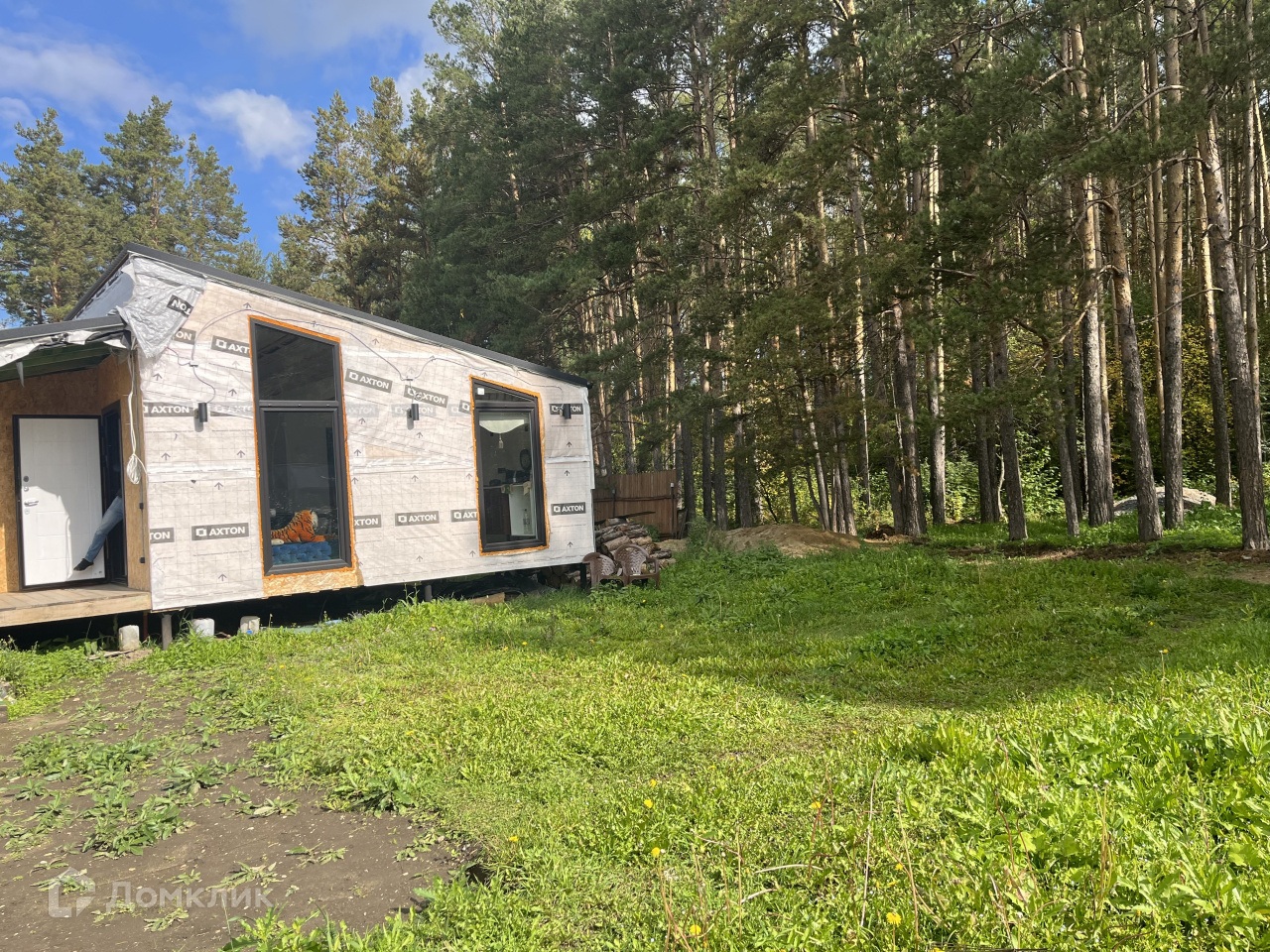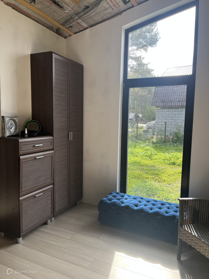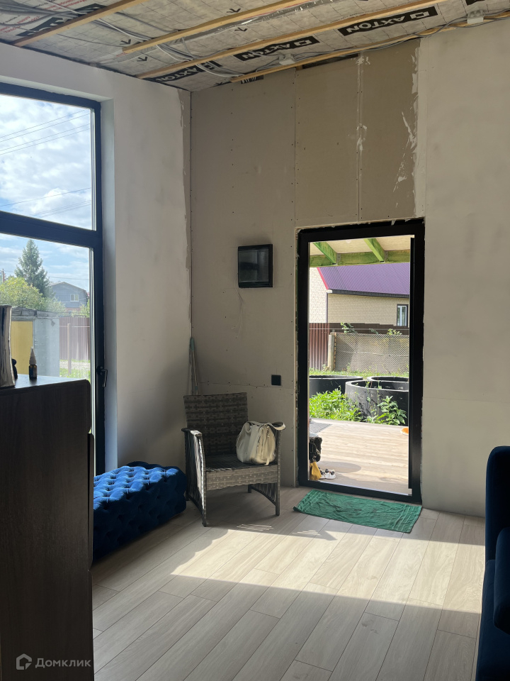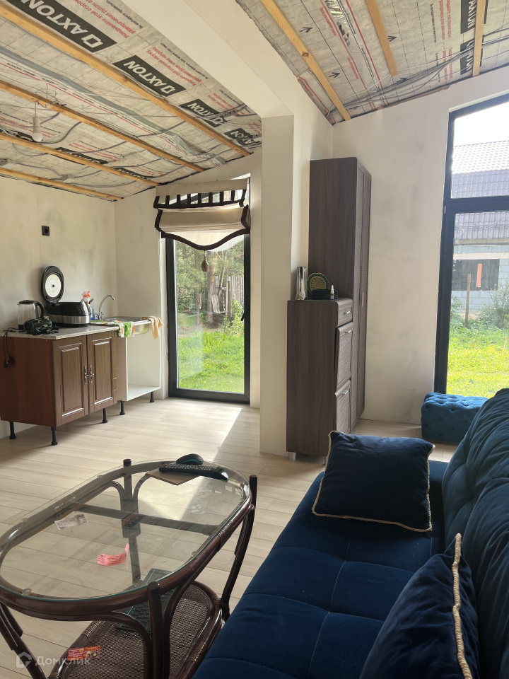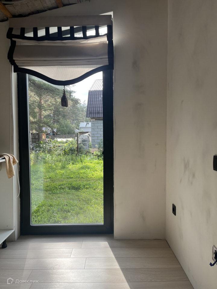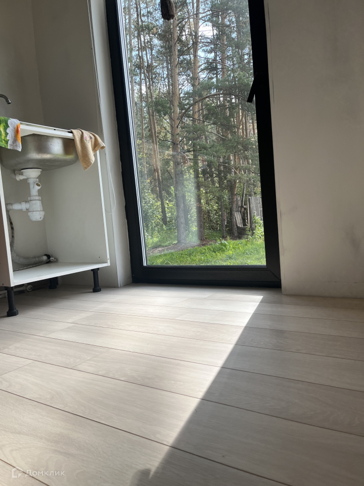 Дом на участке каркасный, кухня-столовая, спальня, гардеробная, санузел, окна панорамные, в пол, еще не успели пожить, ну и доделать кое-что тоже необходимо.