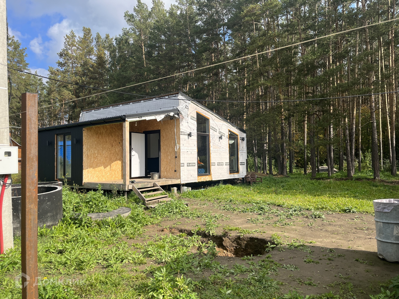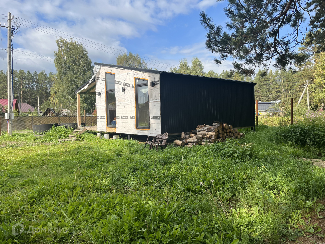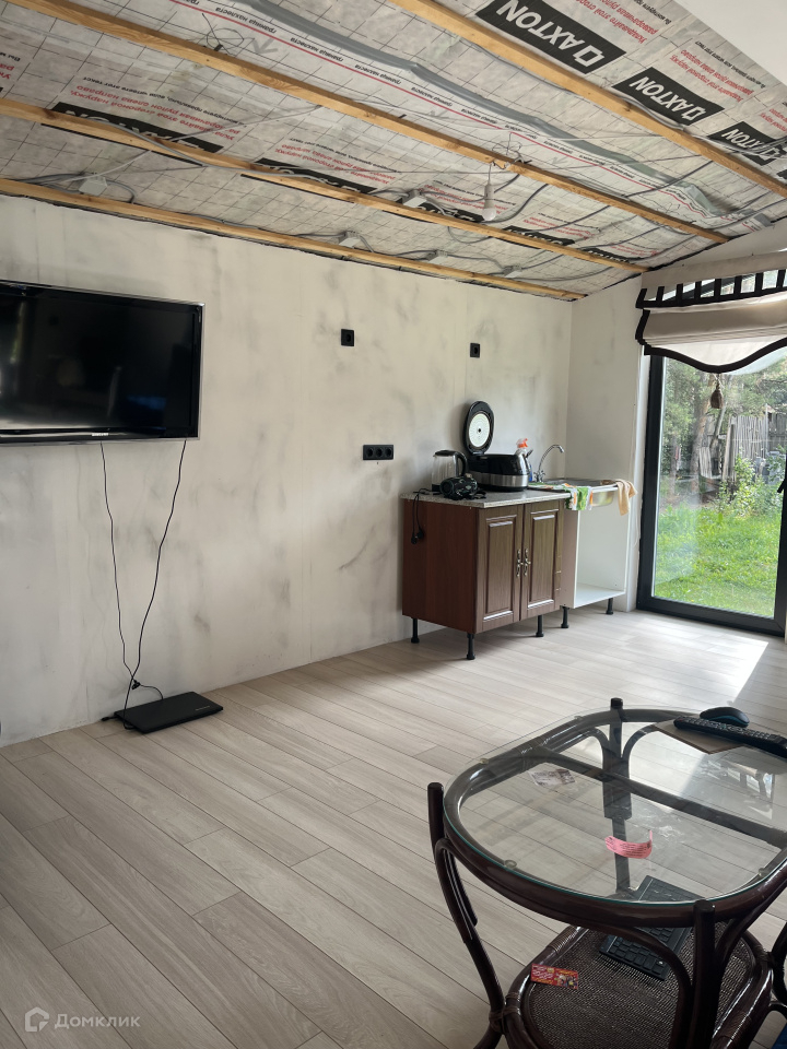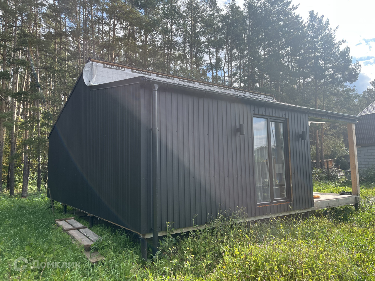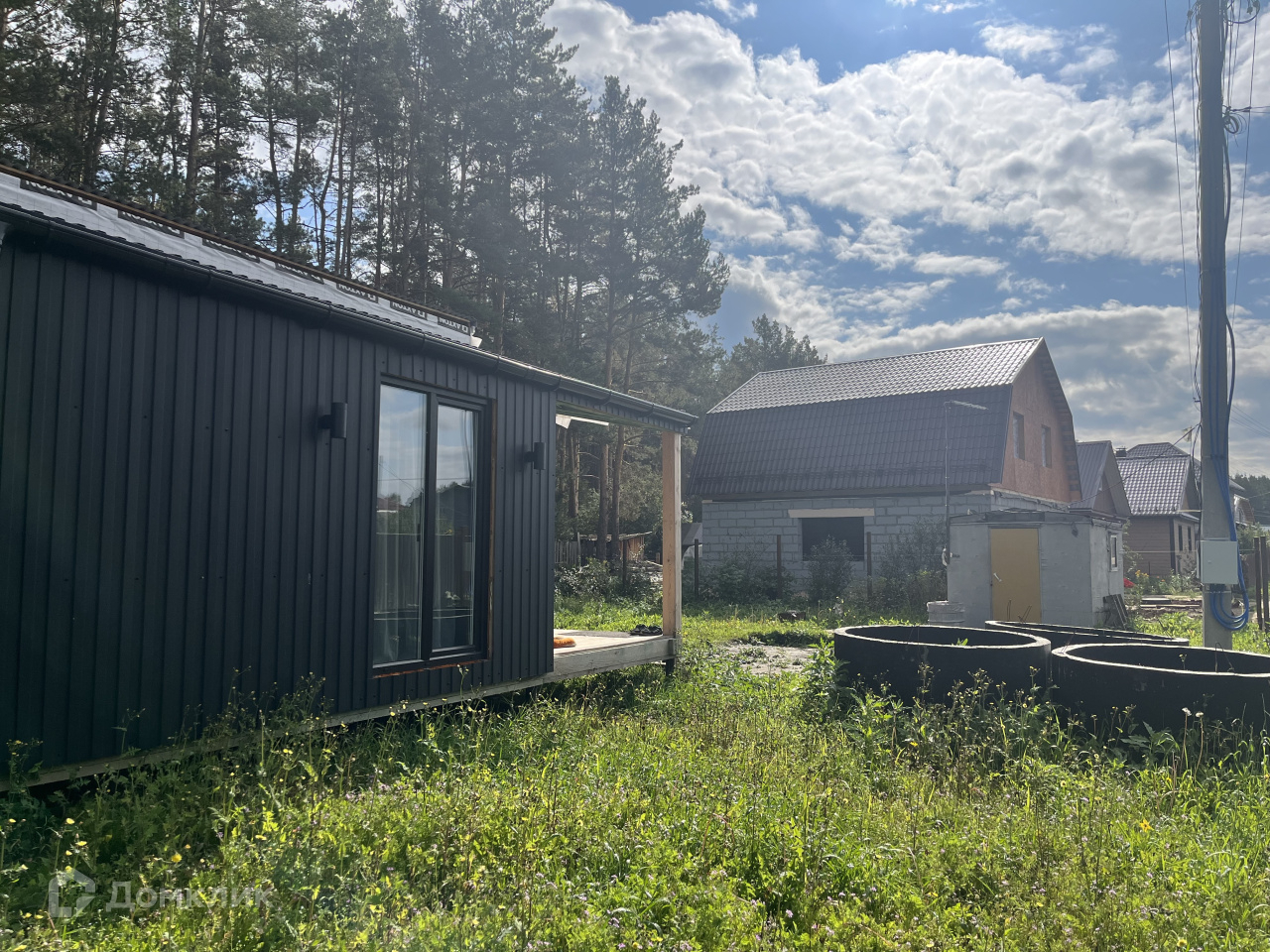Дом на участке каркасный, кухня-столовая, спальня, гардеробная, санузел, окна панорамные, в пол, еще не успели пожить, ну и доделать кое-что тоже необходимо.