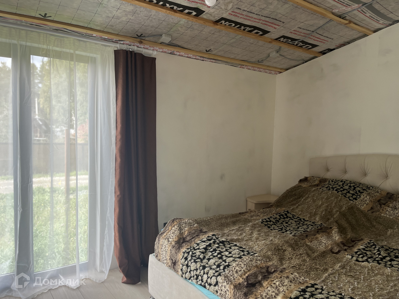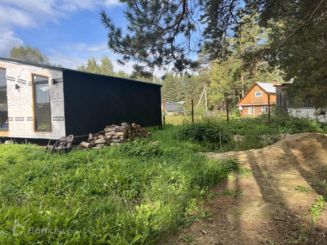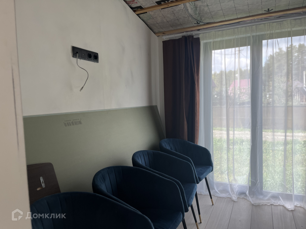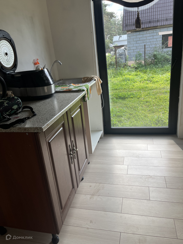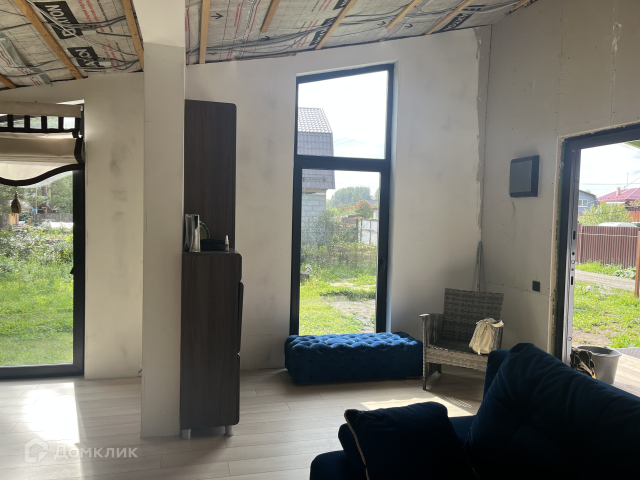 Дом на участке каркасный, кухня-столовая, спальня, гардеробная, санузел, окна панорамные, в пол, еще не успели пожить, ну и доделать кое-что тоже необходимо.