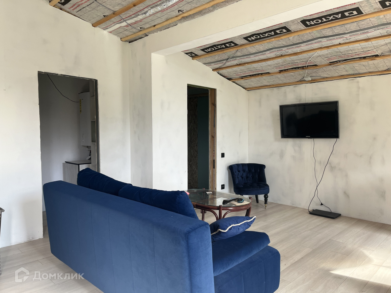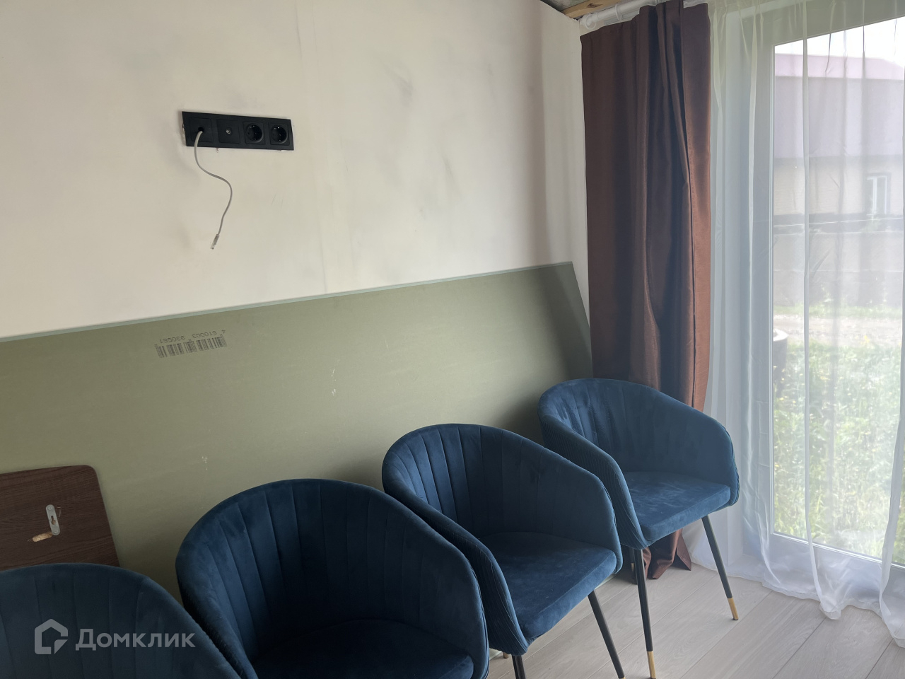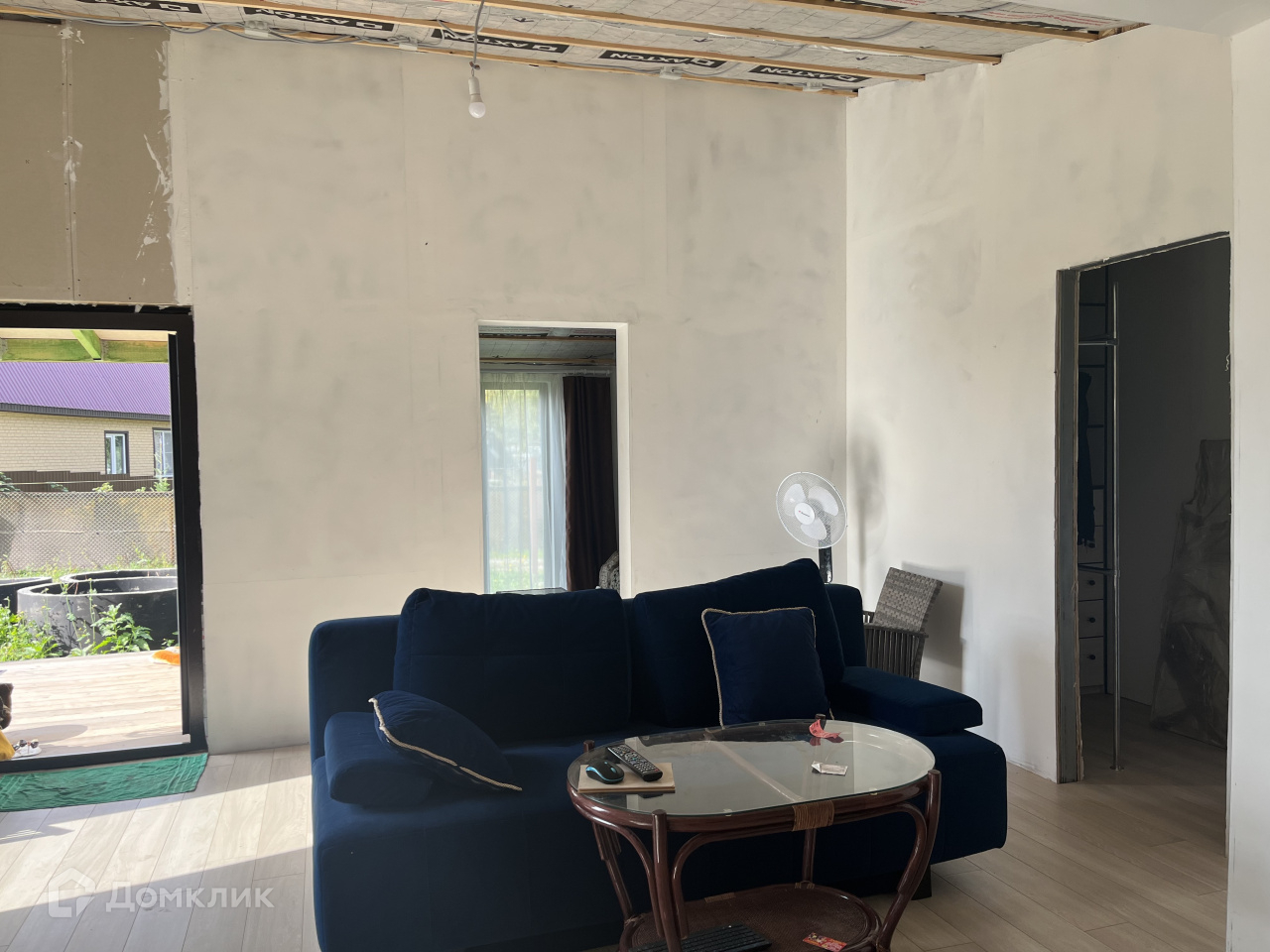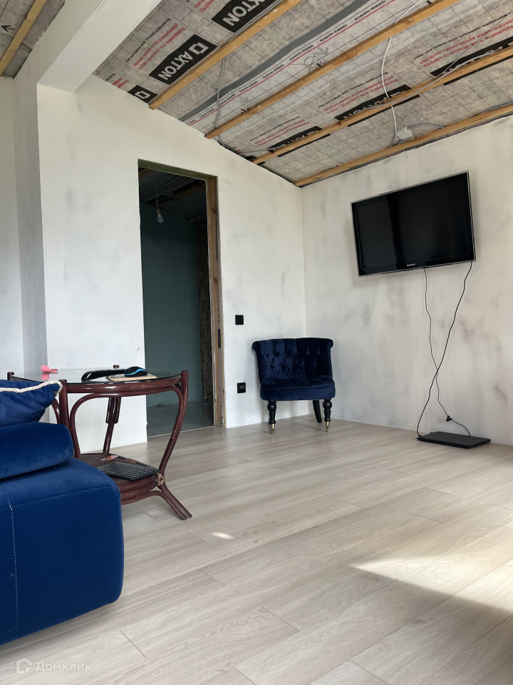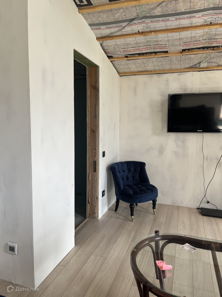 Дом на участке каркасный, кухня-столовая, спальня, гардеробная, санузел, окна панорамные, в пол, еще не успели пожить, ну и доделать кое-что тоже необходимо.