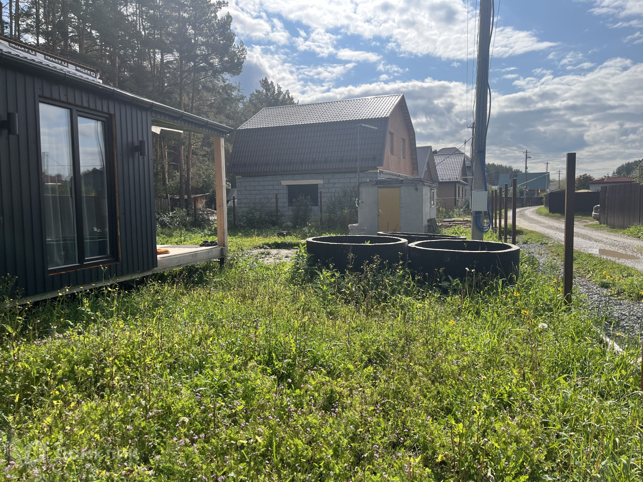 Водоотведение- закопаны три кольца, объем 6 кубов, но вывод из дома не сделан. Фасад с двух сторон сделан, а с двух сторон планировали обшить доской.