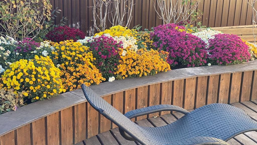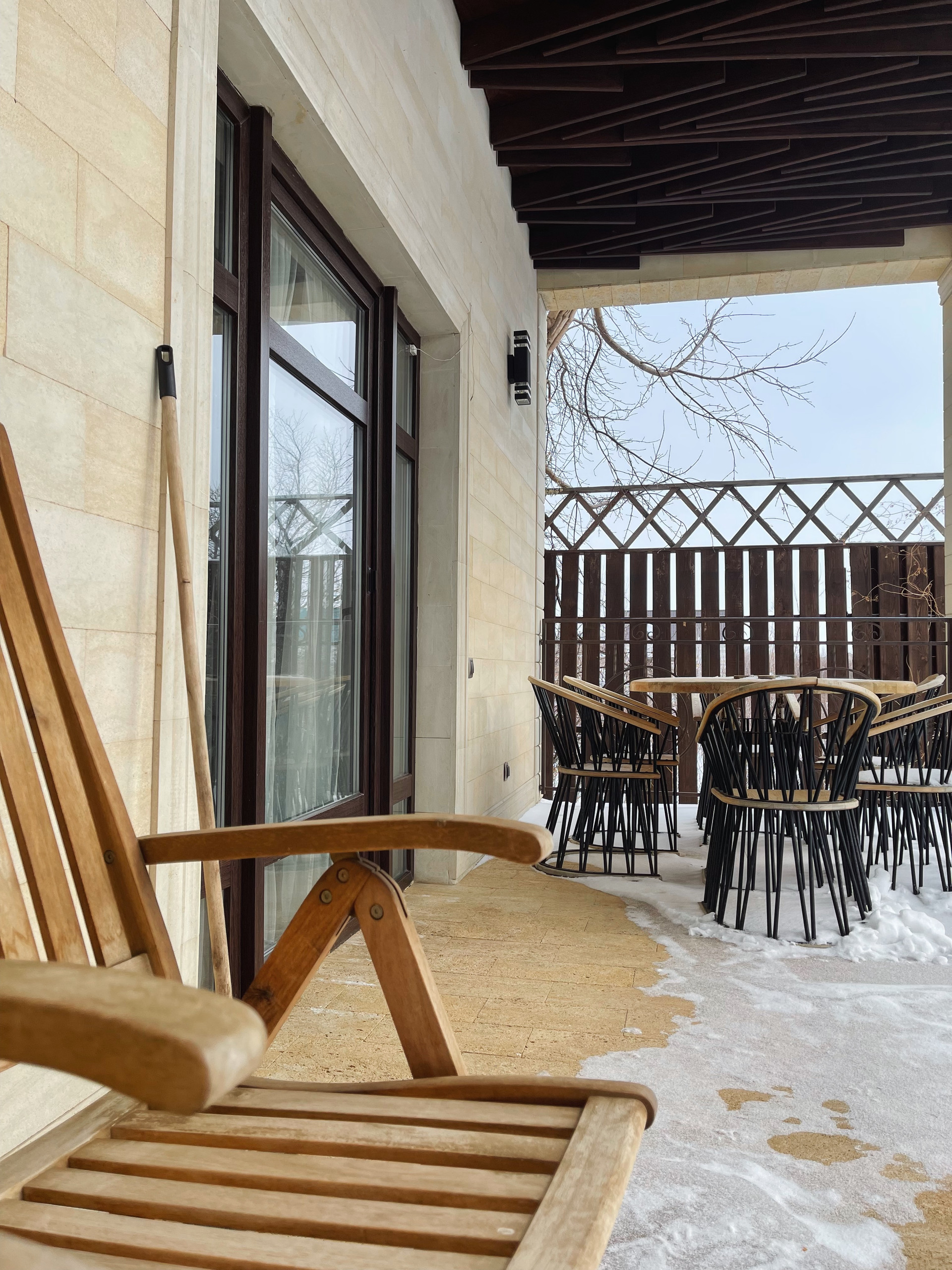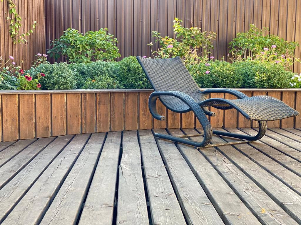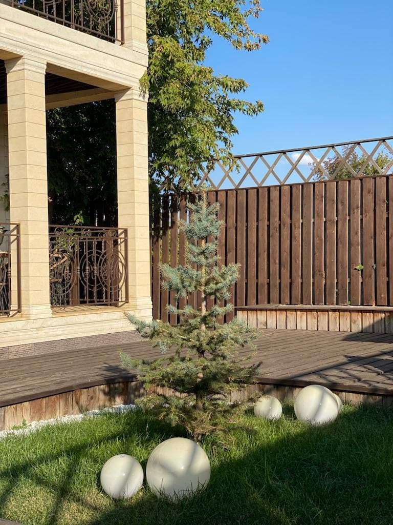 Помимо каменной террасы, на которую есть прямой выход с кухни, на заднем дворе расположена деревянная терраса (террасная доска - лиственница).
