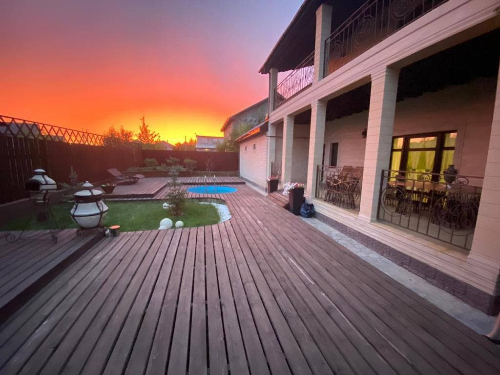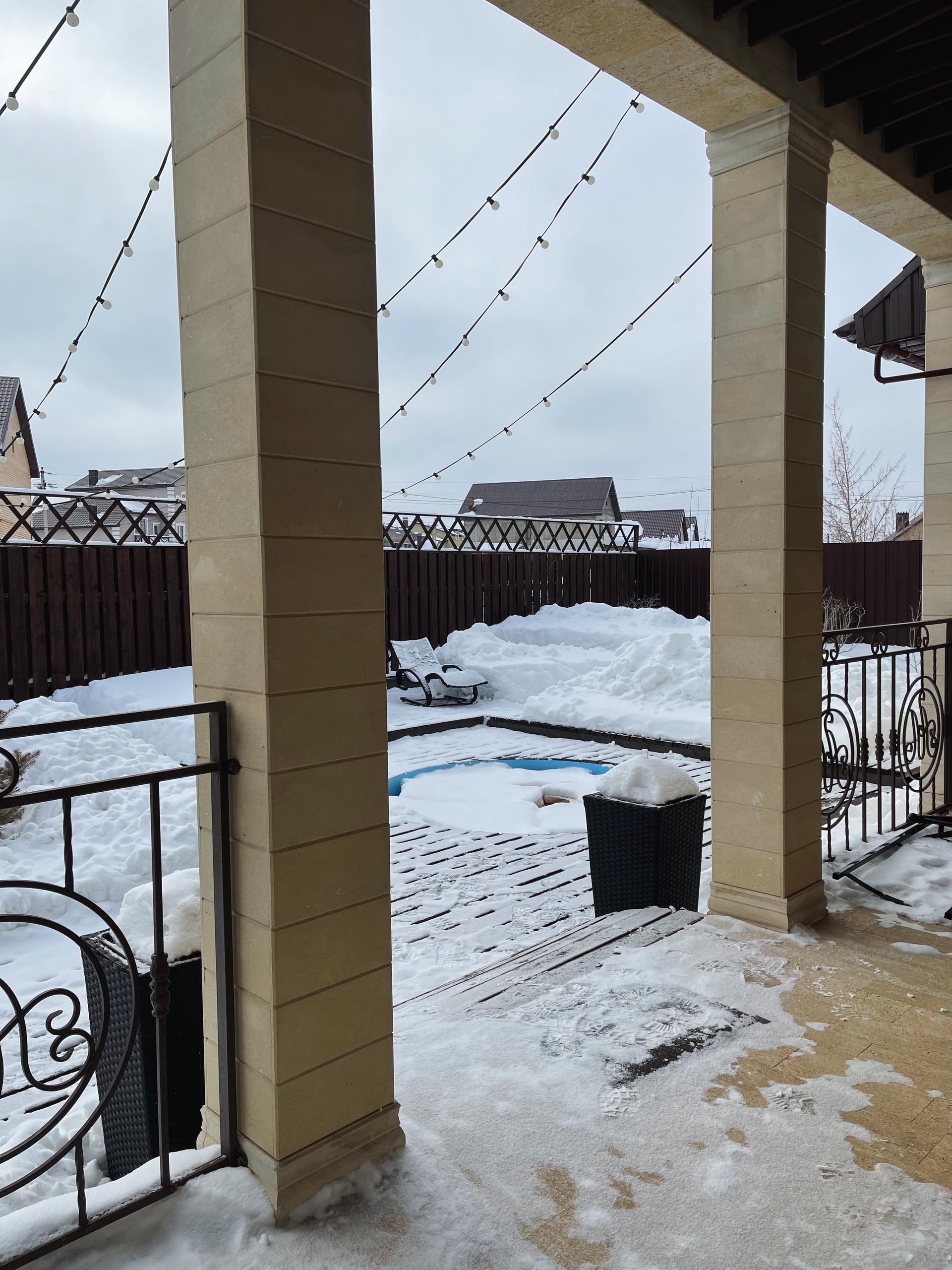 Встроен подогреваемый бассейн, диаметр 2.5м, глубина - 1.5 м., с возможностью круглогодичного использования.