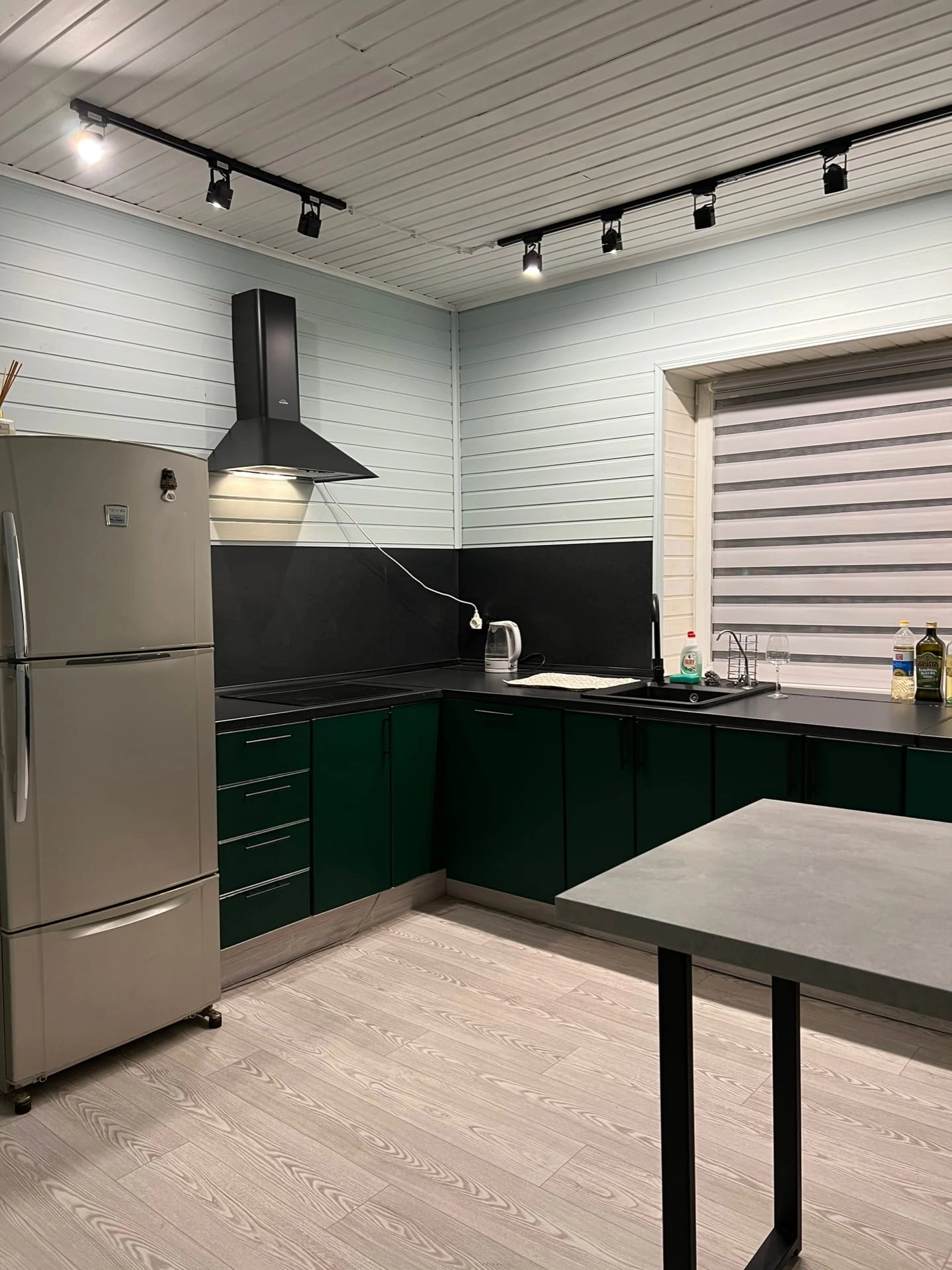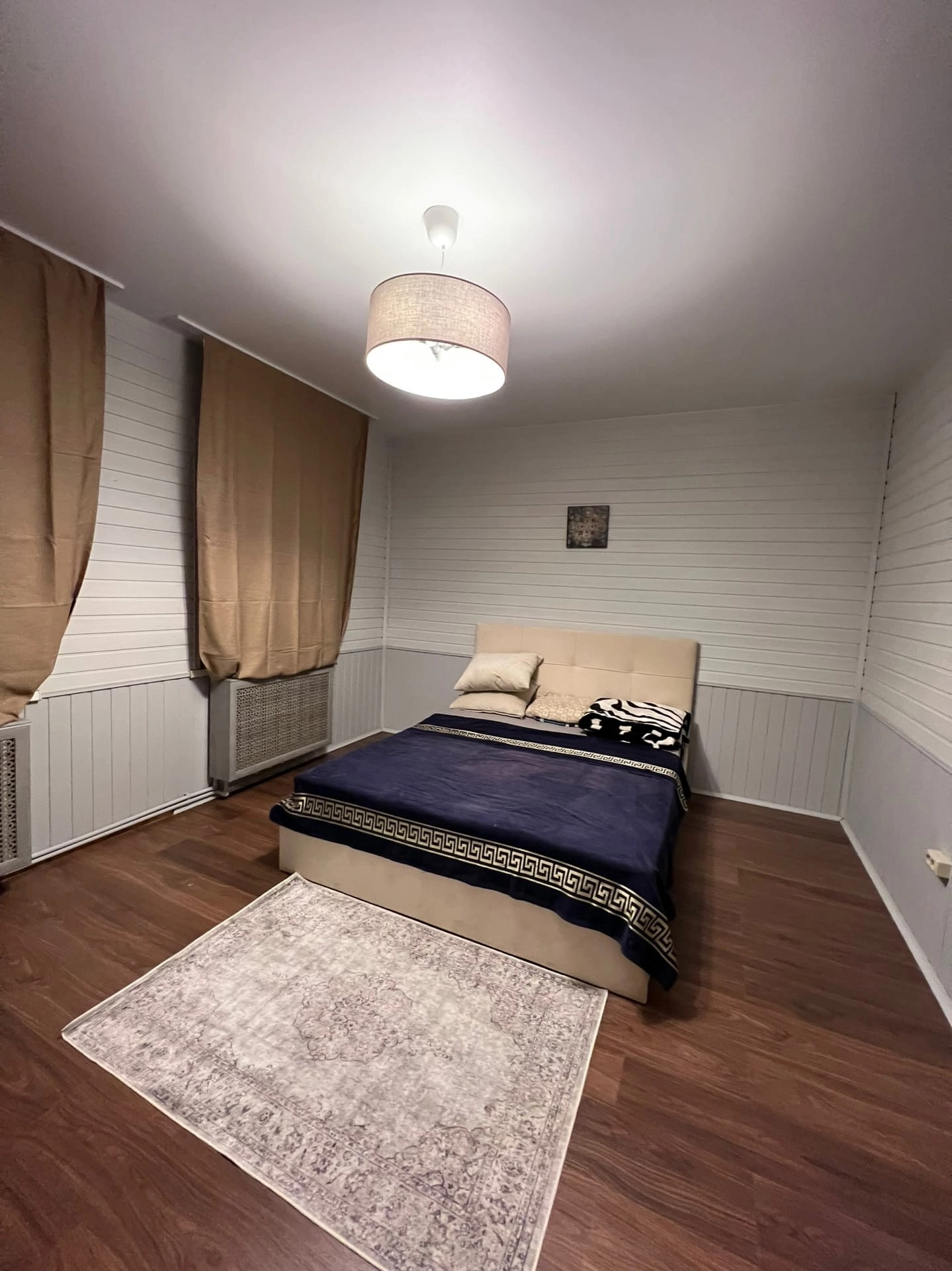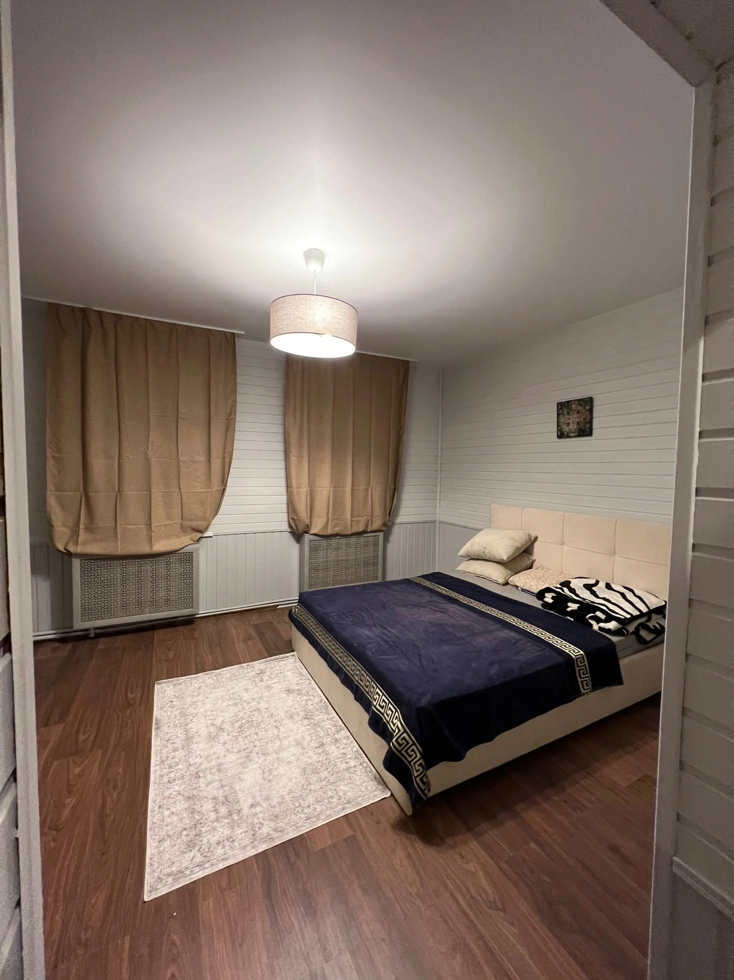 190 м2- 4 спальни( три на втором этаже и одна на первом,имеется меблированная детская Комната ), 2 санузла с душем( тёплый пол), гостиная с функционирующей печью и новой мебелью, кухня с тёплым полом,с встроенной посудомоечной машинкой, духовкой и электрической плитой, так же имеется вся бытовая мелочь( пароварка, блендер, мясорубка)