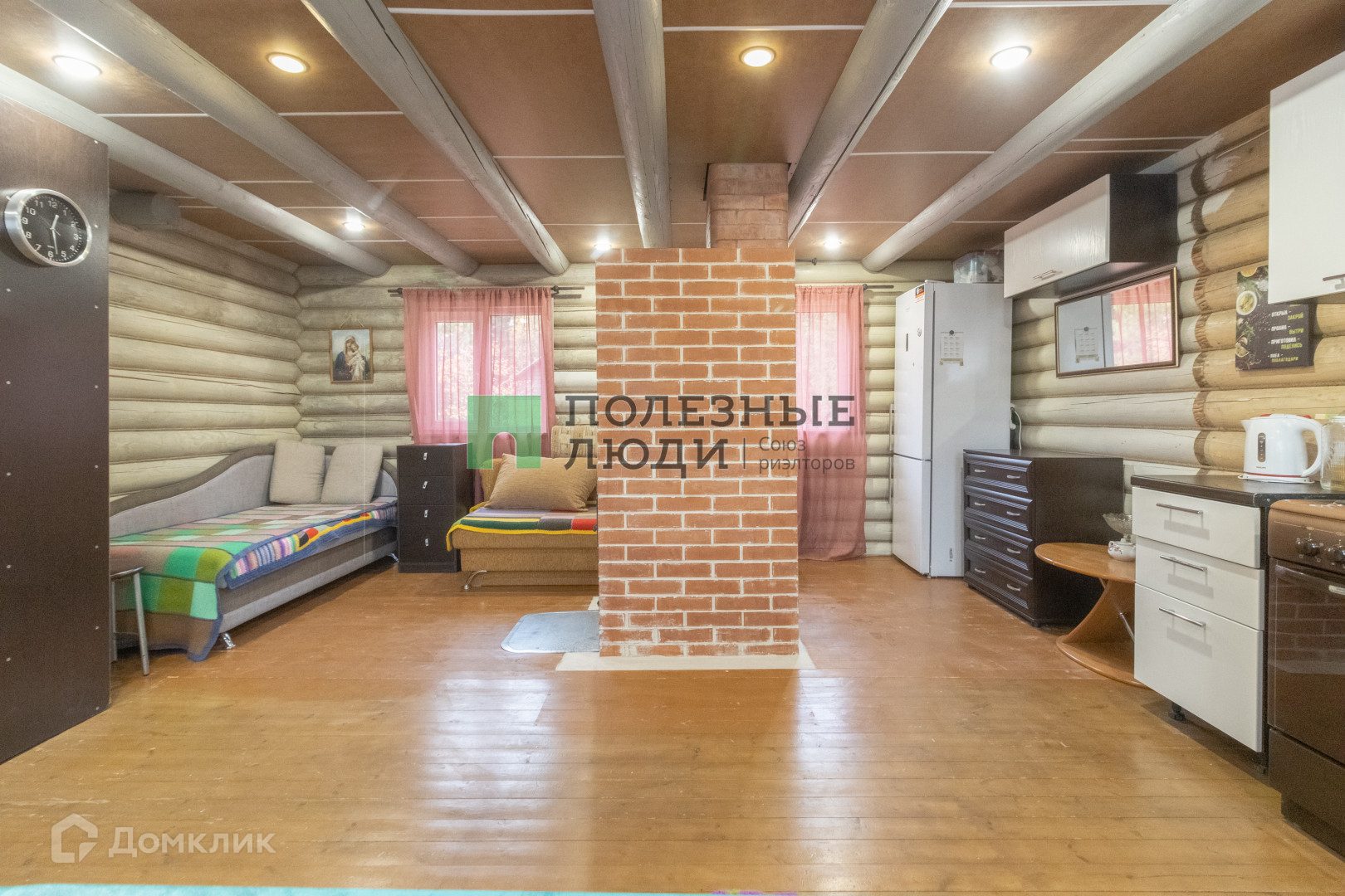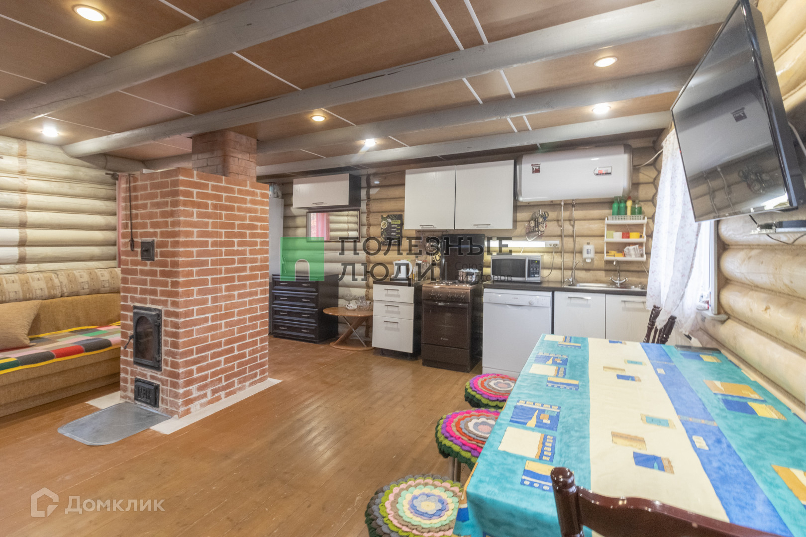 Двухэтажный дом 71 м.кв., из оцилиндрованного бревна, предусмотрен для круглогодичного проживания. На первом этаже расположена кухня-гостиная 30 м.кв., с печью, мебелью и техникой.