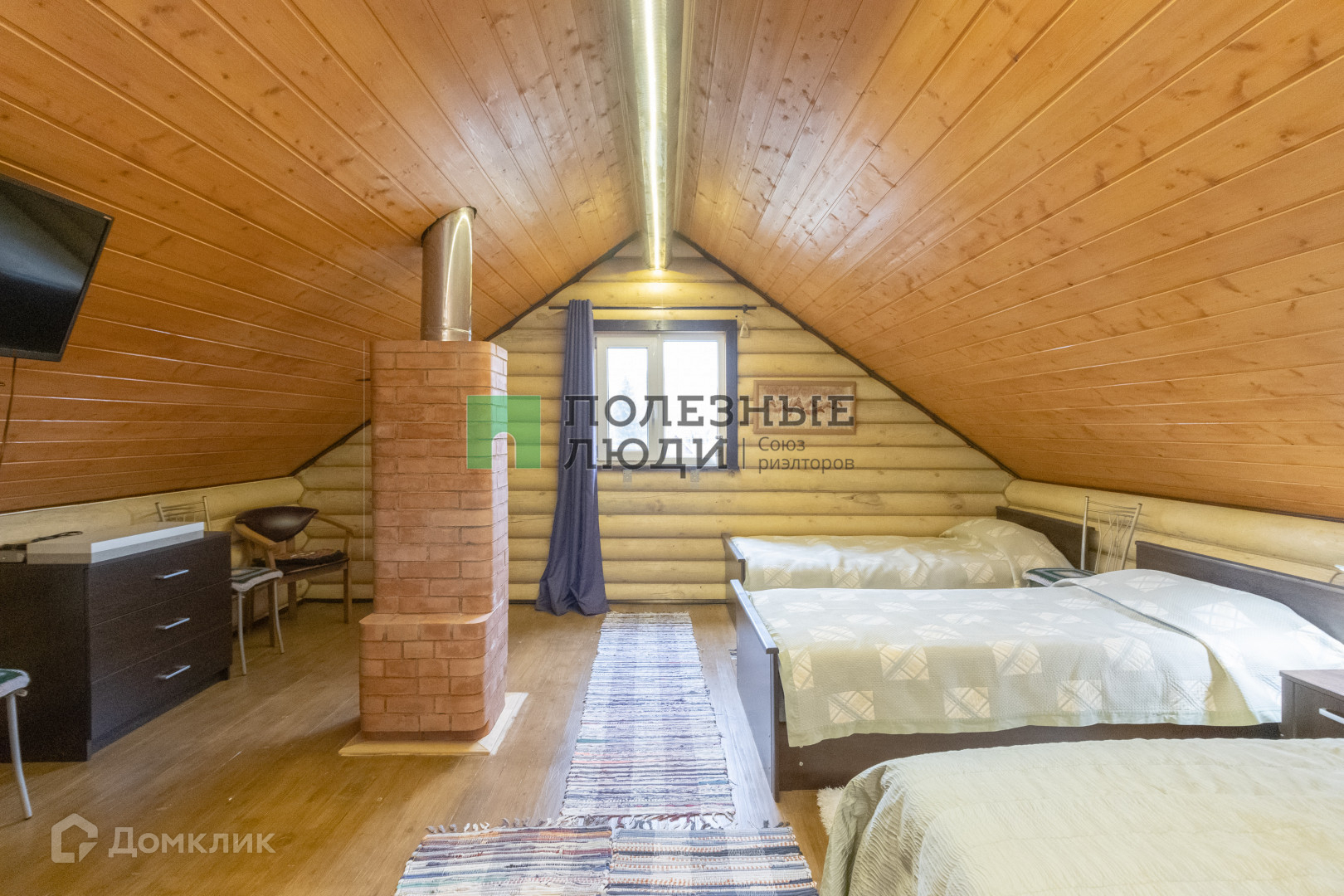На втором этаже находится уютная спальня 30 м.кв., с тремя кроватями и комодом, при желании можно разместить дополнительные спальные места. Крыльцо дома и балкон остеклены, электричество на 15 Квт.