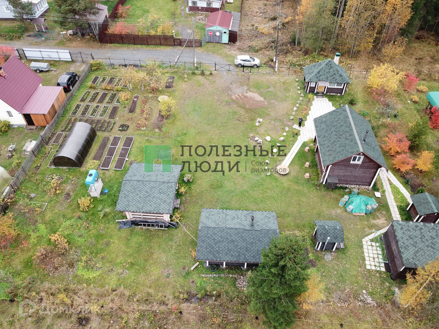 Участок большой, ухоженный, есть грядки, теплица, плодовые кусты и деревья.