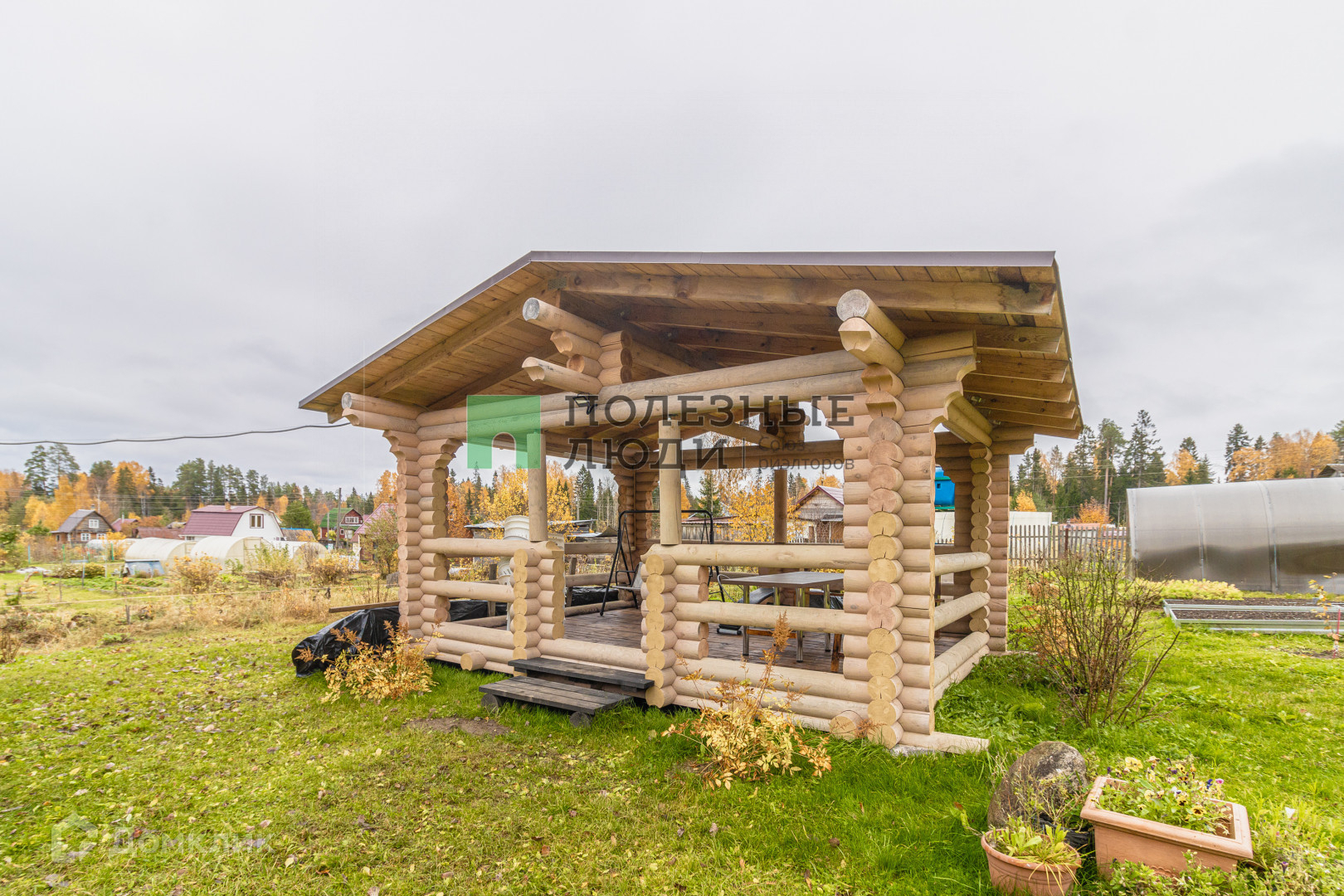 Ещё в комплекс входит небольшой уютный гостевой дом 17 м.кв., с большой русской печью со встроенным мангалом двумя диванами и местом для готовки. В центре участка бревенчатая беседка с большим столом, освещением и качелями.