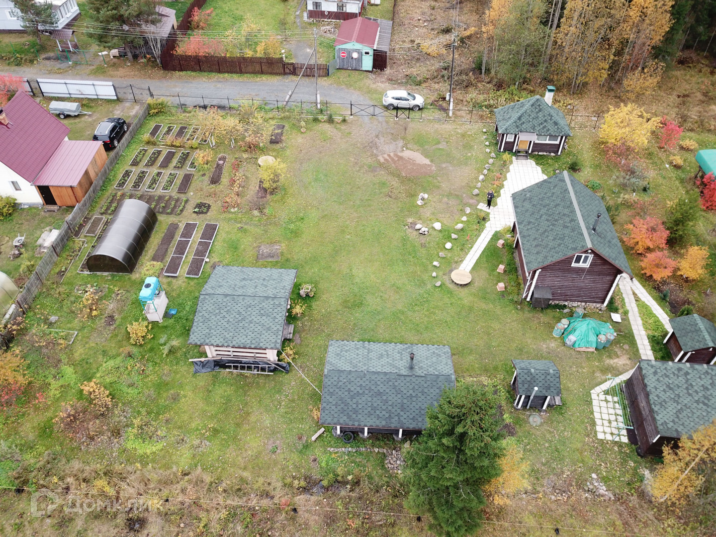 Участок большой, ухоженный, есть грядки, теплица, плодовые кусты и деревья.