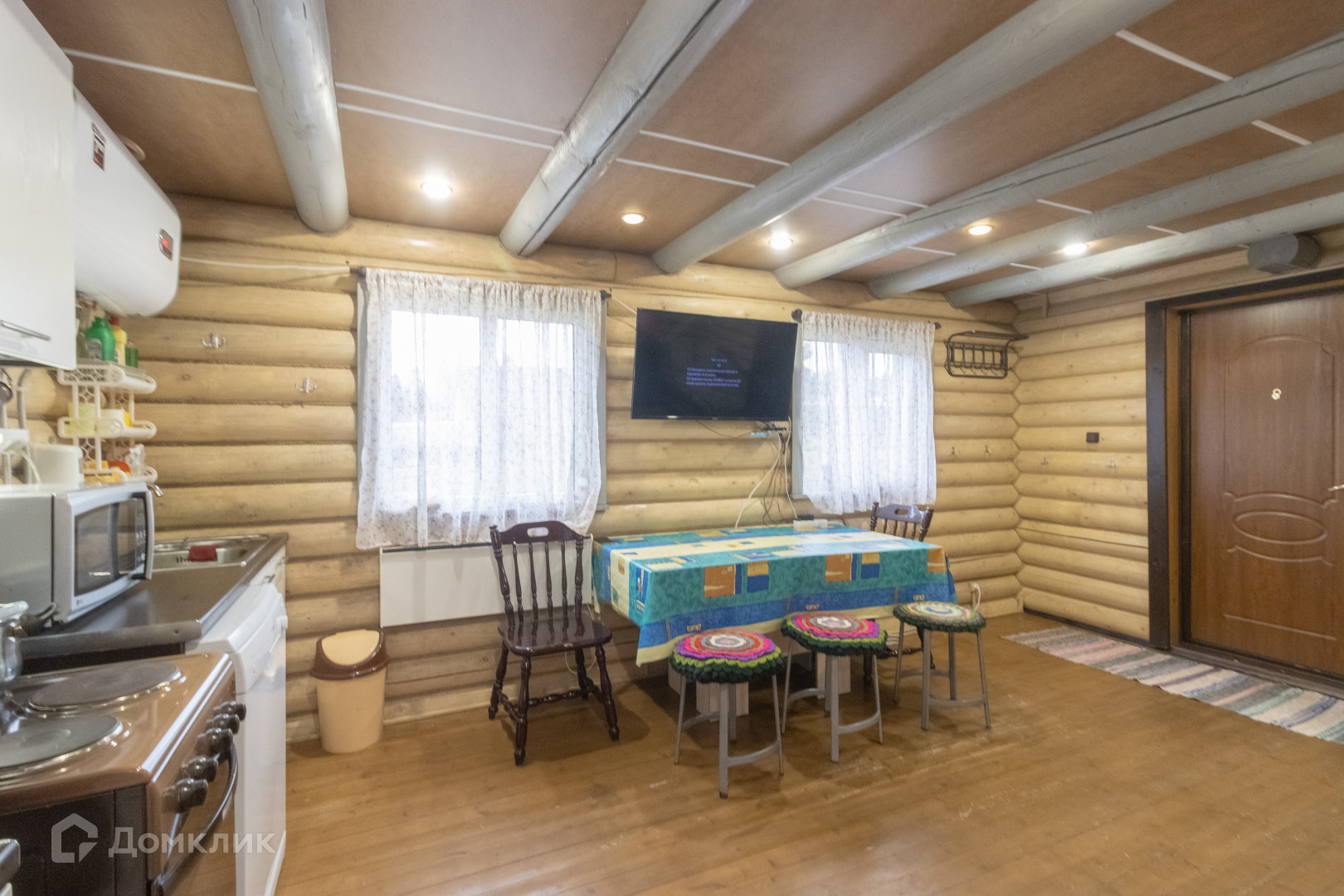 Двухэтажный дом 71 м.кв., из оцилиндрованного бревна, предусмотрен для круглогодичного проживания. На первом этаже расположена кухня-гостиная 30 м.кв., с печью, мебелью и техникой.