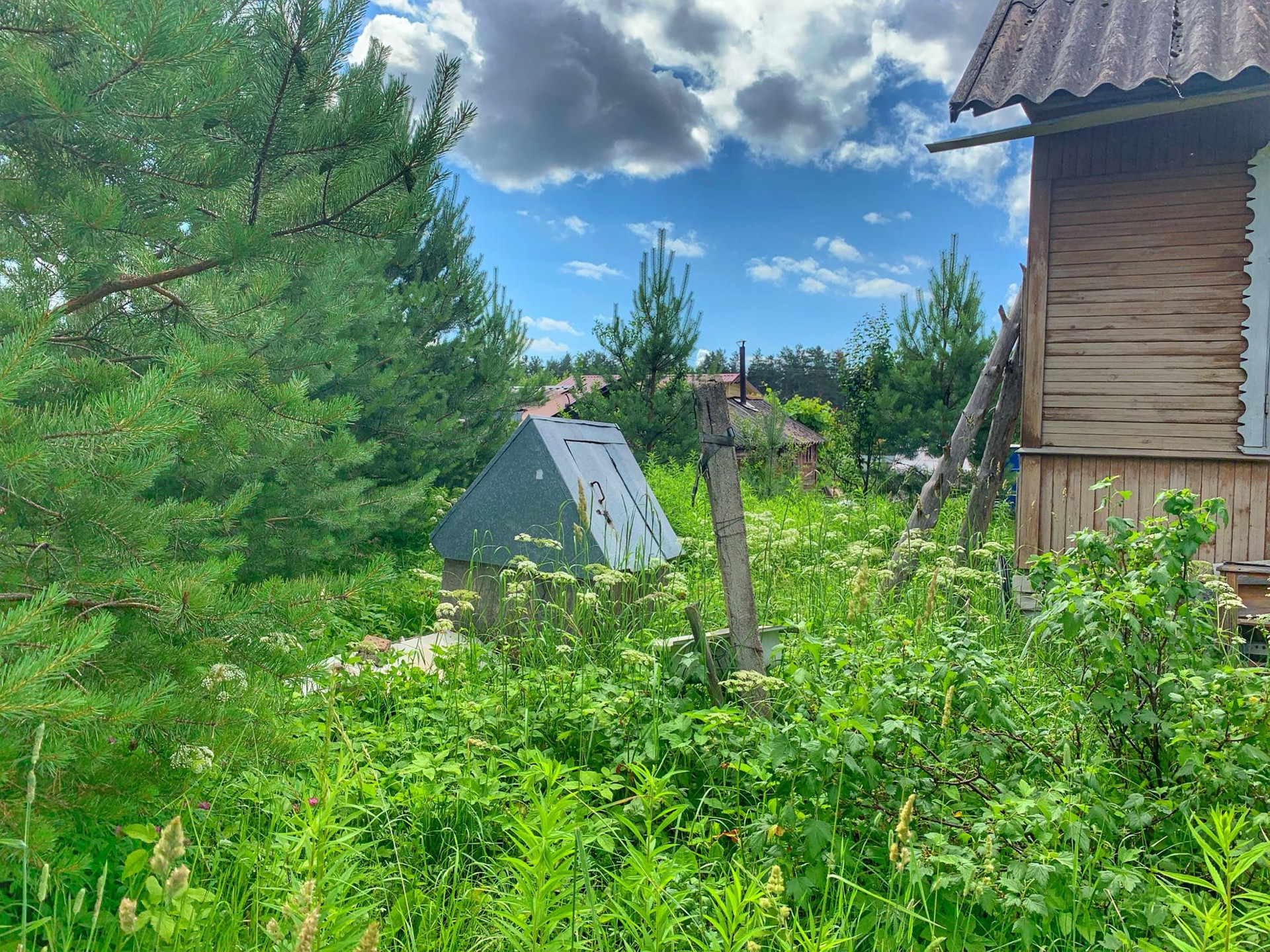 На участке высажены шесть декоративных сосен, привезенных из питомника. Из хозпостроек присутствует туалет и сарай.
