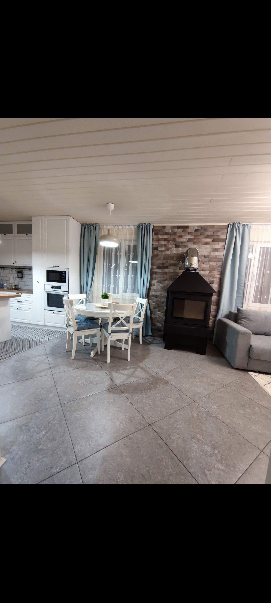 Огромная Зал-гостиная совмещенная с  кухней и столовой объединяют всех членов семьи у ютного камина на дровах.