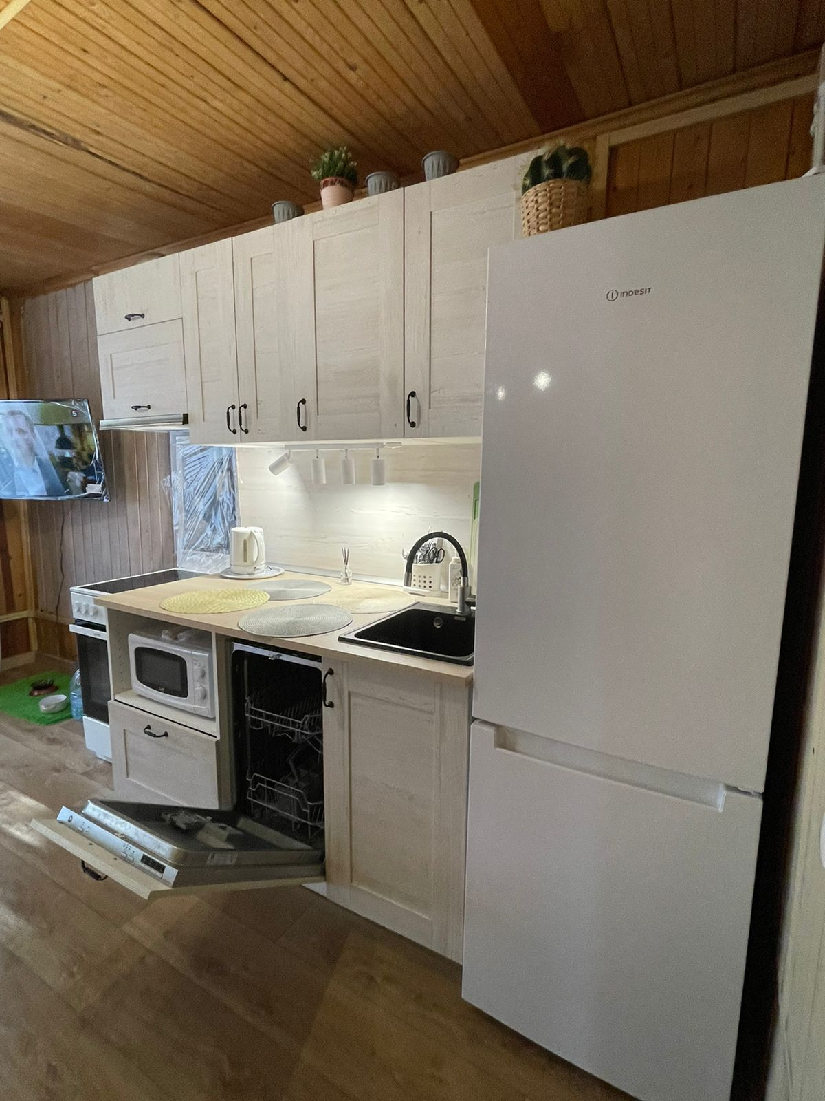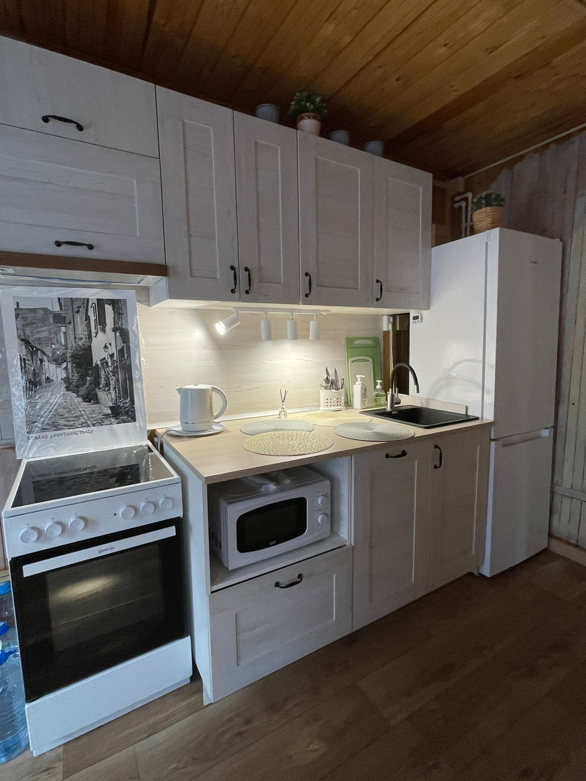 Первый этаж большая кухня-гостиная (24 кв.м.) оснащена современной техникой (холодильник NoFrost, посудомоечная машина, печь Gorenje с духовкой, вытяжка), комната с камином (21 кв.м.), прихожая, санузел, коридор с лестницей, веранда.