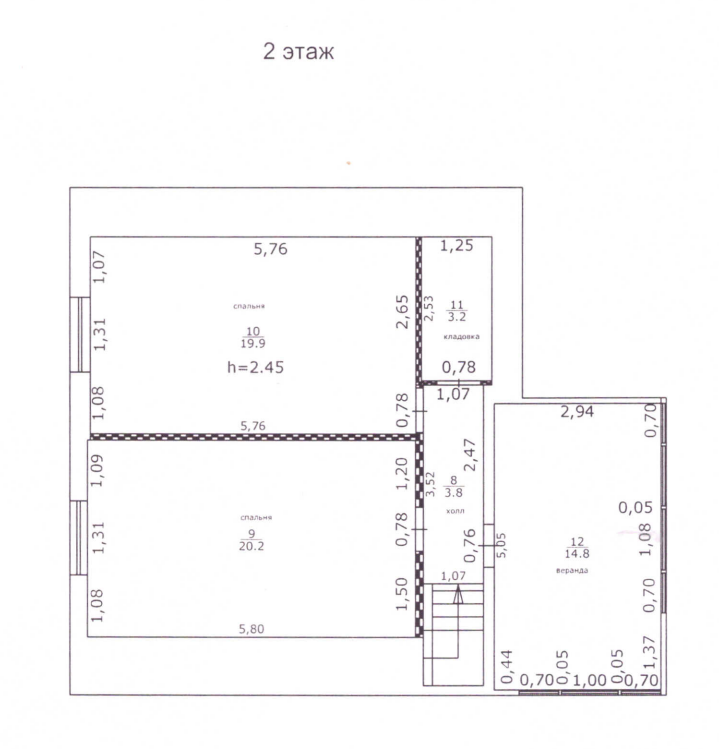 Второй этаж две спальни (21 и 22 кв.м.), летняя веранда (20 кв.м.), коридор, санузел.