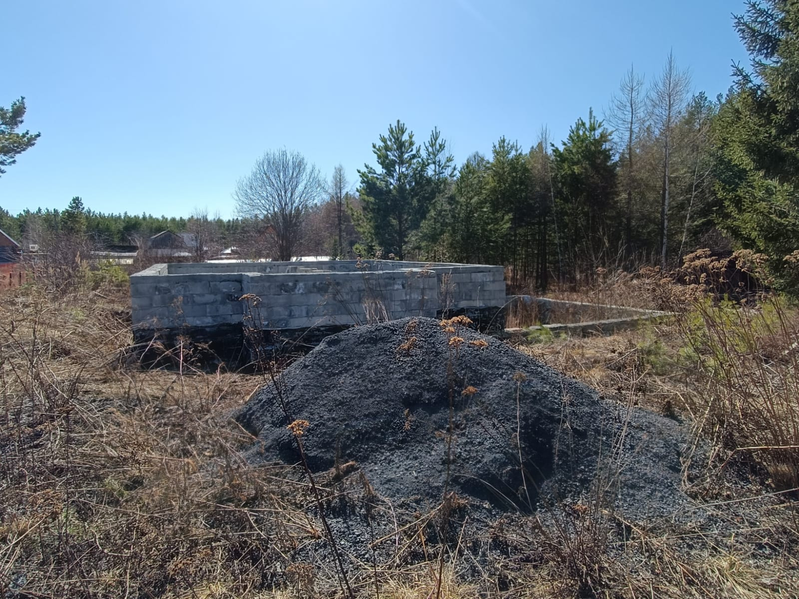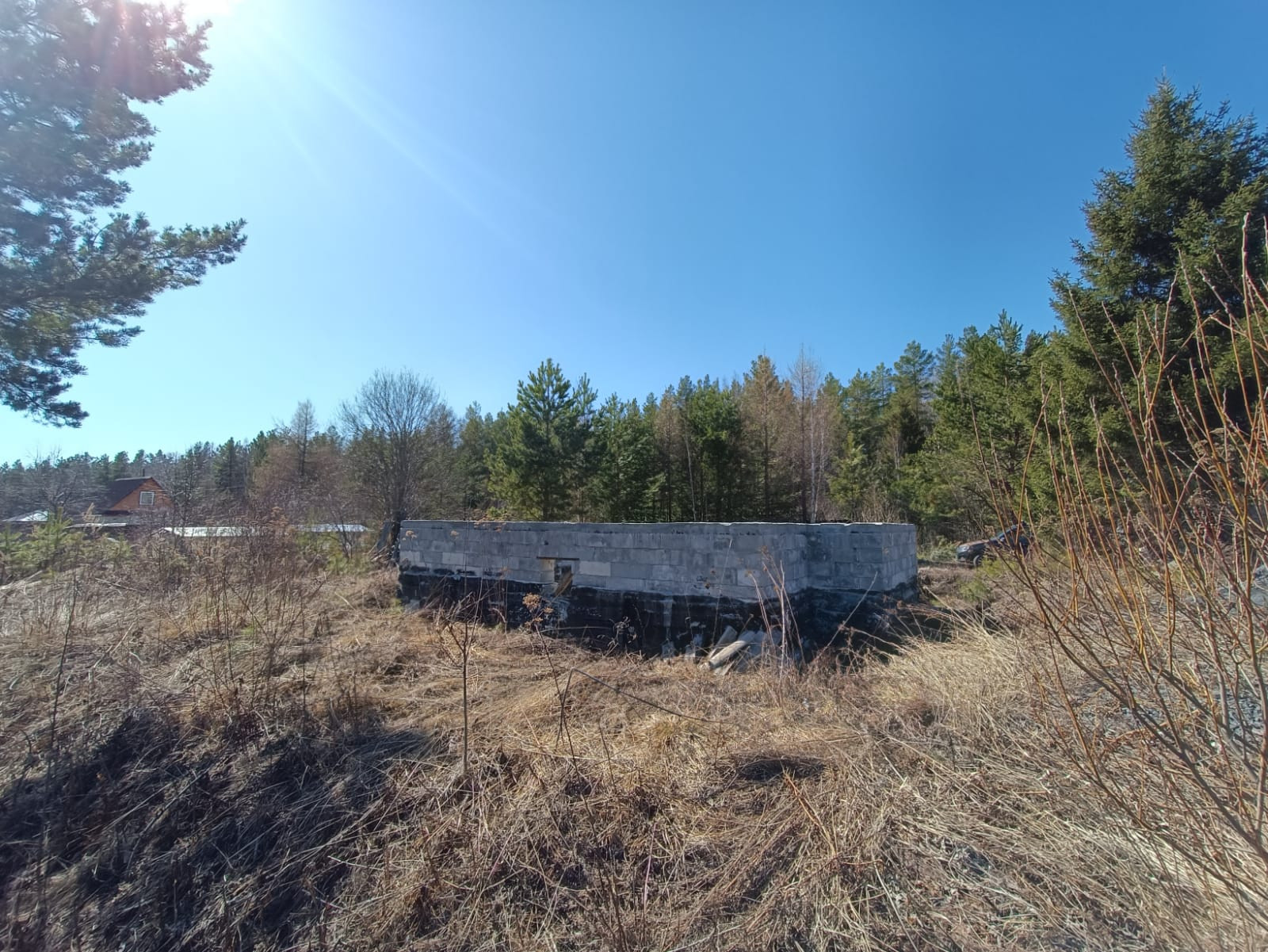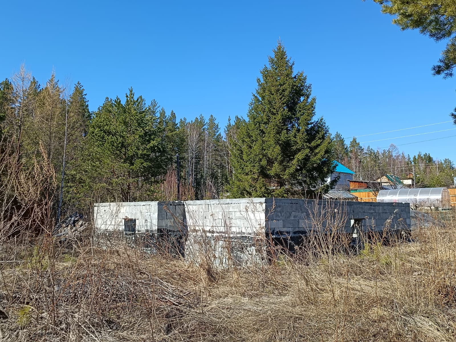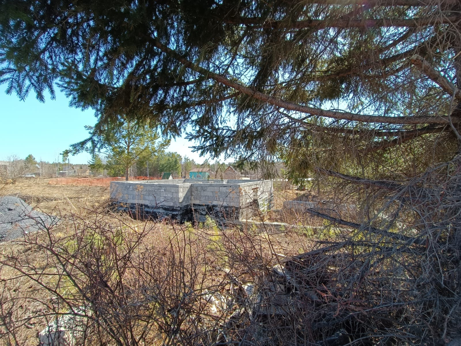 Продам участок с готовым ленточным  фундаментом 6*8 метров, высотой 1,5 метра, под жилой дом и с основанием для гаража, высотой 0,5 метра вокруг фундамента. Дом начали класть несколько рядов.  Сделан дренаж ,есть сарай под инструменты, участок не разработан.