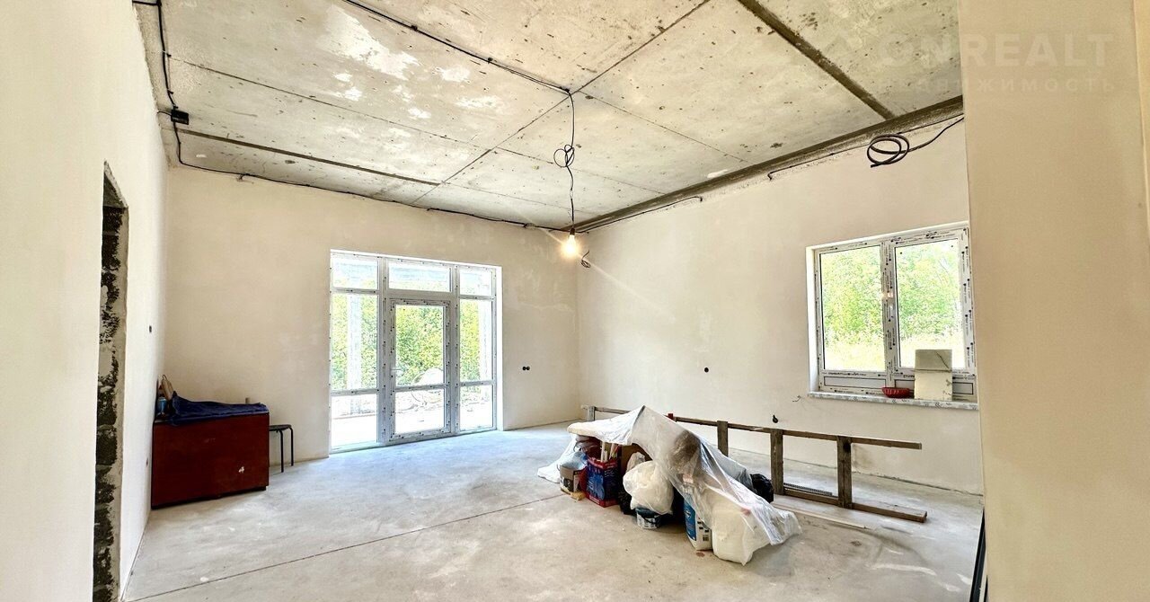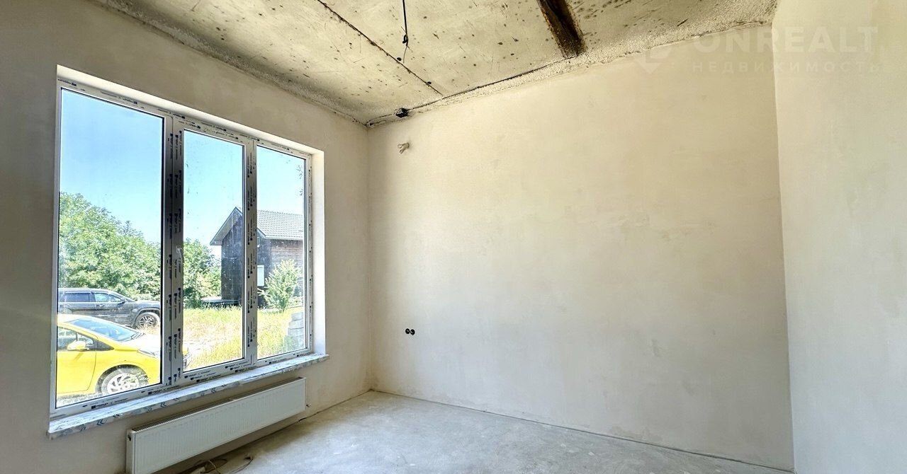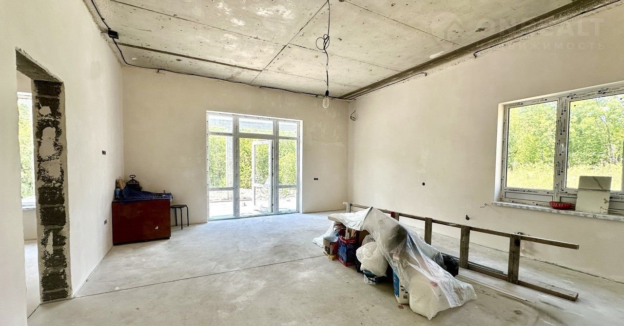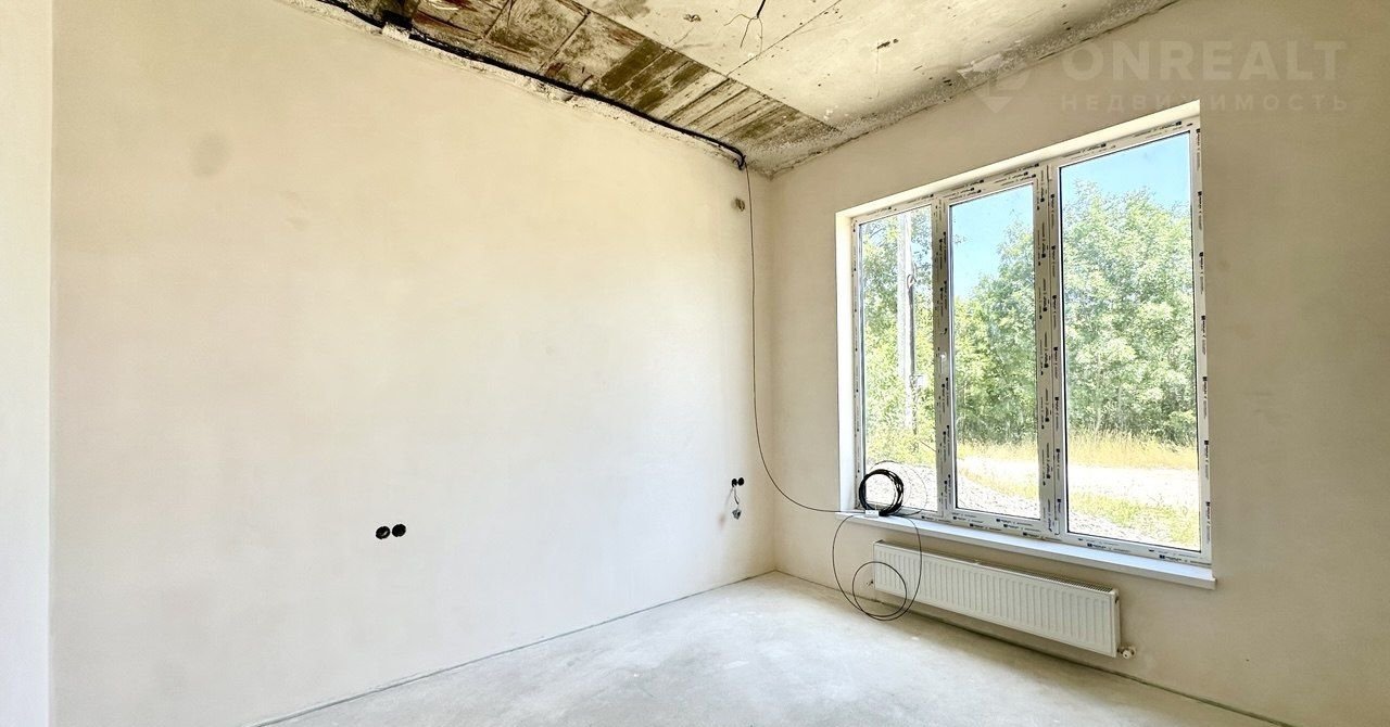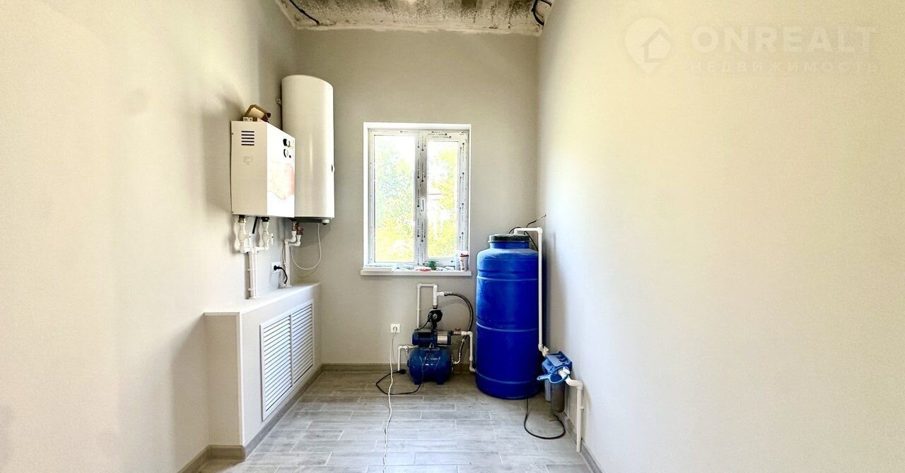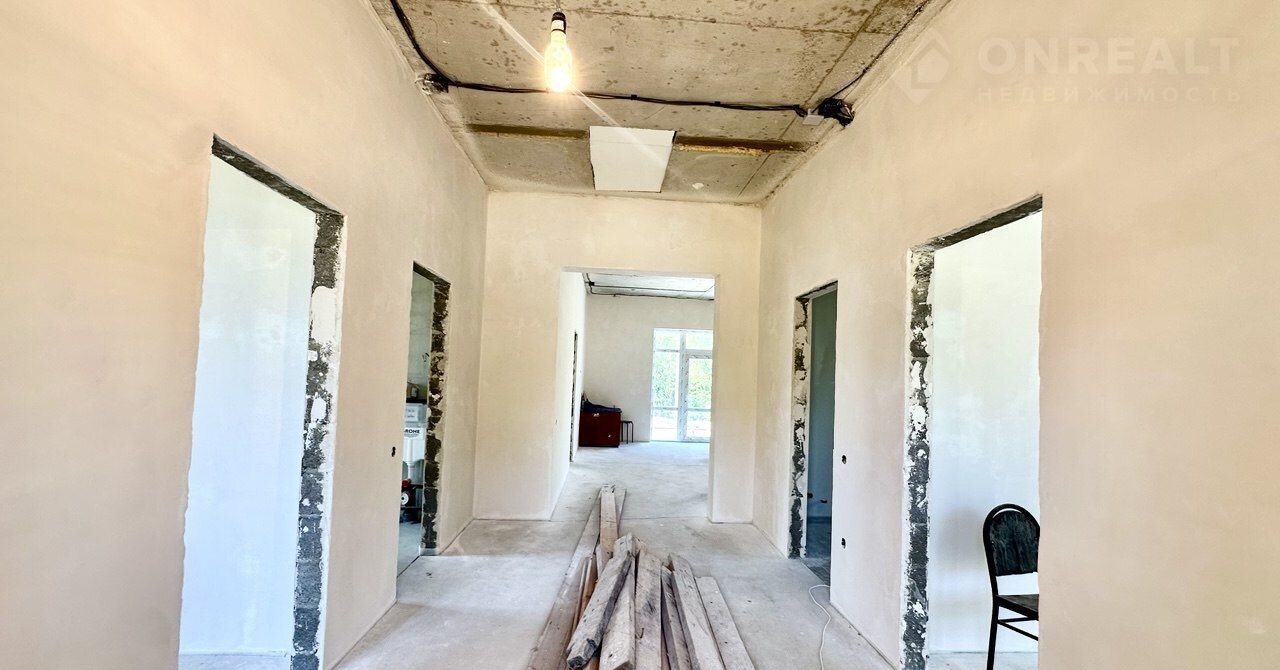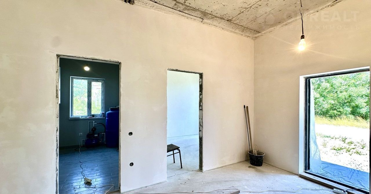 В доме электрический котел установлен, тёплые водяные полы. Выполнена стяжка пола и штукатурка стен, выведена вся электрика с розетками. Установлена скважина 140 м. Крыша - мягкая кровля. Входная дверь стоят, частично закуплена плитка и обои, останется новому владельцу. В доме два сан узла, один в мастер спальне и второй гостевой.