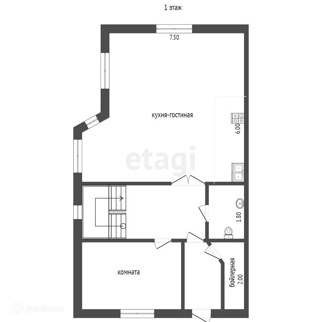 1 этаж: коридор, прихожая, бойлерная, сан.узел с душевой, спальня, кухня с гостинной