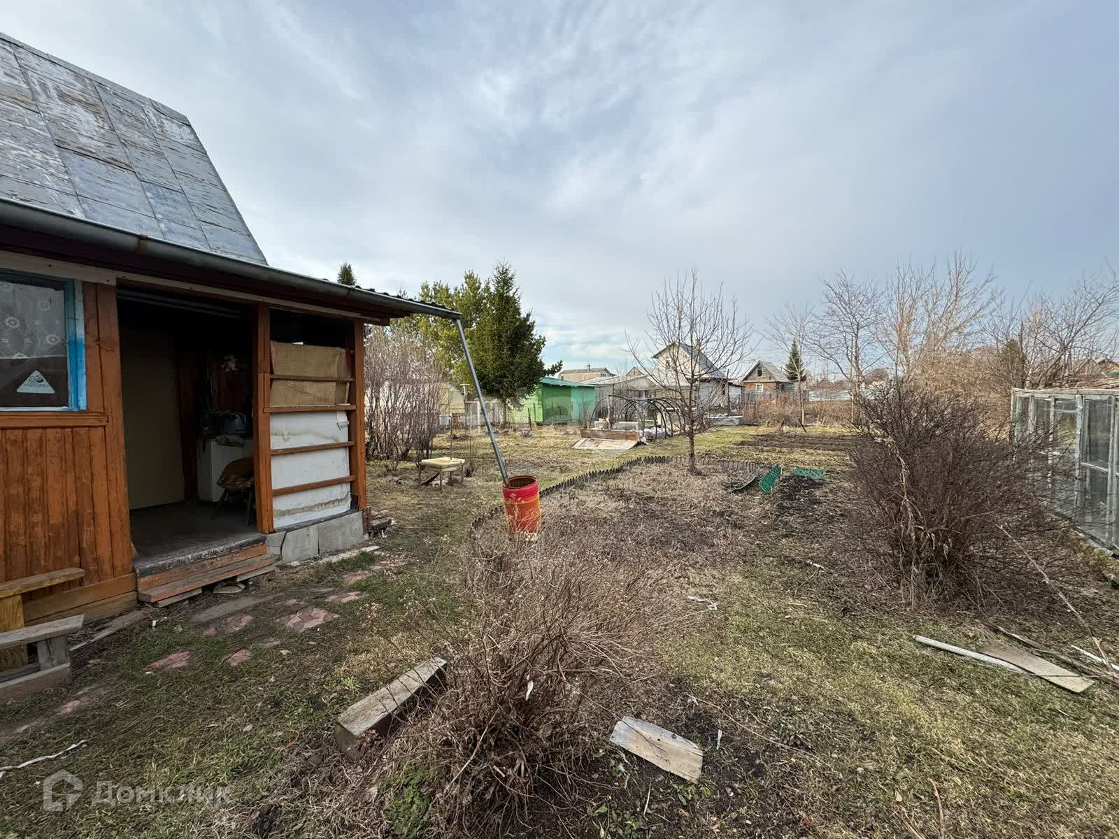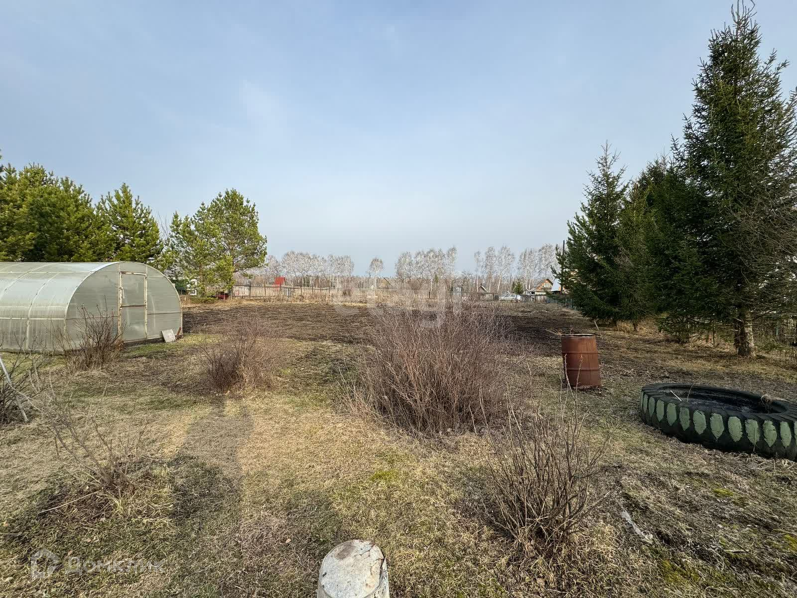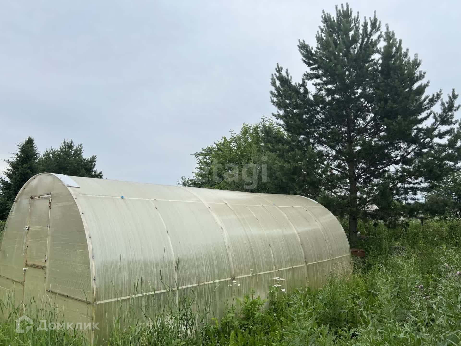 На участке располагаются две теплицы, постройка со стайкой для хранения садового инвентаря и туалетом. Также имеются плодoвые деревья и насаждения.