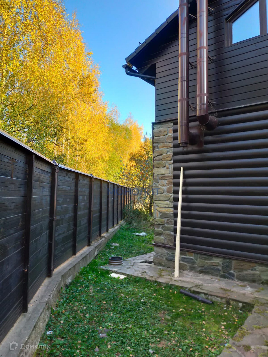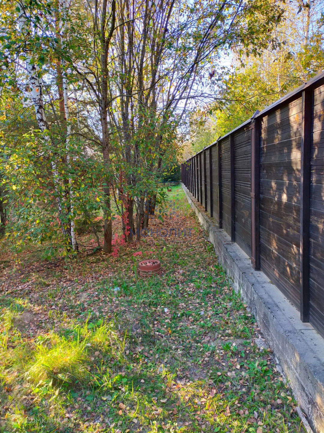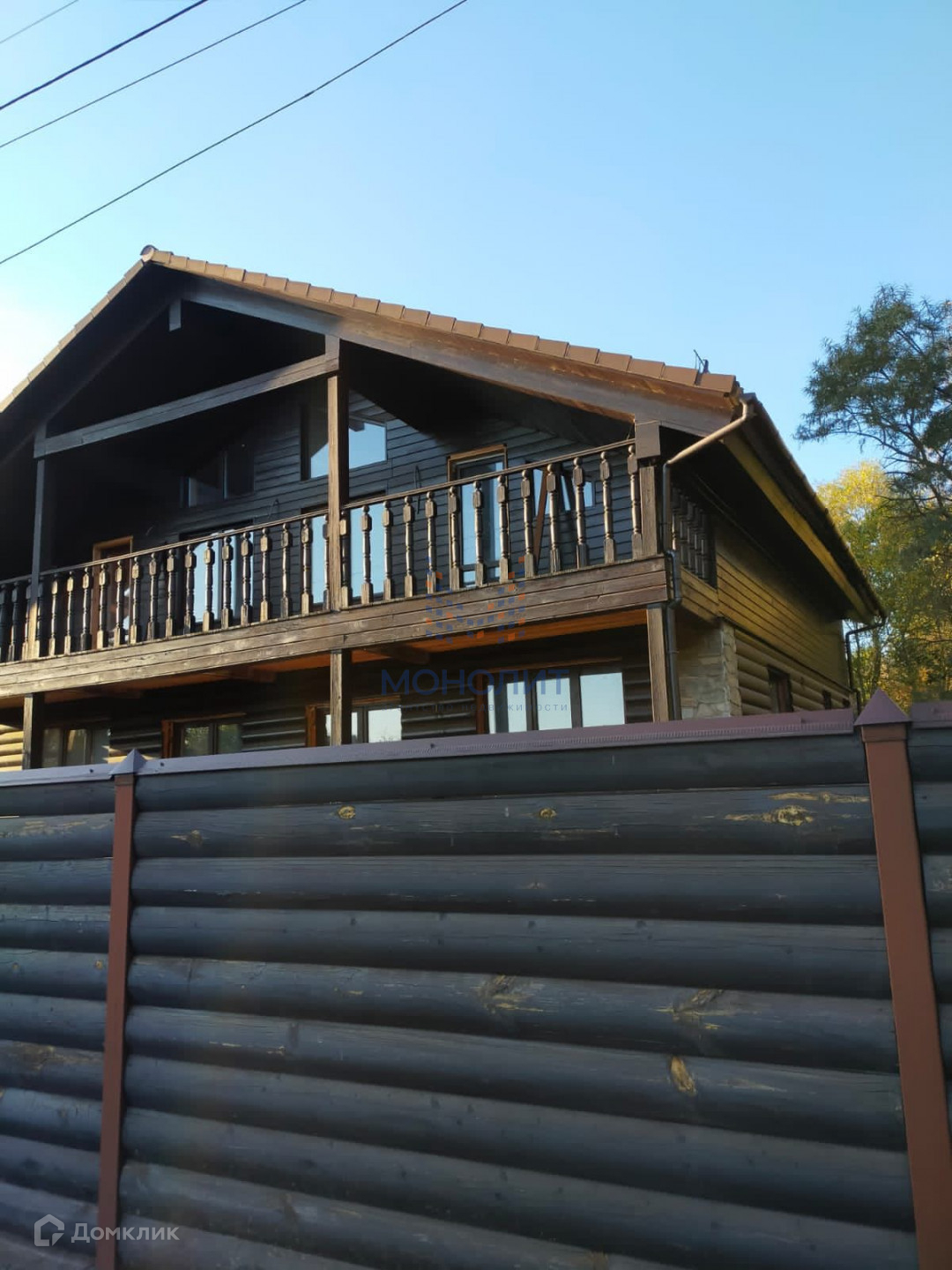 Участок окружён красивым забором из блокхауса на ленточном фундаменте.