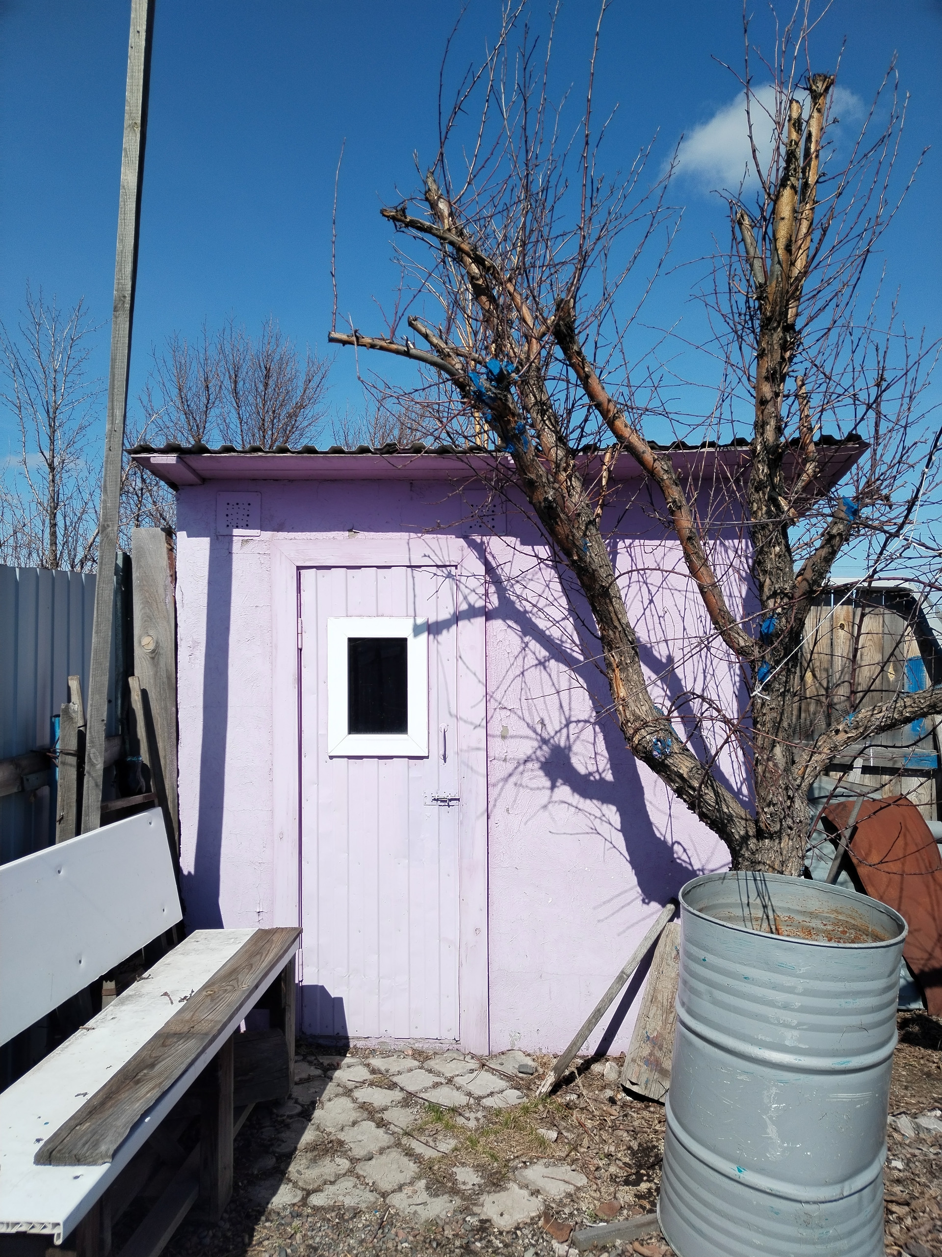 Туалет на улице ( газоблоки, утепление, окраска), пристроена техкомната для хранения инвентаря, можно переделать в душевую.
