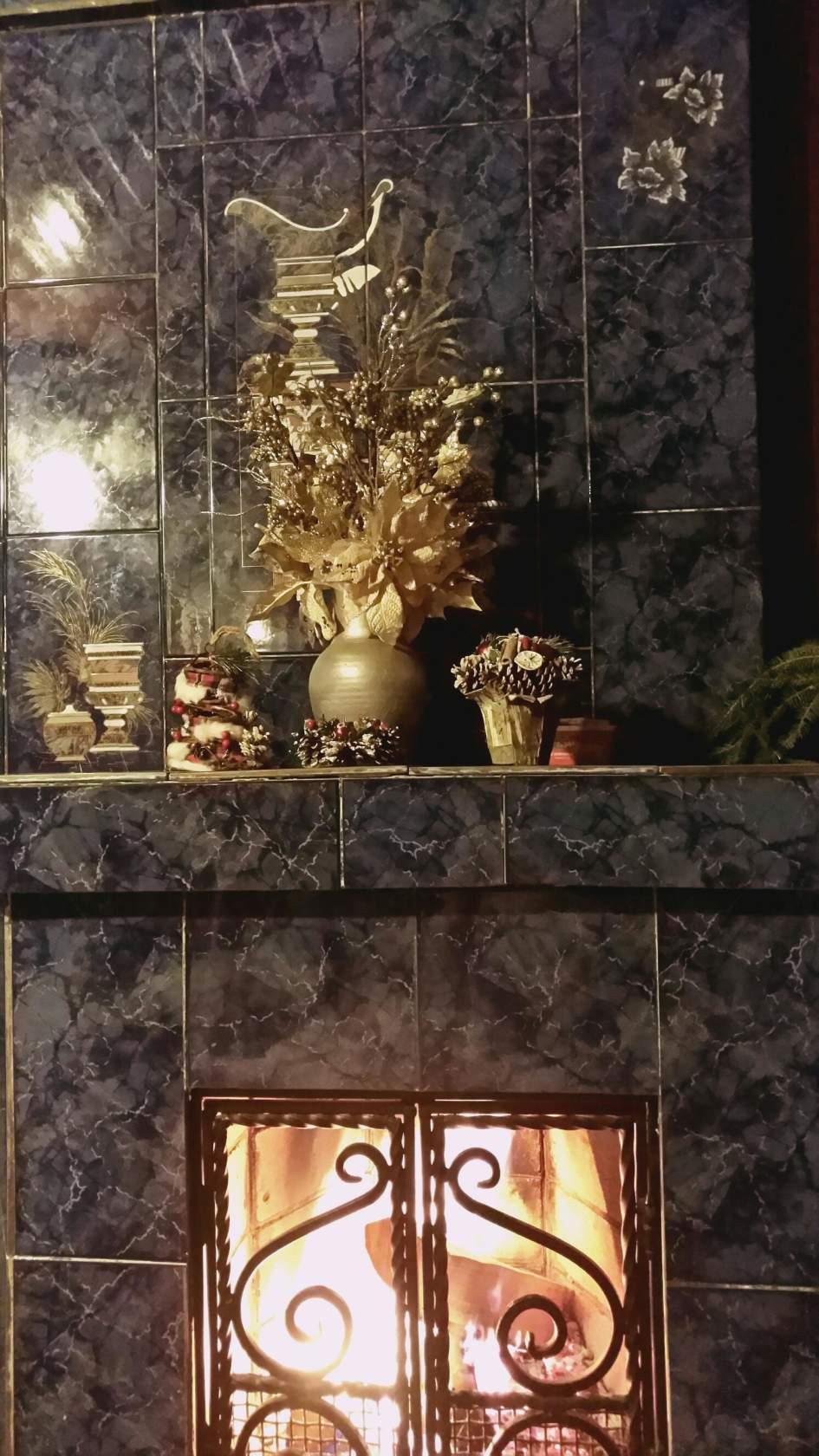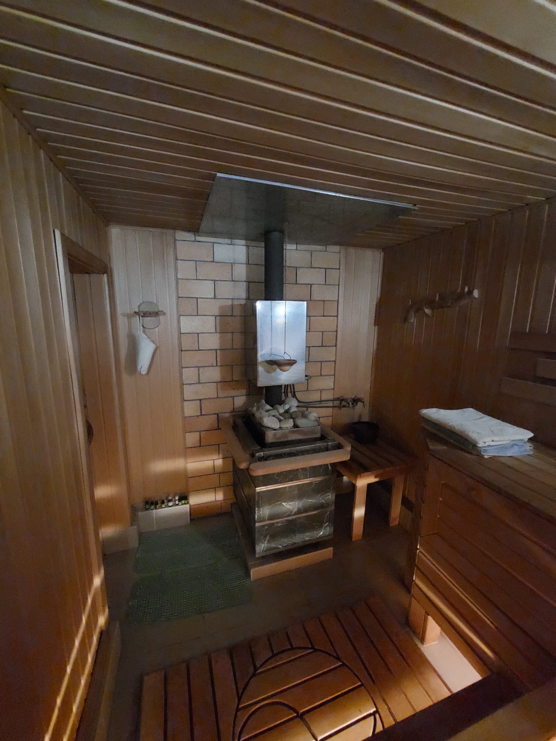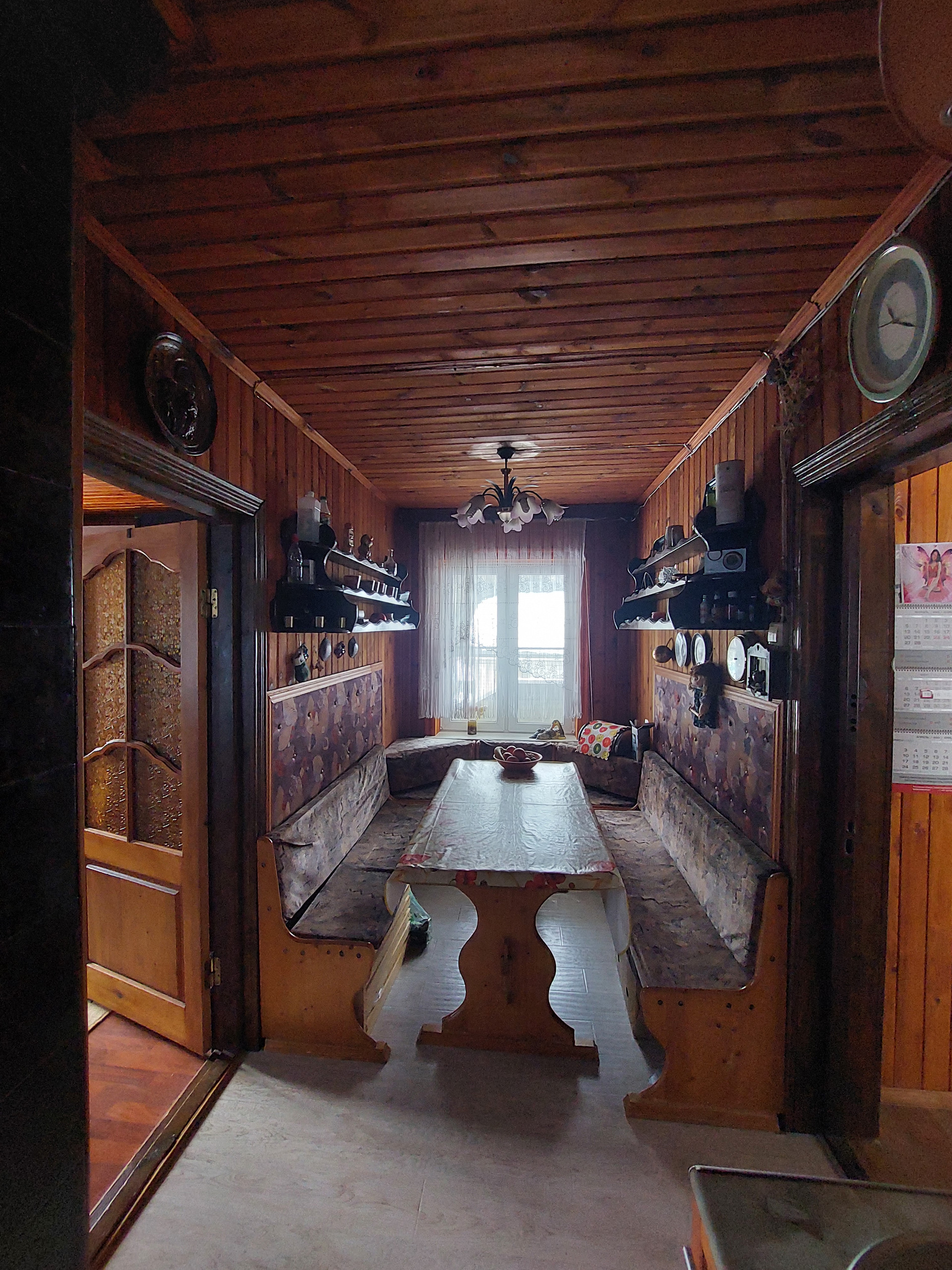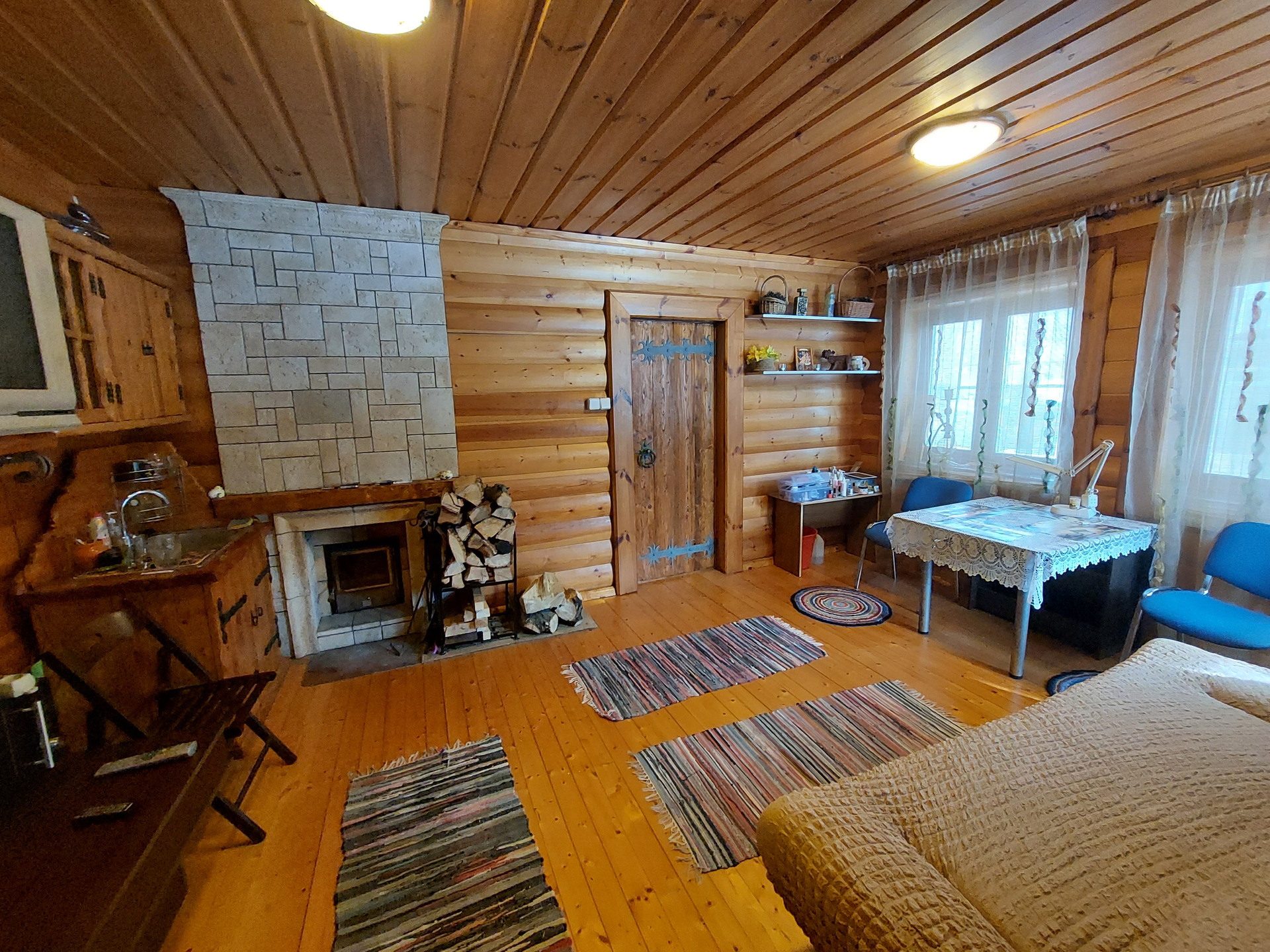 На первом этаже находится прихожая, кухня-столовая с русской печкой, гостиная с камином и санузел.
