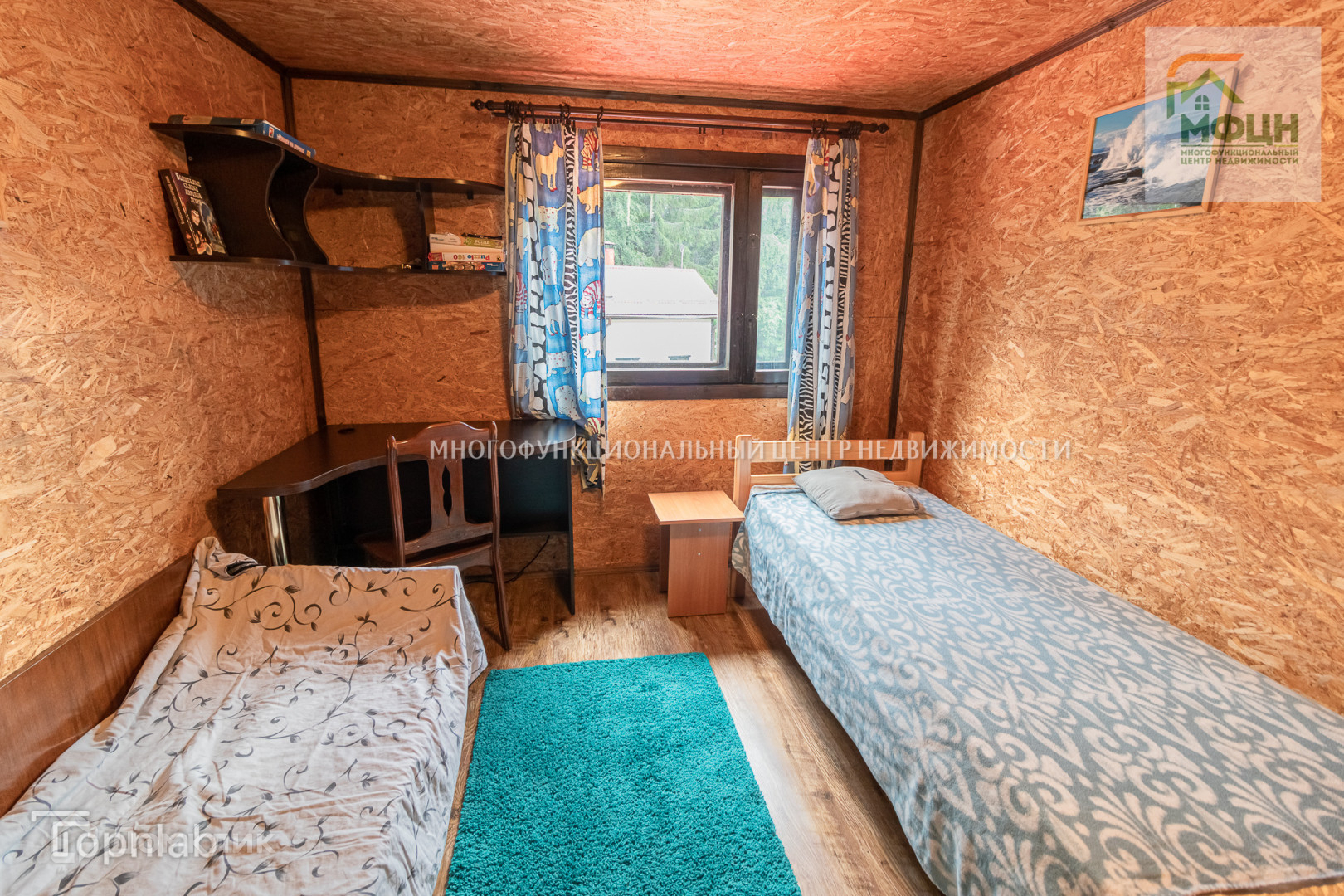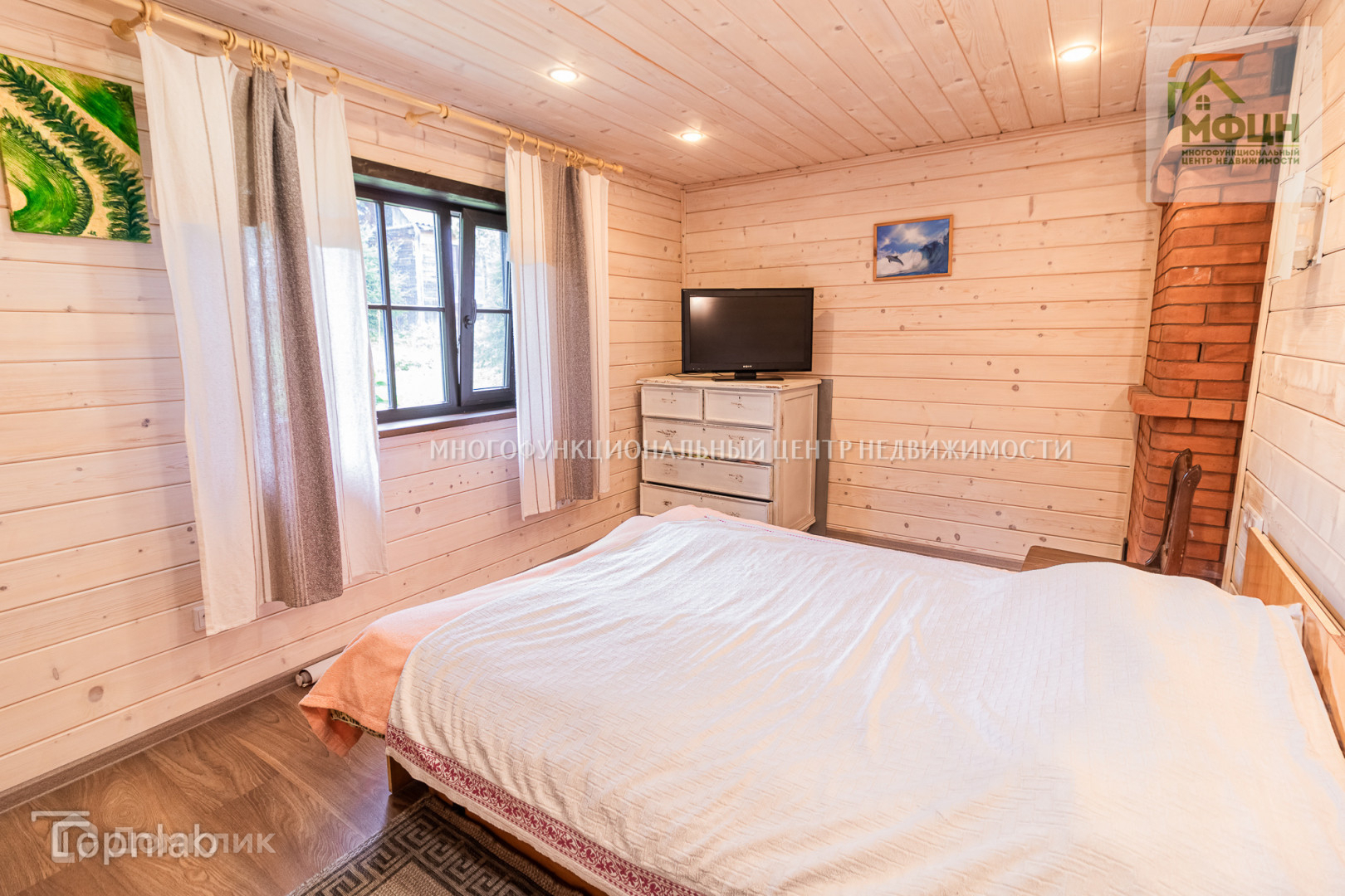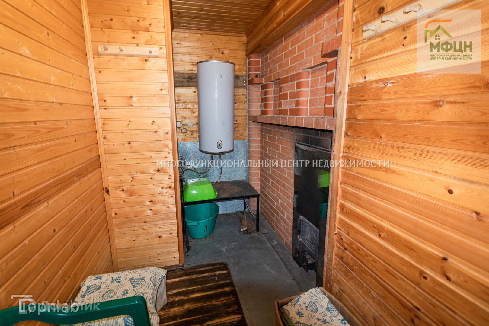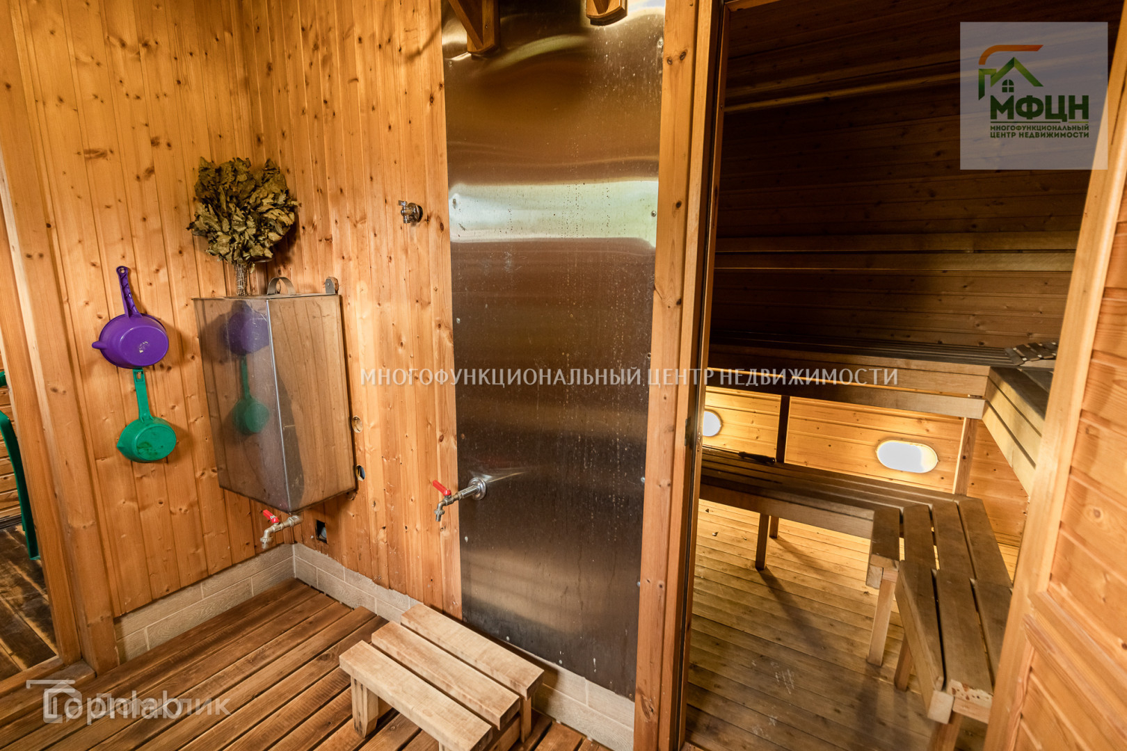 Во втором доме на первом этаже находится русская баня на дровах. В бане есть джакузи и подъёмное ведро для обливания. Также здесь расположена комната отдыха и кухня. На втором этаже расположены 3 комнаты. В самой большой из них установлен камин. Мебель остаётся.