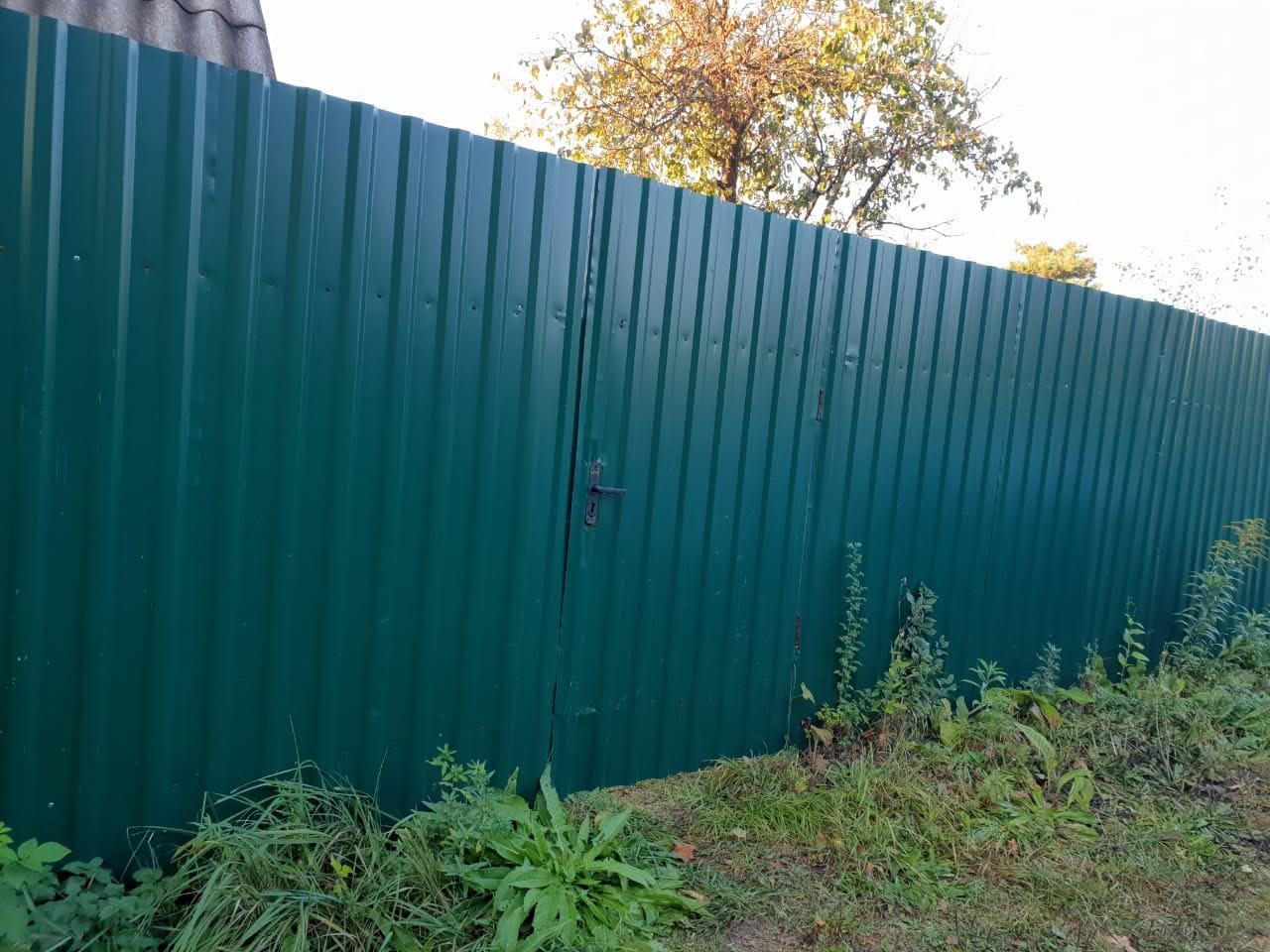 Участок огорожен забором с фасада листами металлопрофиля, по периметру рабица.