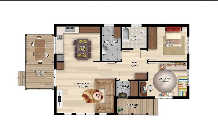 Это отличный проект одноэтажного дома с прекрасным внешним видом и отличными планировочными решениями. Тщательно продуманные планировки и оптимальная квадратура делают его практичным и функциональным вариантом для проживания семьи из 3-4 человек.