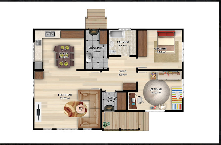 В приватной зоне коттеджа расположены просторные комнаты разной площади: спальня и детская. В просторных спальнях есть пространство не только для кровати, но и для компьютерного стола и шкафов для одежды. Рядом с бойлерной размещен сан.узел.