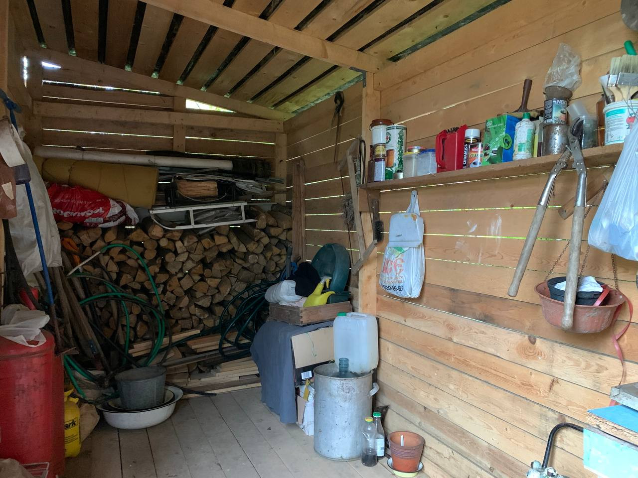 На участке находится небольшая теплица, яблони, сливы, дровяной сарай, так же есть парковочное место. Забор отсутствует.