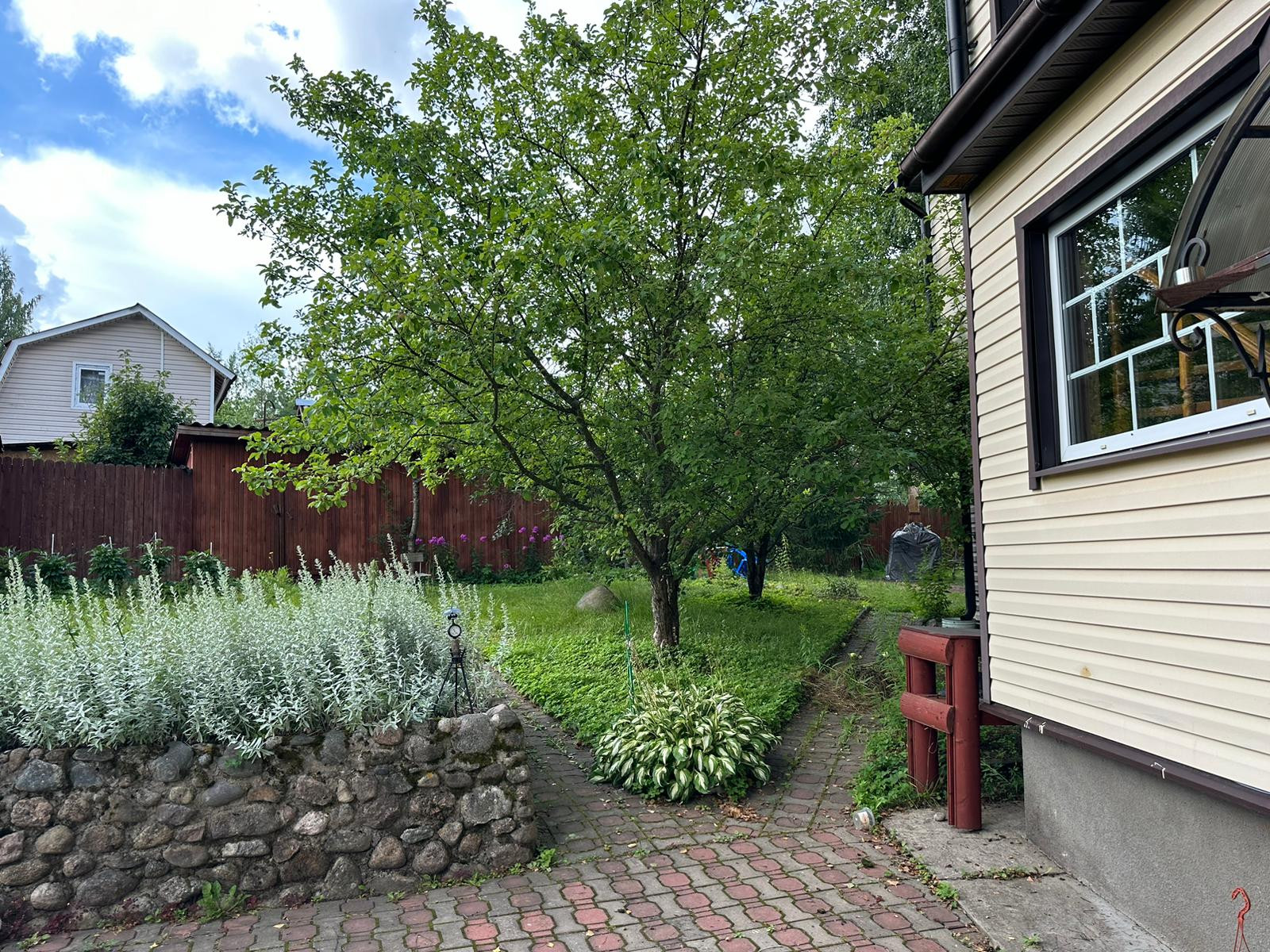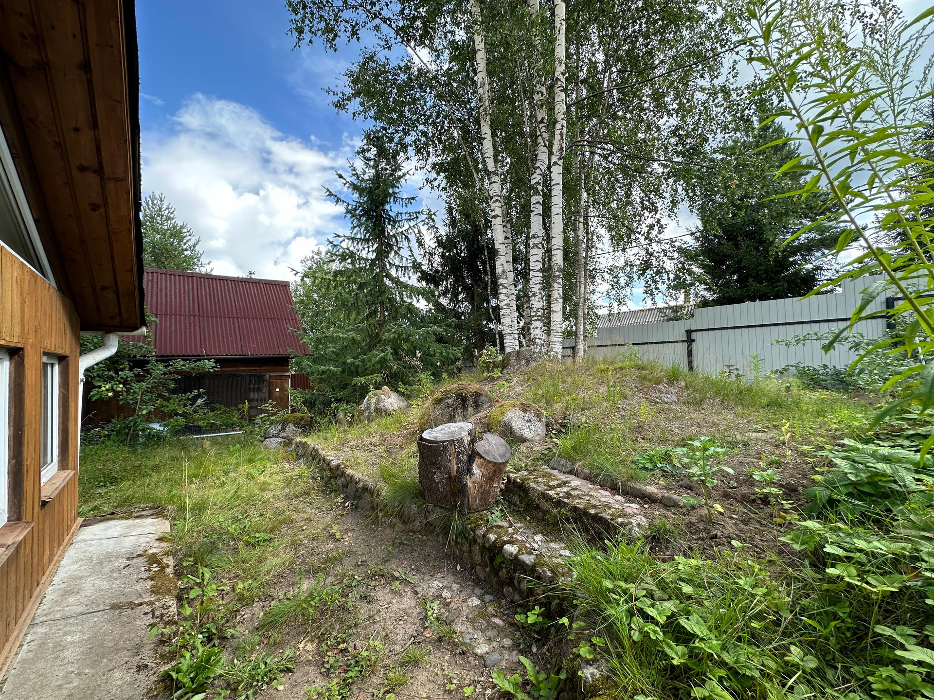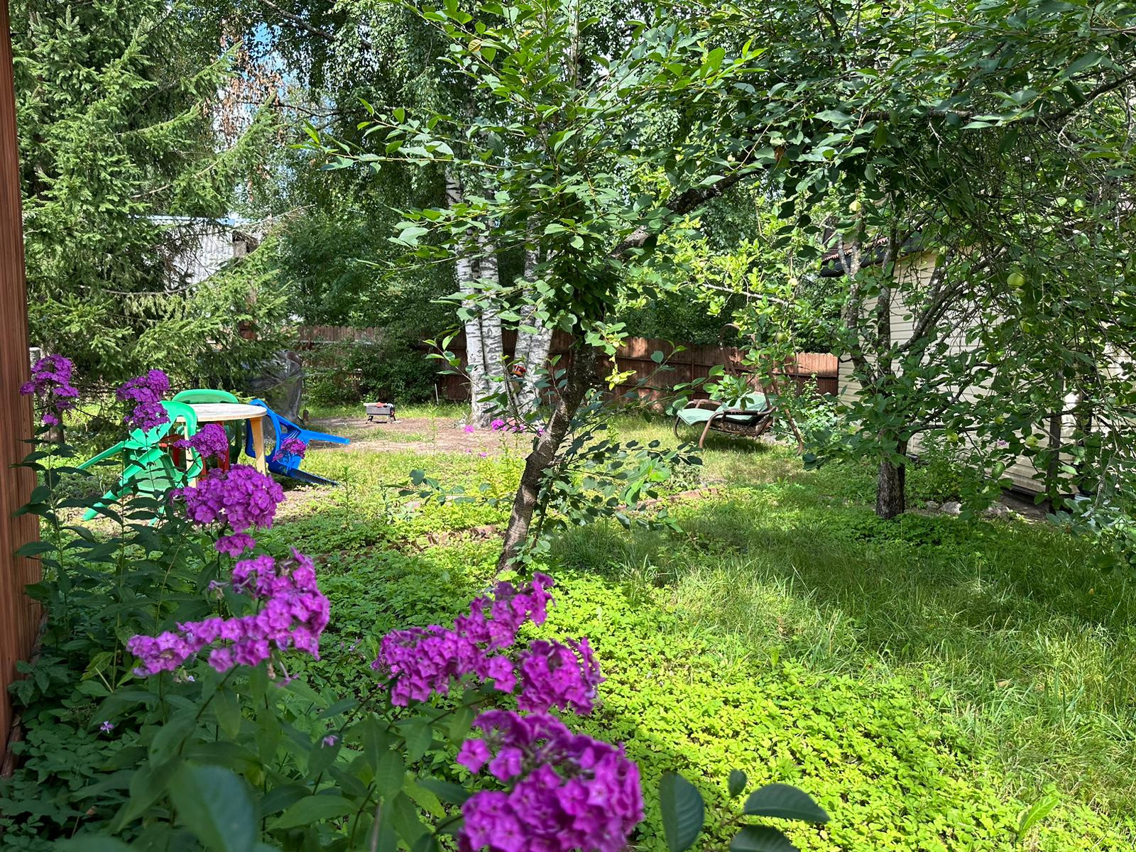 На участке растут плодовые дерья, яблони, вишня, крыжовник, черная смородина, клубника, а так же вековая сосна и берёзы. В парнике раскинули свои ветви помидоры, огурцы и болгарский перец.