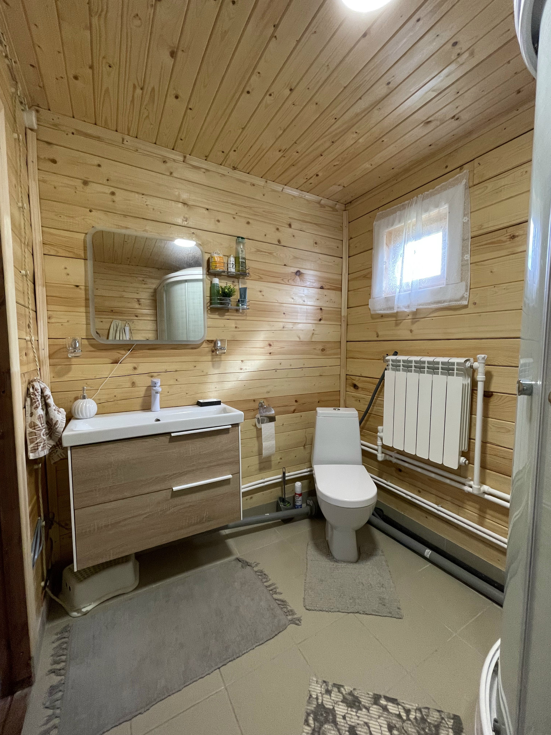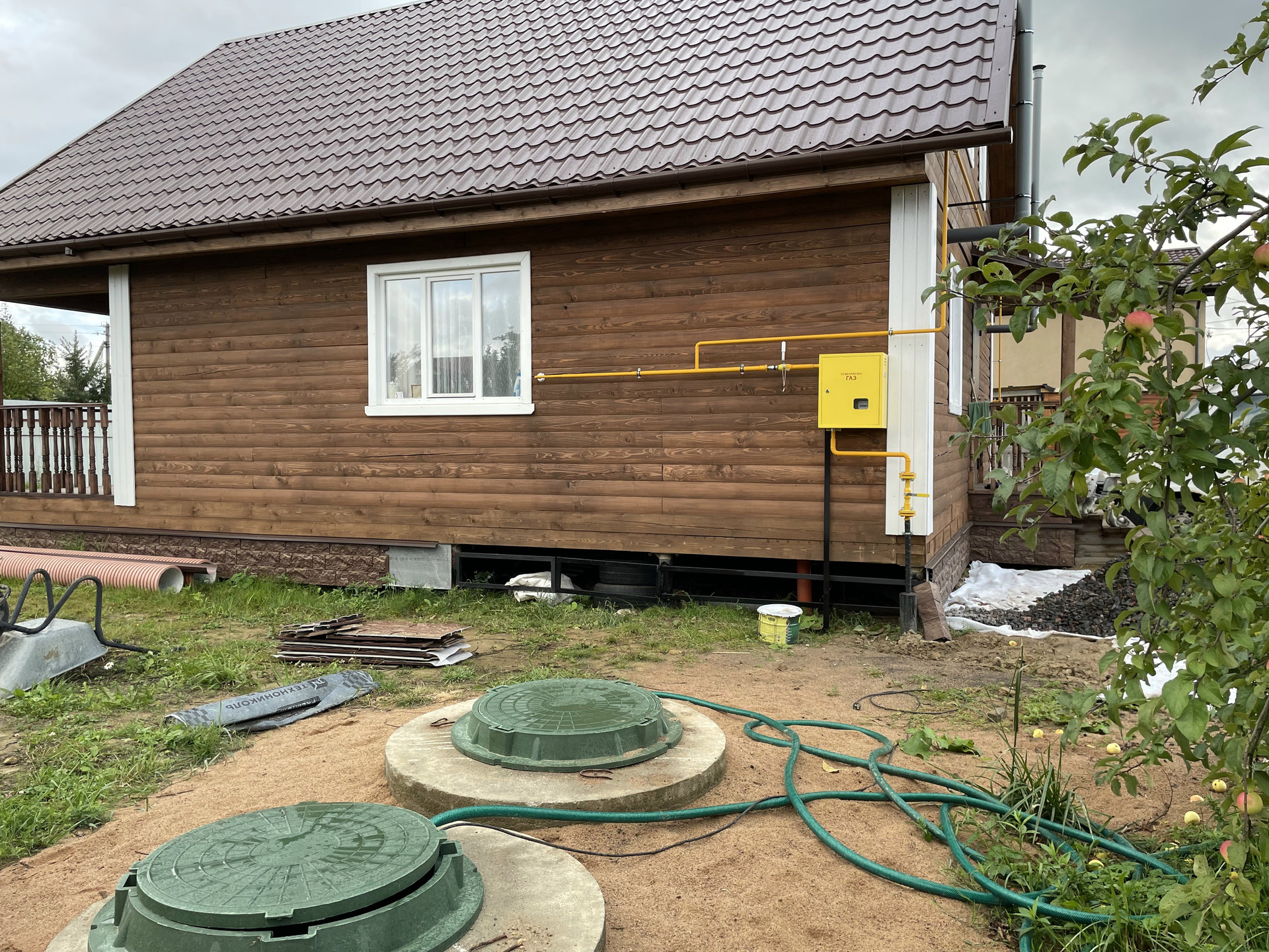 К дому подведена газовая труба, в течении месяца ожидается подключение газа, электроэнергия 5 кВт, вода из колодца (7 колец), канализация - септик. Есть летний водопровод (для полива). Отопление на данный момент - керамо-кварцевые обогреватели (быстро нагреваются и долго держат тепло после отключения), в топочной установлен 2х контурный газовый котёл, бойлер на 100 л.