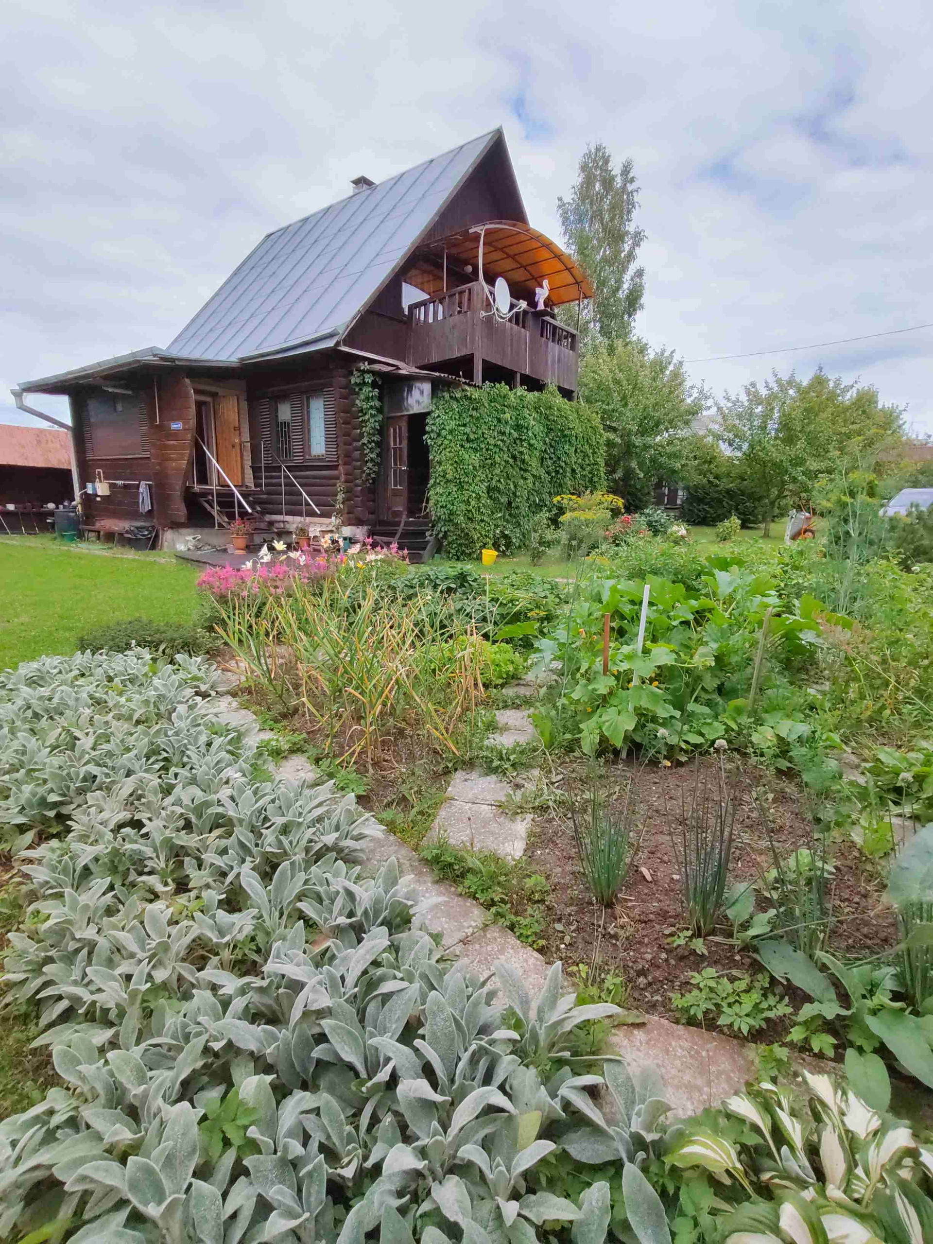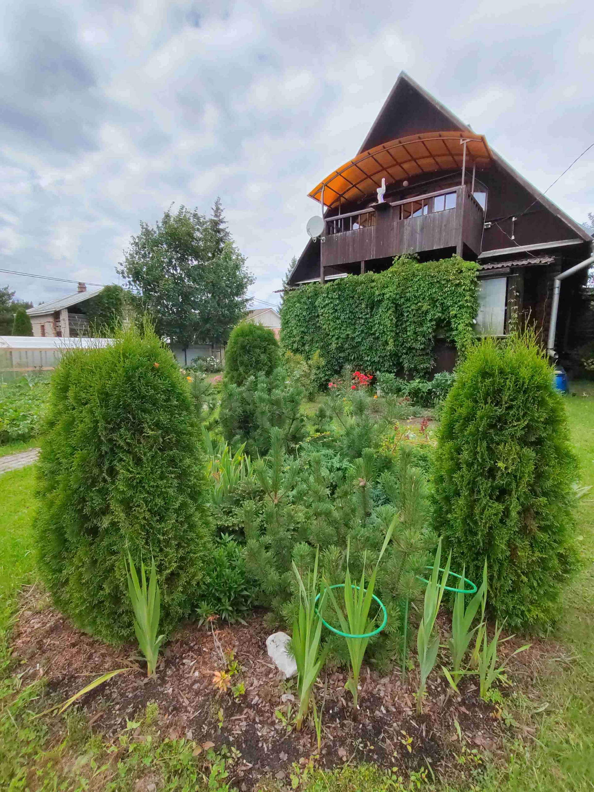 На территории имеется много зелёных растений (яблони, туи, дубы, можжевельник, сосны, цветы и ели).