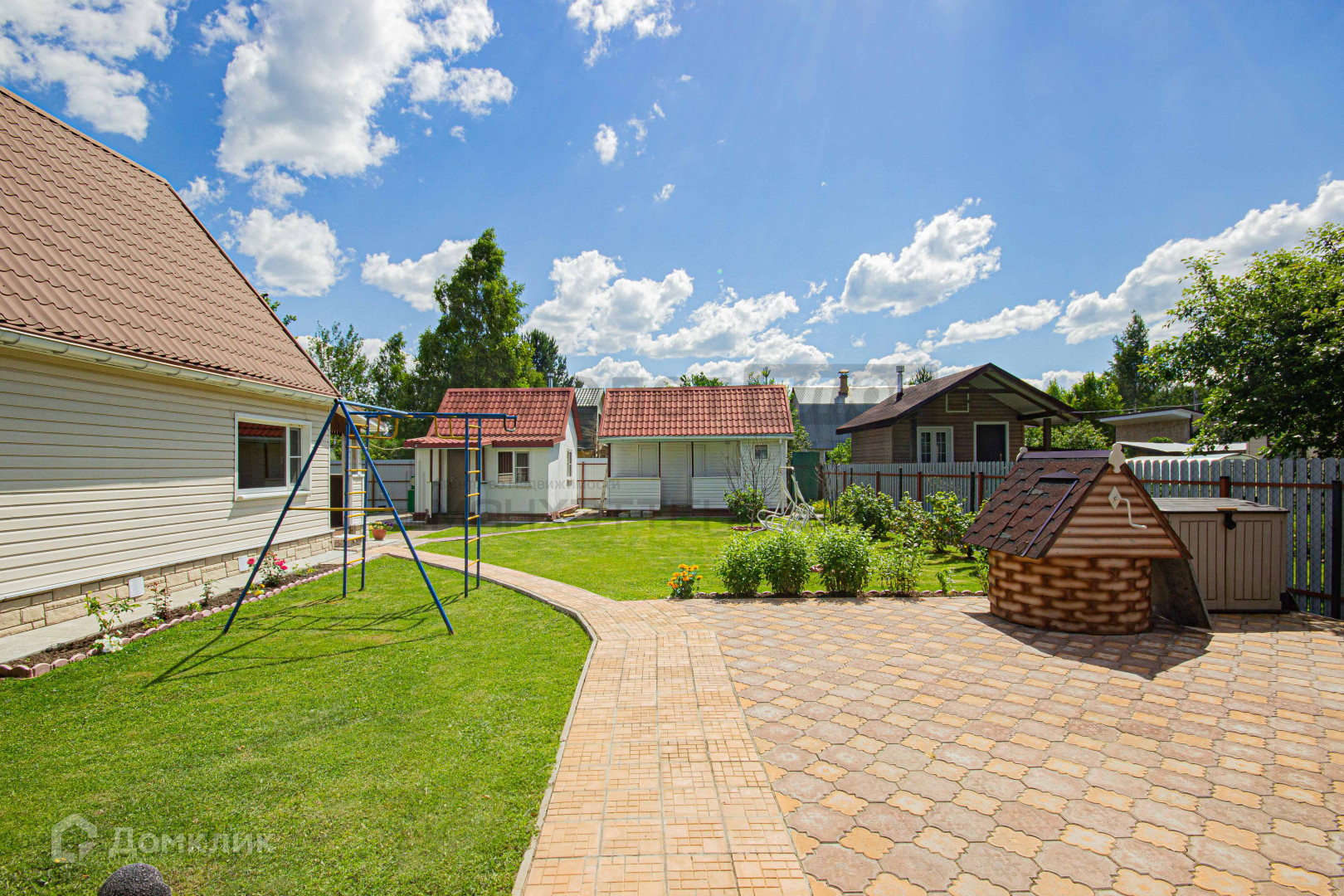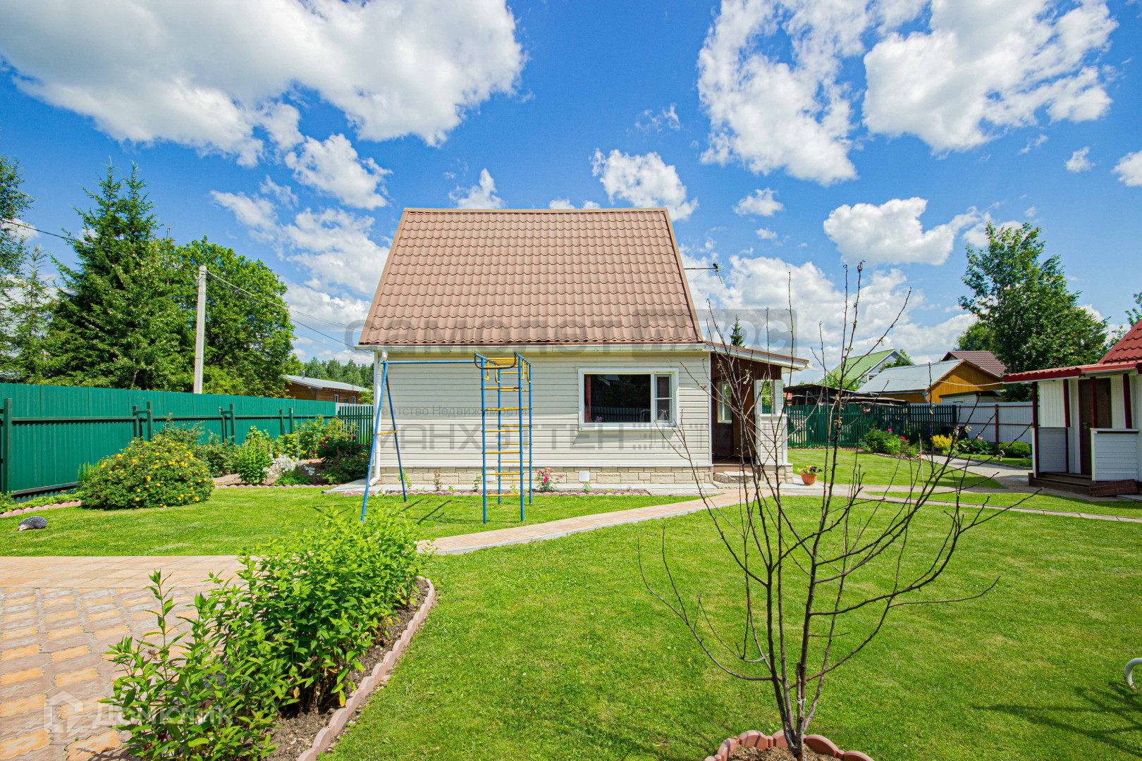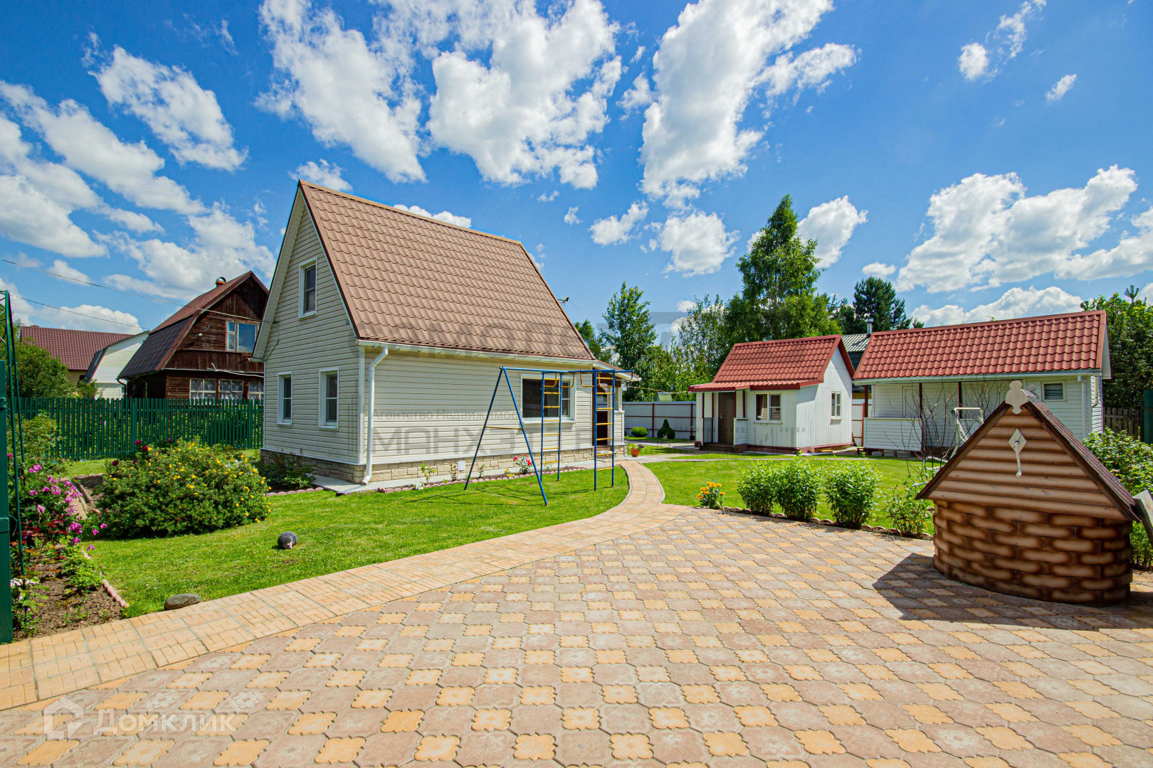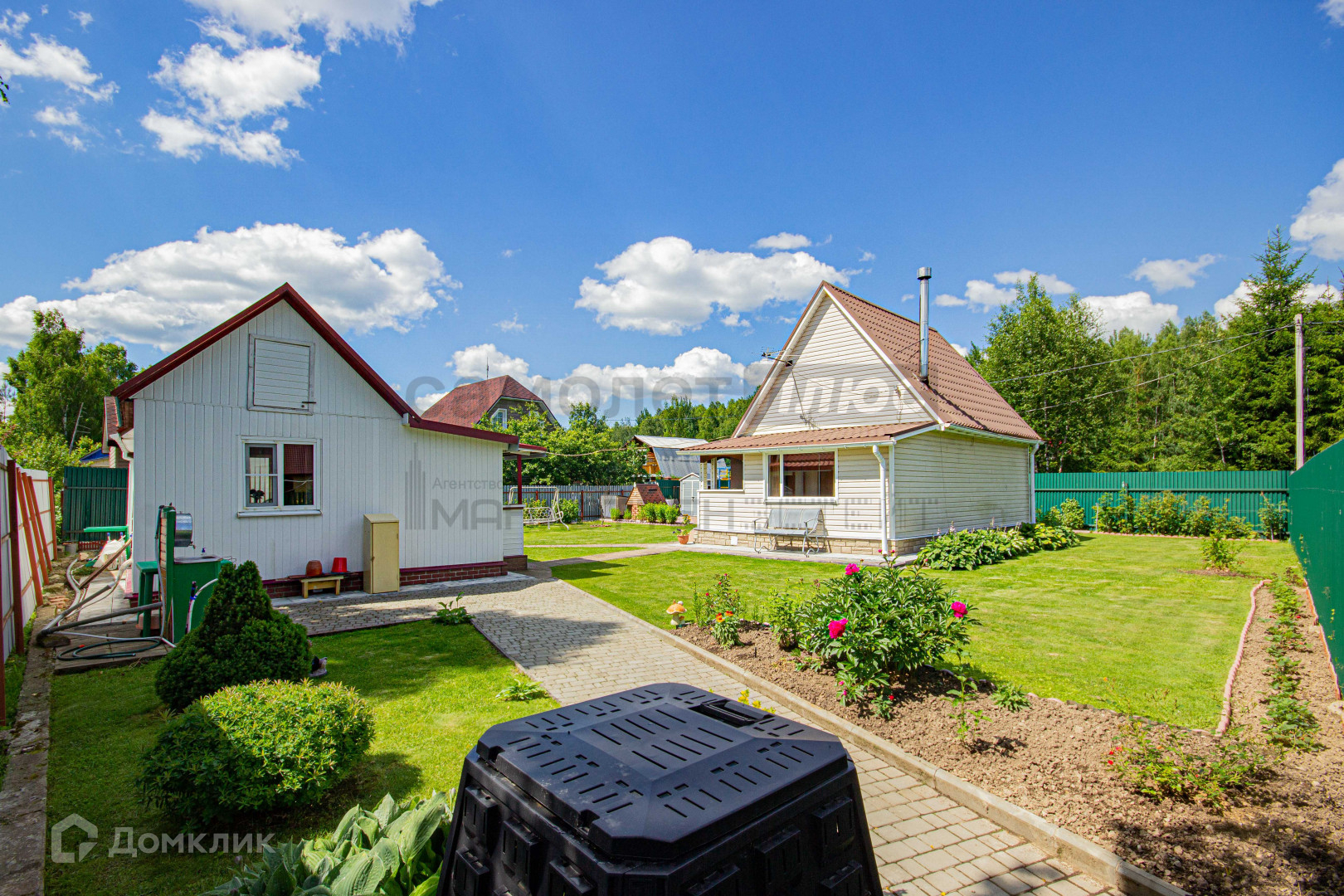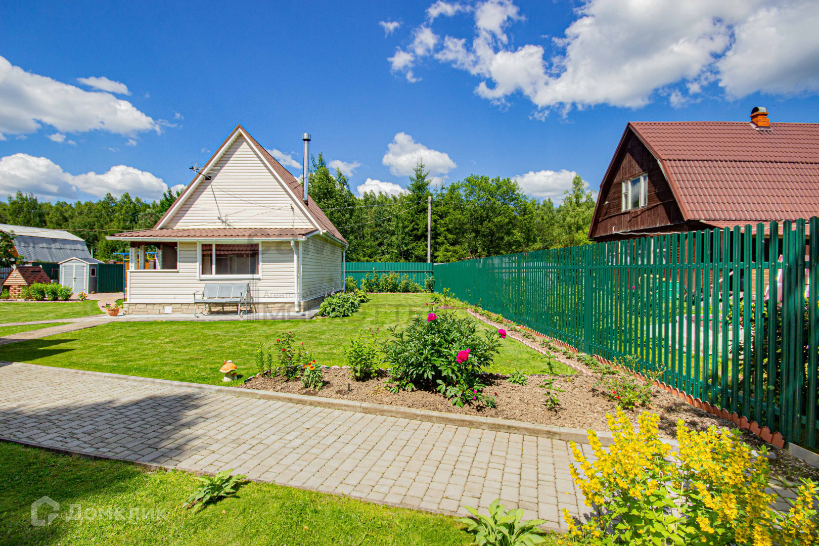 Дача расположена на зелёном участке, покрыт мягкой травой и украшен яркими цветами;