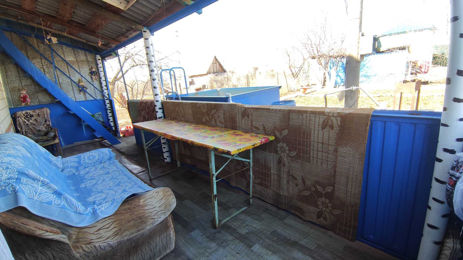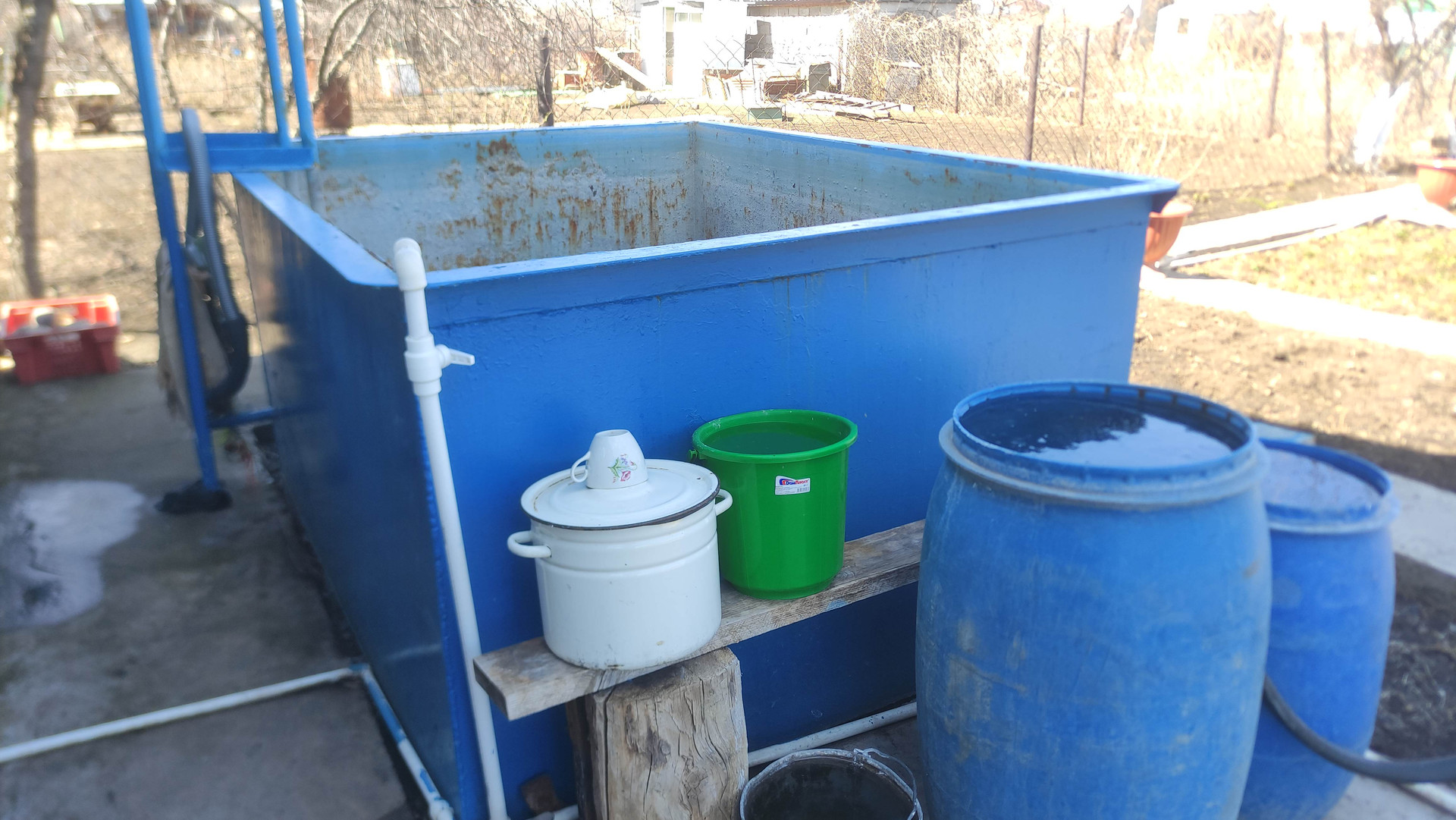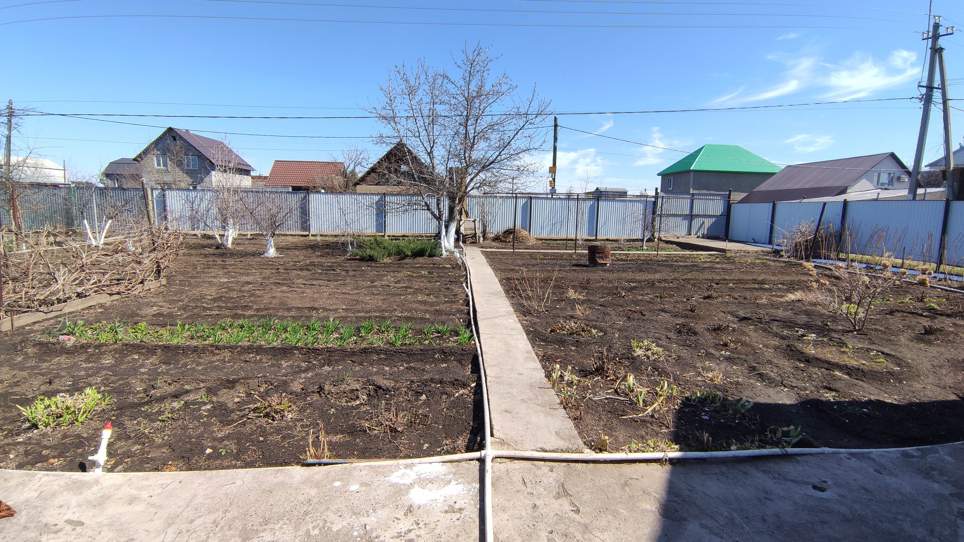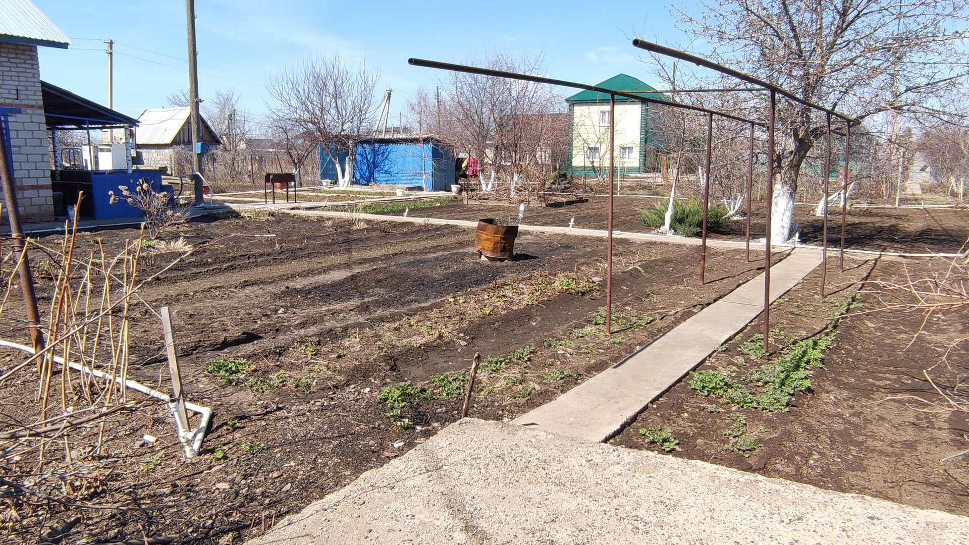 Баня новой постройки, металлический бассейн. Имеется ёмкость для воды, сарай для хранения инструментов. Посажено много плодоносящих деревьев, виноград, кустарник, розы. По участку проложена пластиковая разводка труб для полива, забетонированные дорожки. Ухоженный участок площадью 6,3 сотки.