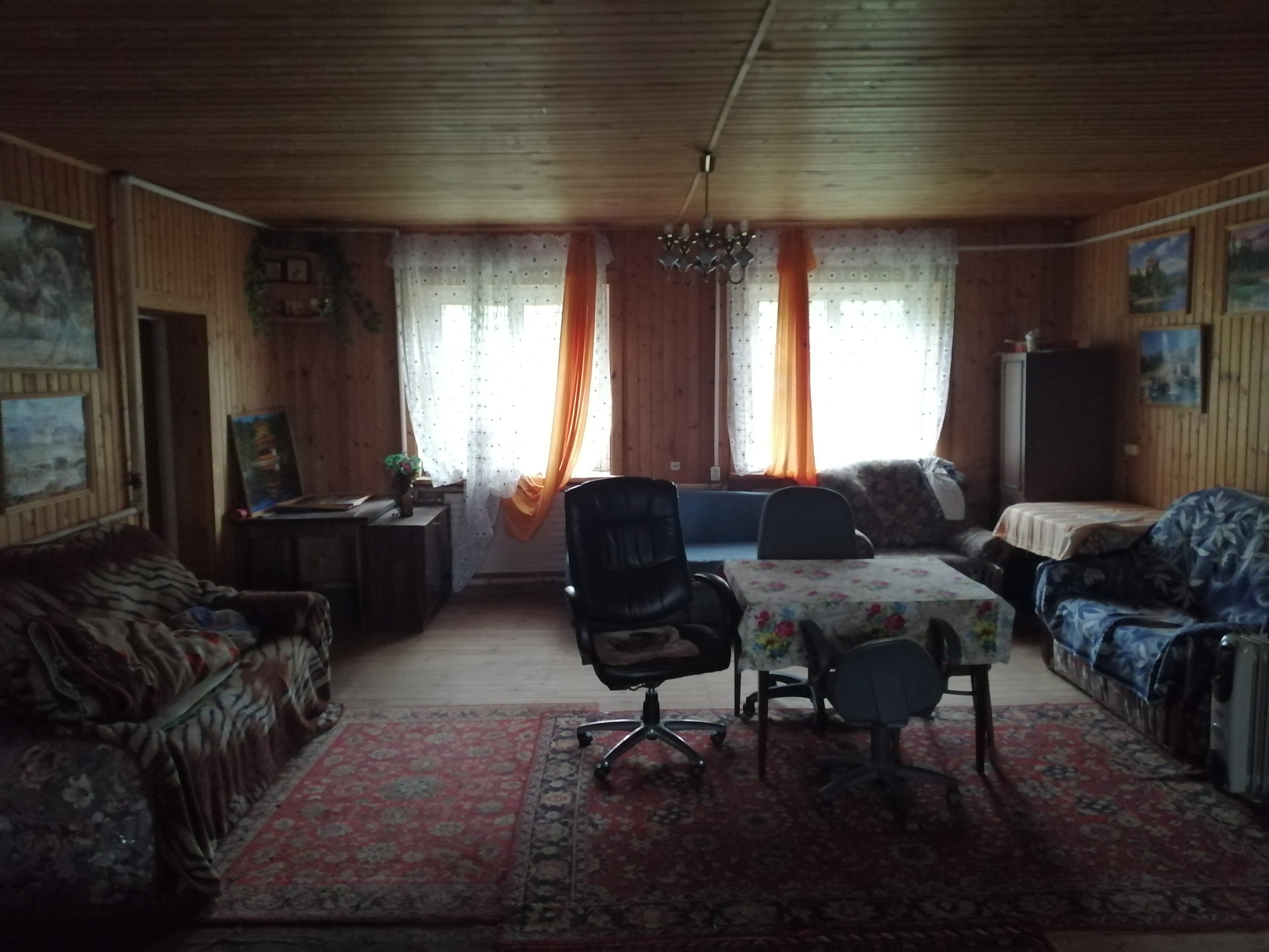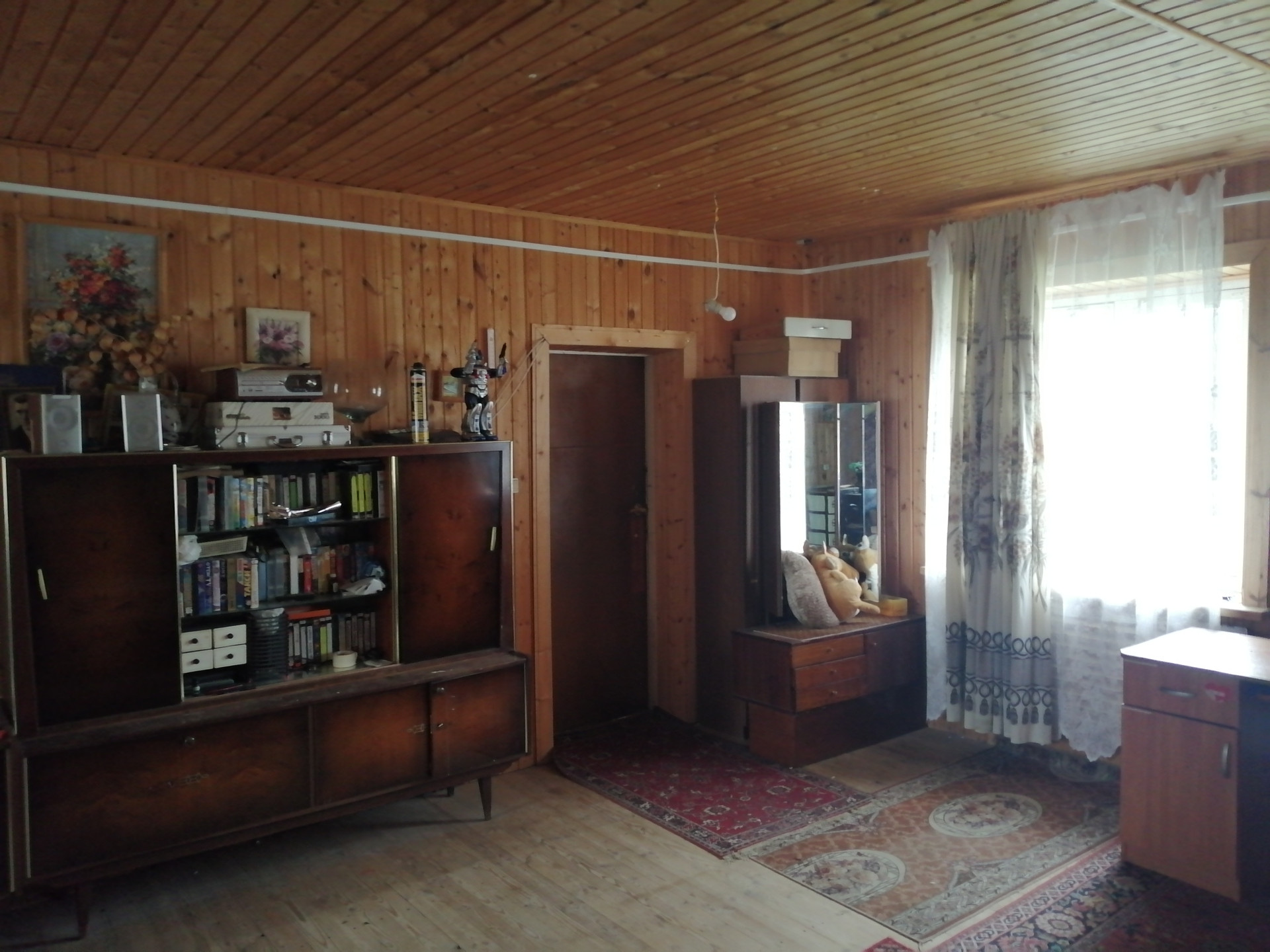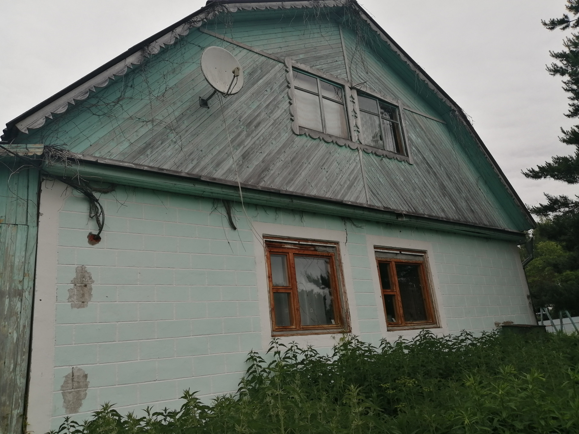 Стены первого этажа сделаны из кирпича, перекрытия - бетонные плиты, второй этаж - мансардный из дерева. Фундамент из бетонных блоков. Внутри дом отделан вагонкой, снаружи первый этаж оштукатурен. В доме душ, канализация (бетонные кольца вкопанные во дворе), туалет. На участке колодец, от него проведена вода к раковине на кухне (вкопаны отдельные кольца для стока воды), в душ и возможностью заправить отопление (система отопления с котлом и радиаторами). Для горячей воды необходим новый бойлер или заменить 1 тэн у старого. Отопление водяное, также присутствуют хорошие электрические конверторные обогреватели (на первом этаже). Второй этаж без отопления.