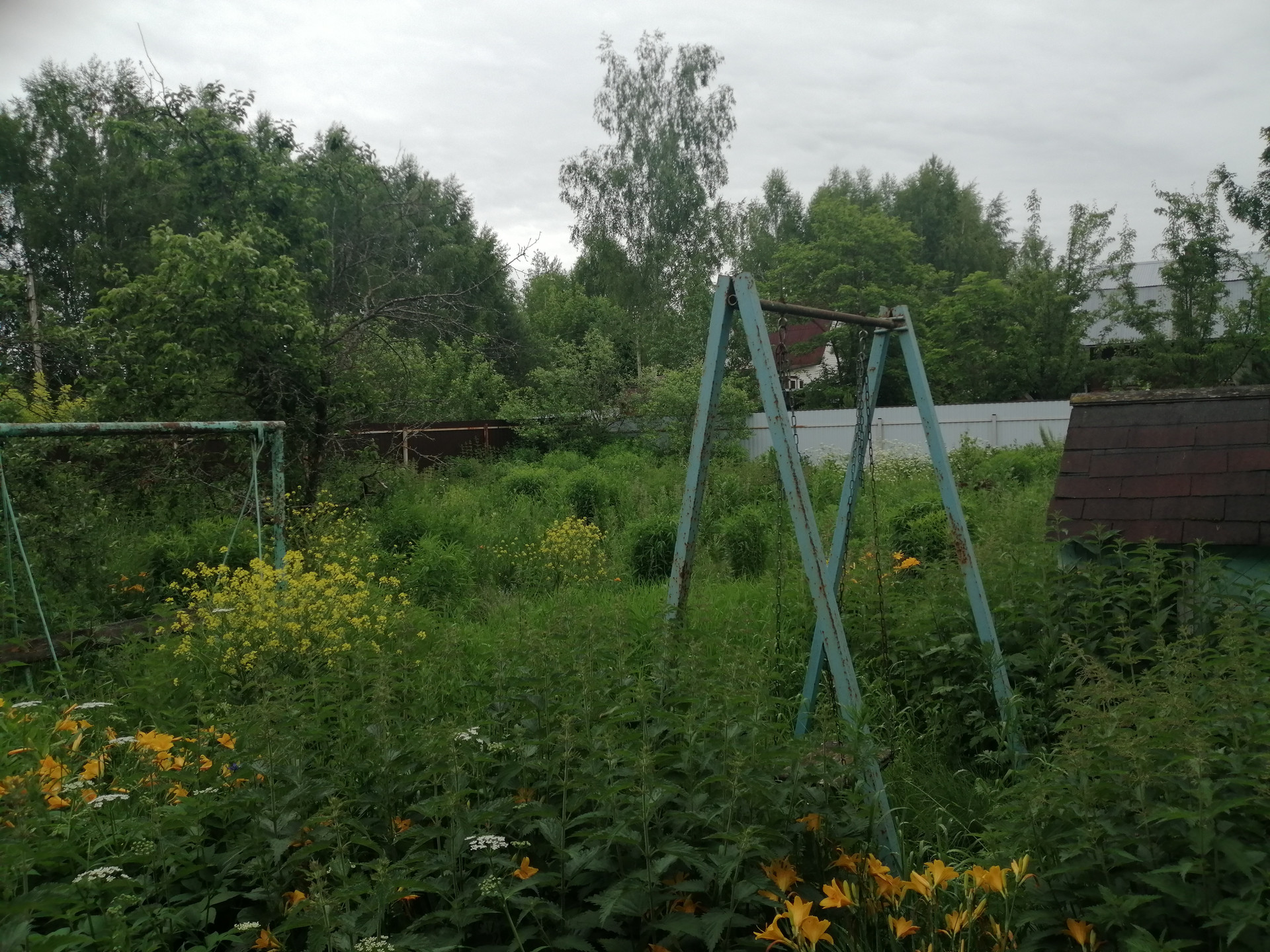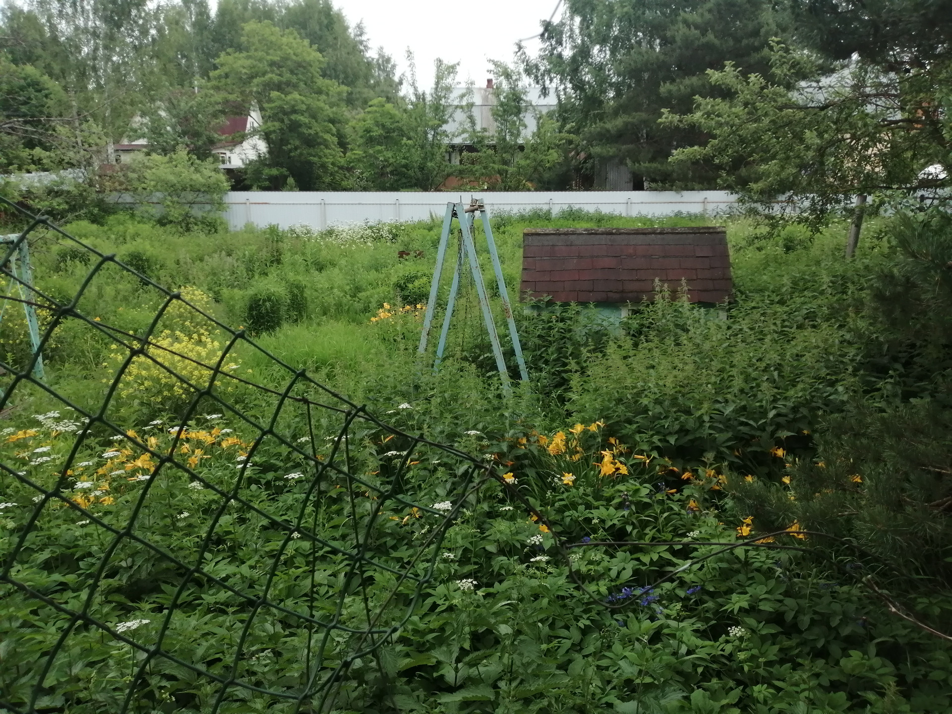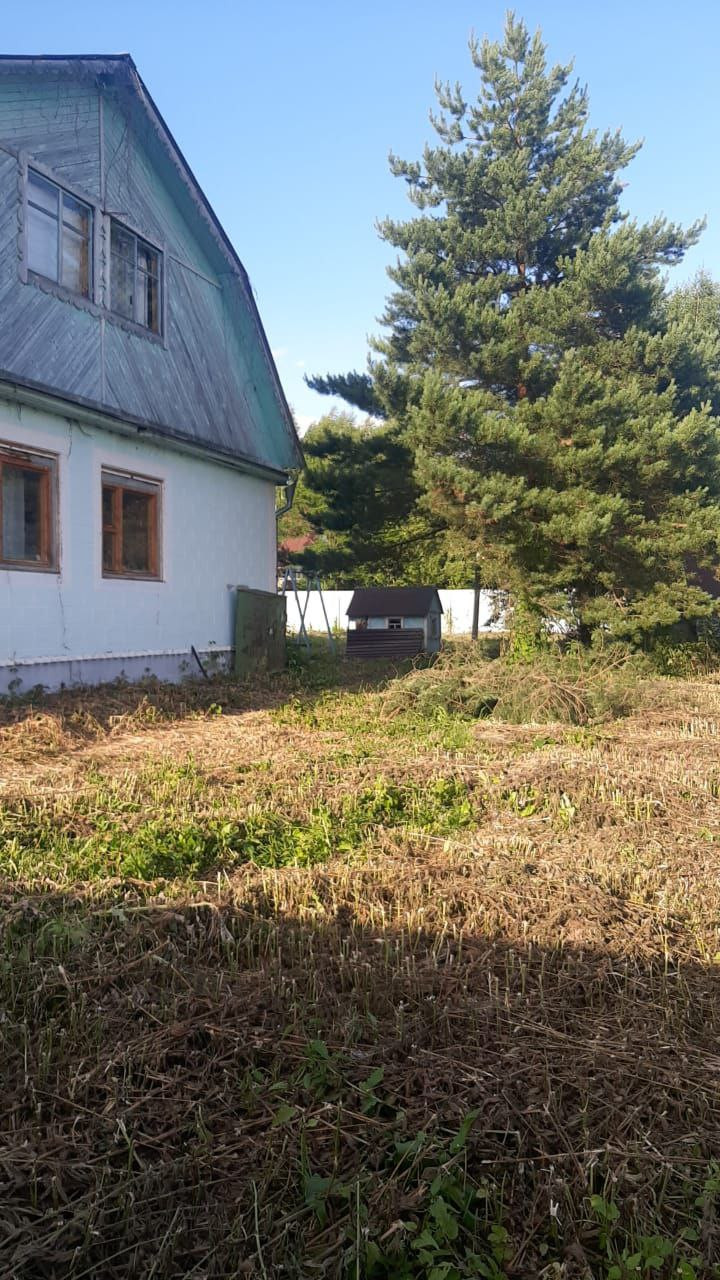 На участке взрослая сосна, 3 яблони, слива, качели взрослые и детские, детский домик, декоративный фонтанчик, уличный туалет, колодец.