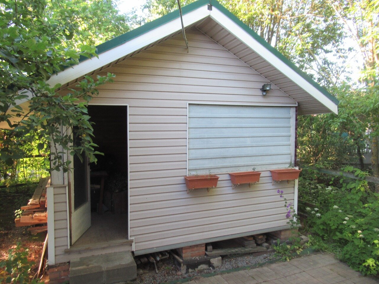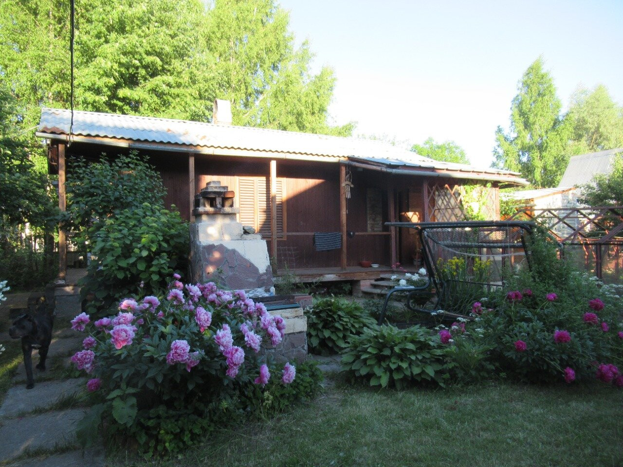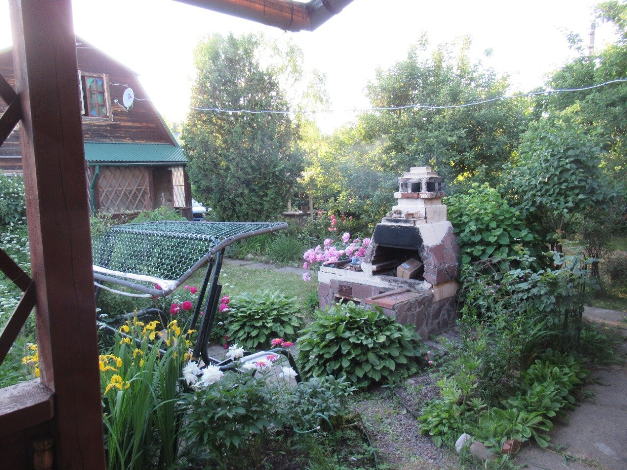 Благоустроенная зона огорода с привезённым чернозёмом, разведённые точки воды по участку, зона барбекю с качелями и капитальным мангалом.