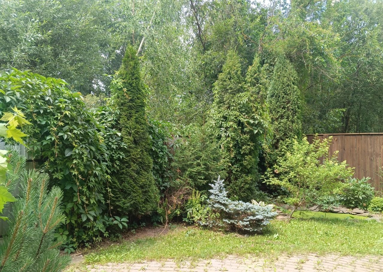 На участке растут хвойные, плодовые деревья и ягодные кустарники, множество цветов.