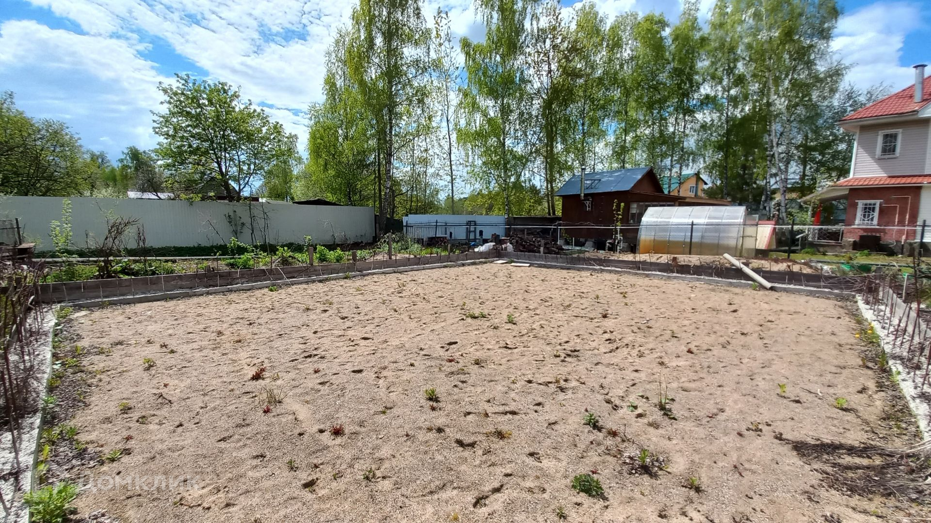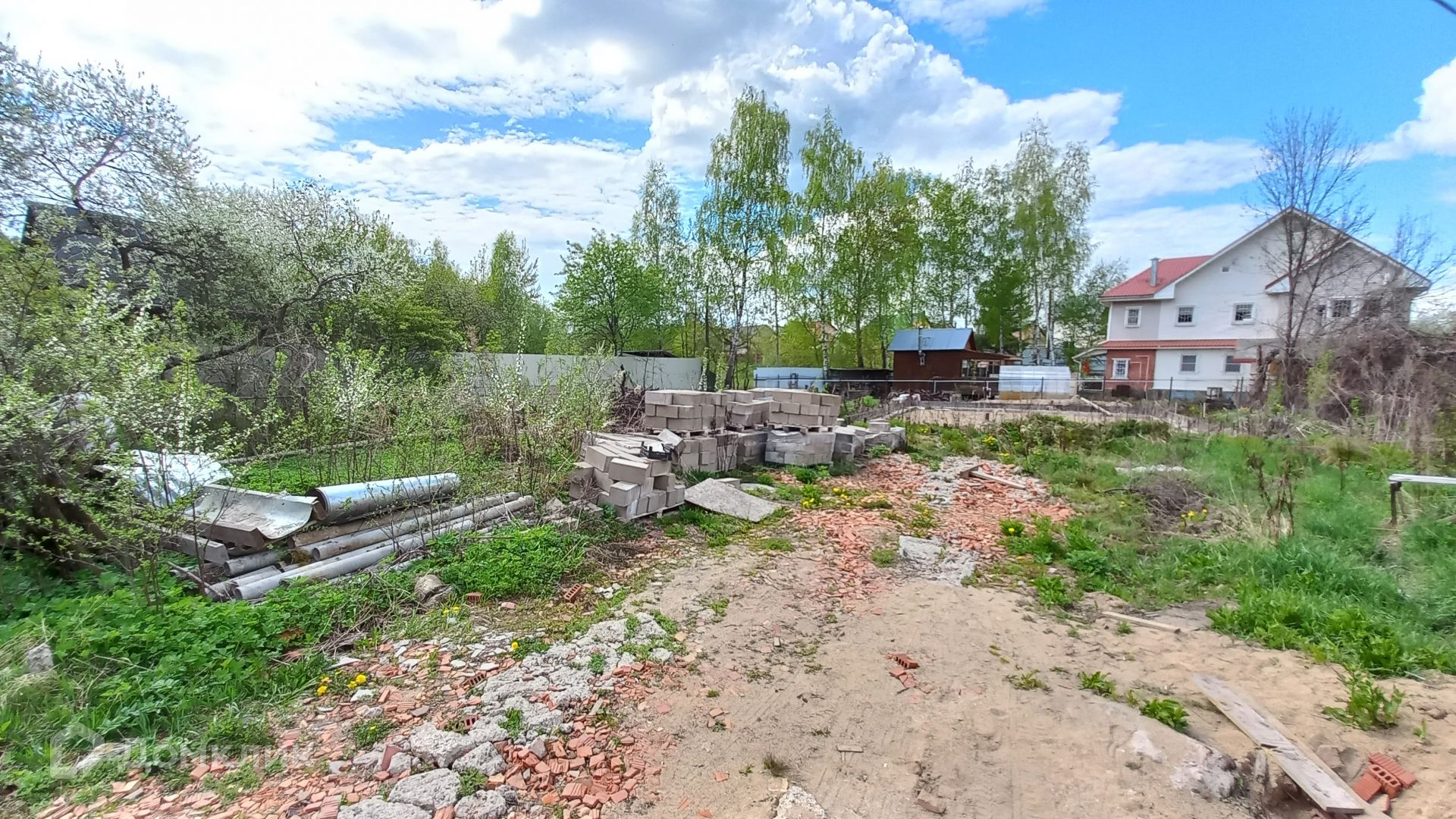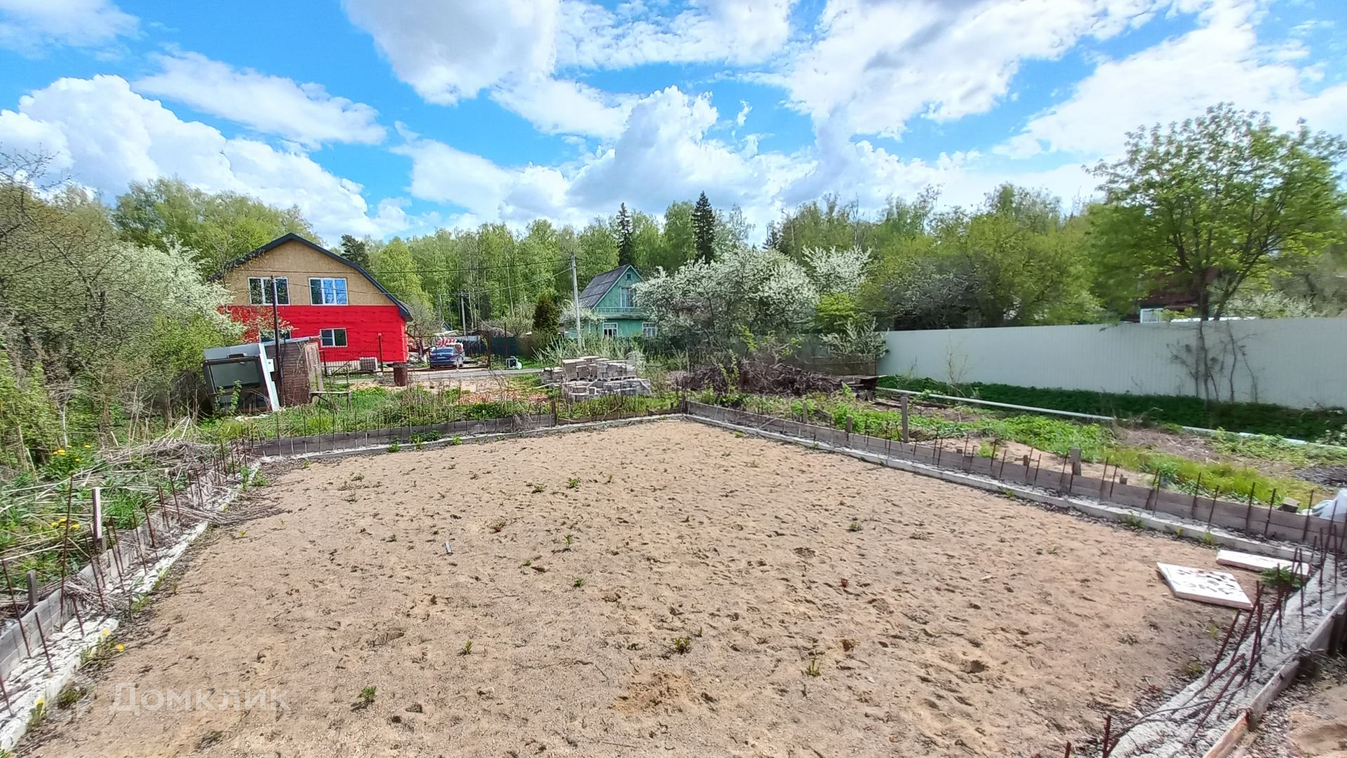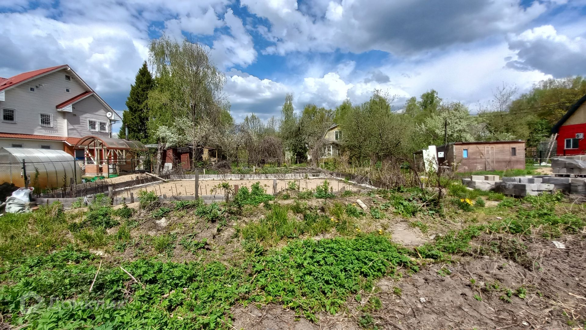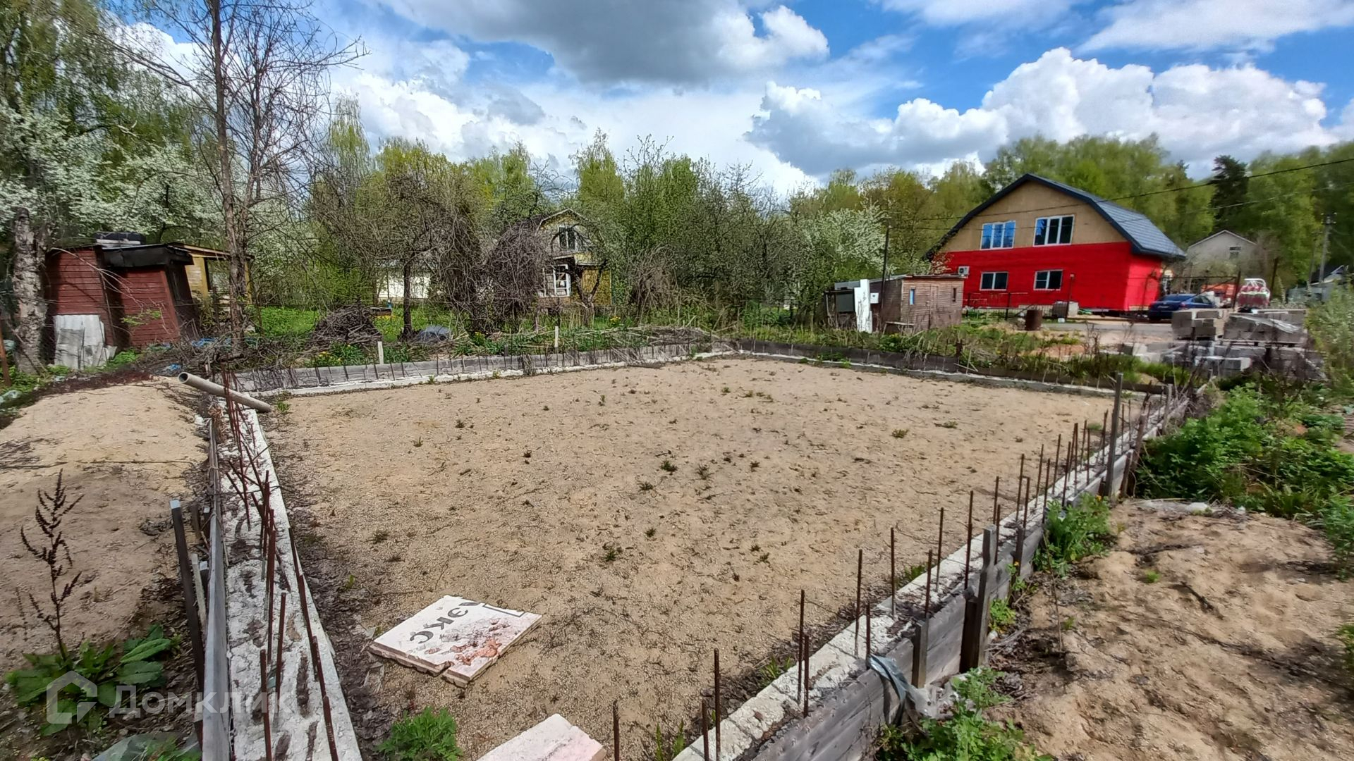 Участок правильной прямоугольной формы, ровный, зеленый, с двух сторон огорожен забором, имеет свой выход к пруду, где можно организовать зону отдыха и барбекю. На участке имеется бытовка (входит в стоимость) с подведенным электричеством, ленточный фундамент 10 х 12 метров, глубиной 120 см, фундамент выполнен по всем технологиям, 300-я марка бетона, выполнена песчаная подушка глубиной 60 см, так же установлена система дренажа.