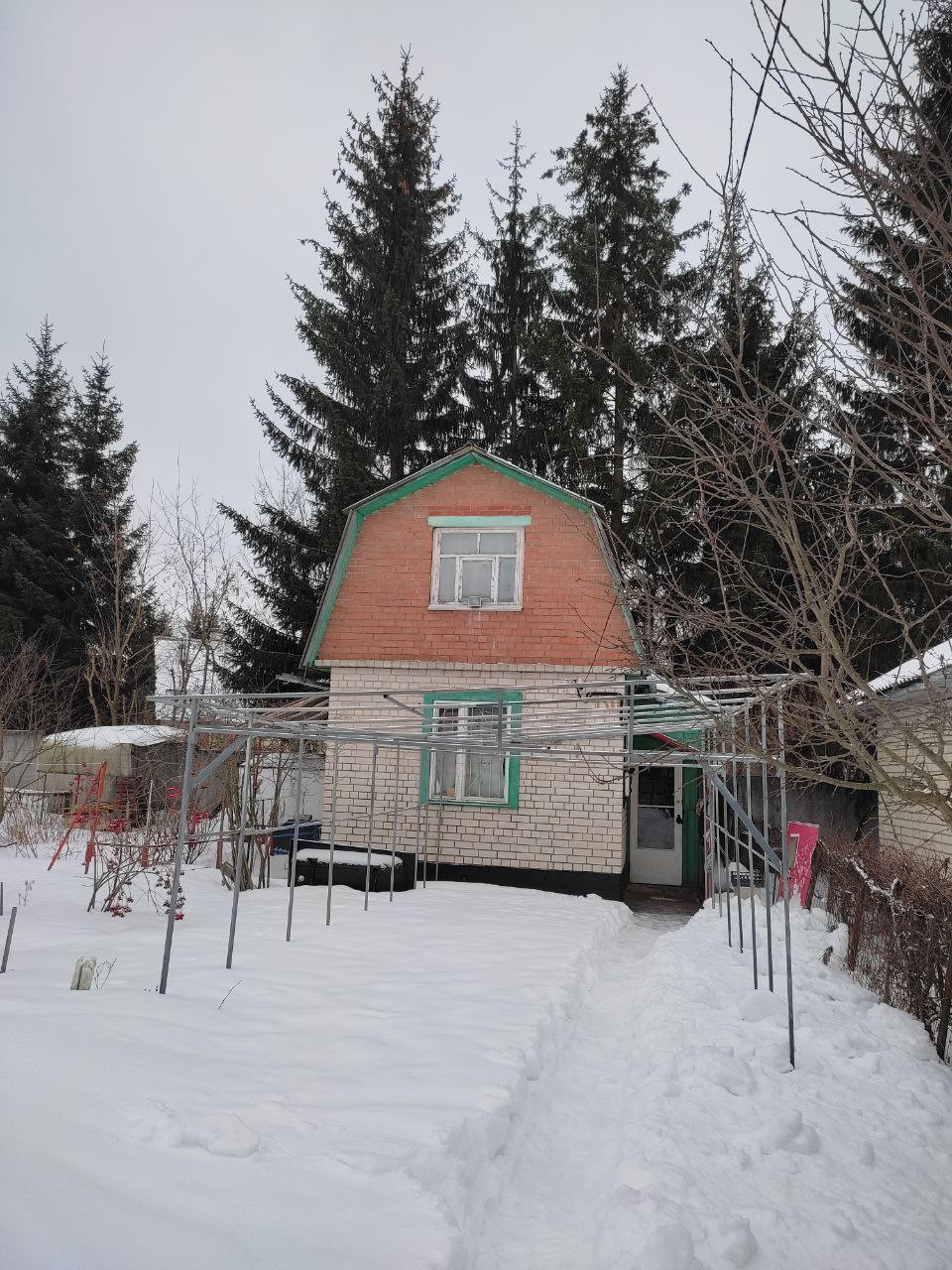 Домик кирпичный 32, 4 кв.м. с мансардой. Крыша шиферная. Внутри обит деревом. Крыльцо и веранда застекленные. Участок 8 соток, огорожен забором из металлочерепицы. От ворот до домика идет бетонная площадка шириной 3 метра. Перед домиком установлен металлический каркас для обустройства сезонной беседки. На территории есть кирпичные хозпостройки - кладовая для сельхоз инструмента и туалет. От домика к хозпостроикам идет бетонная дорожка шириной 0,5 метра. Есть собственная скважина, теплица. Территория ухоженная. Из культурных насаждений есть яблони, вишни, черная и красная смородина, крыжовник. Также на территории по обеим сторонам бетонной площадки разбиты клумбы, на которых высажены розы, пионы, тюльпаны, астры и т.д. Газ и централизованная вода проходят рядом (у многих соседей есть).
