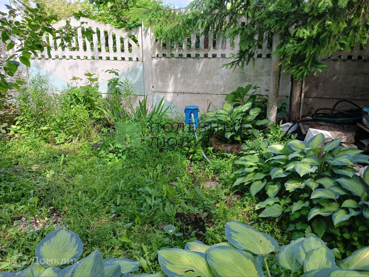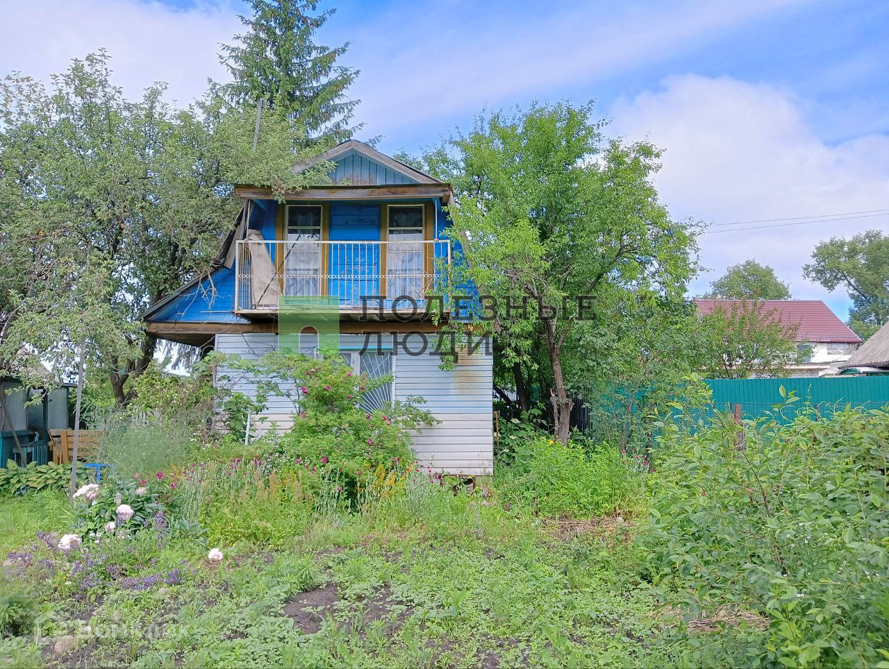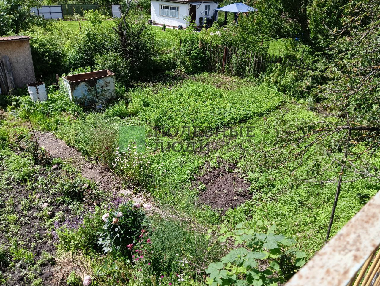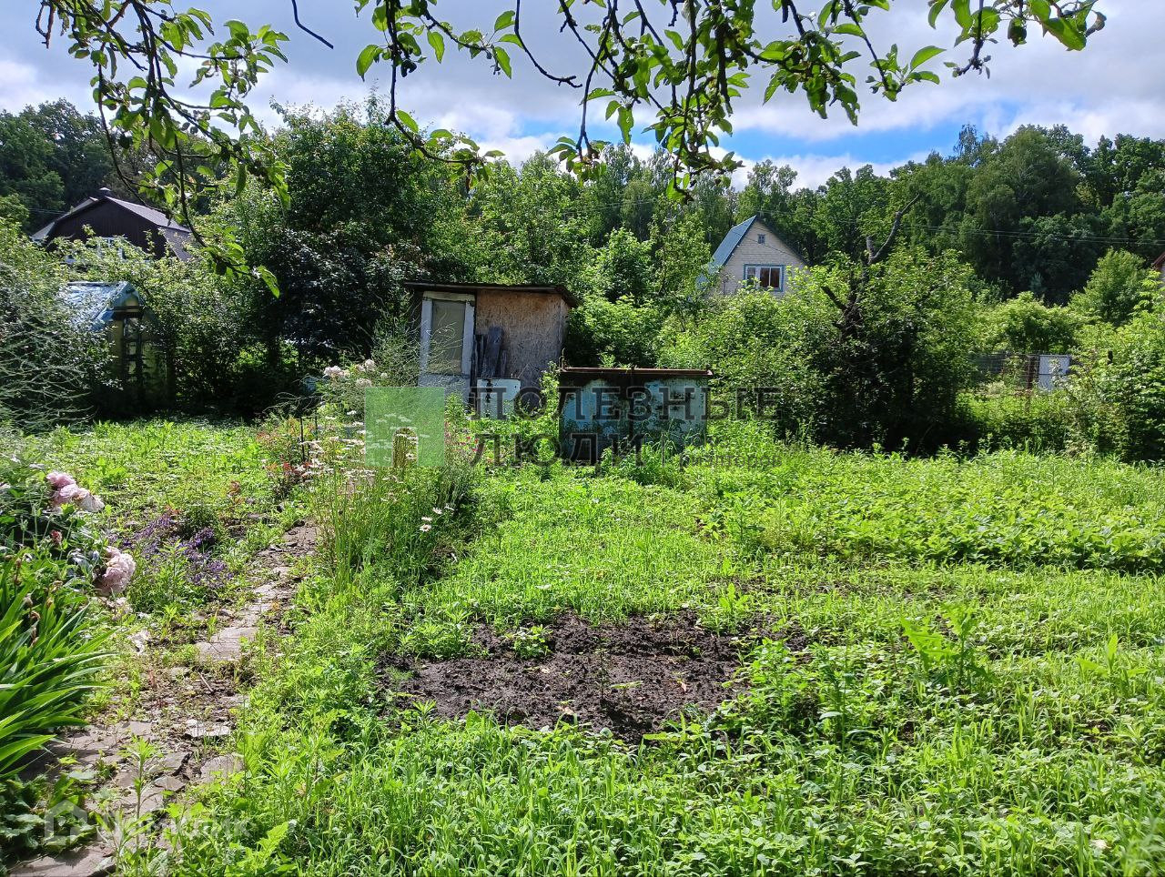 На участке растут плодовые деревья, клубника, кустарники, много цветов.