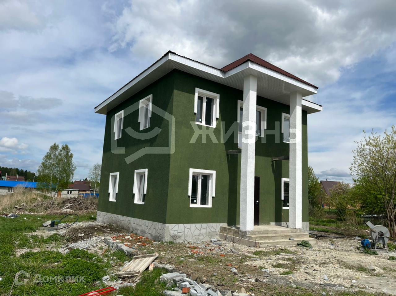 Дом построен из тёплого экологического материала арболит ( арболитовые блоки ). Крыша из ондулина. Фасад дома полностью готов и не требует никаких затрат.