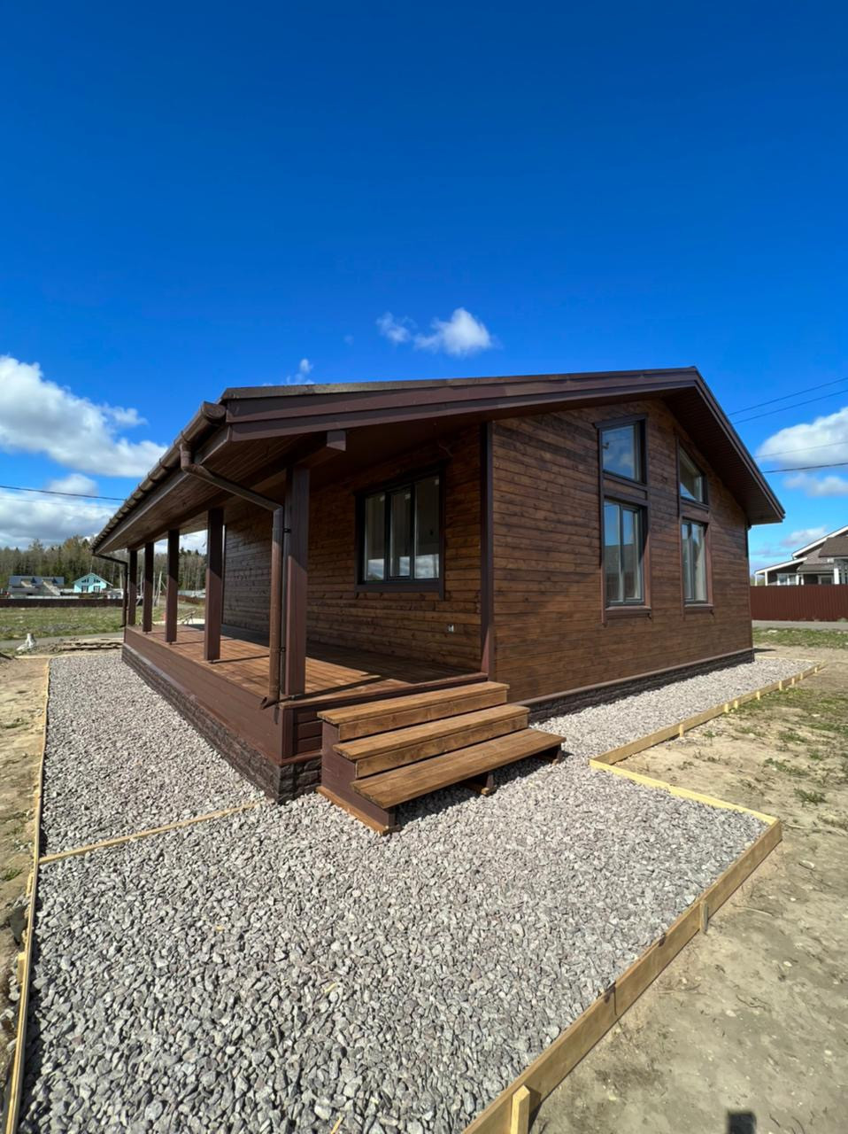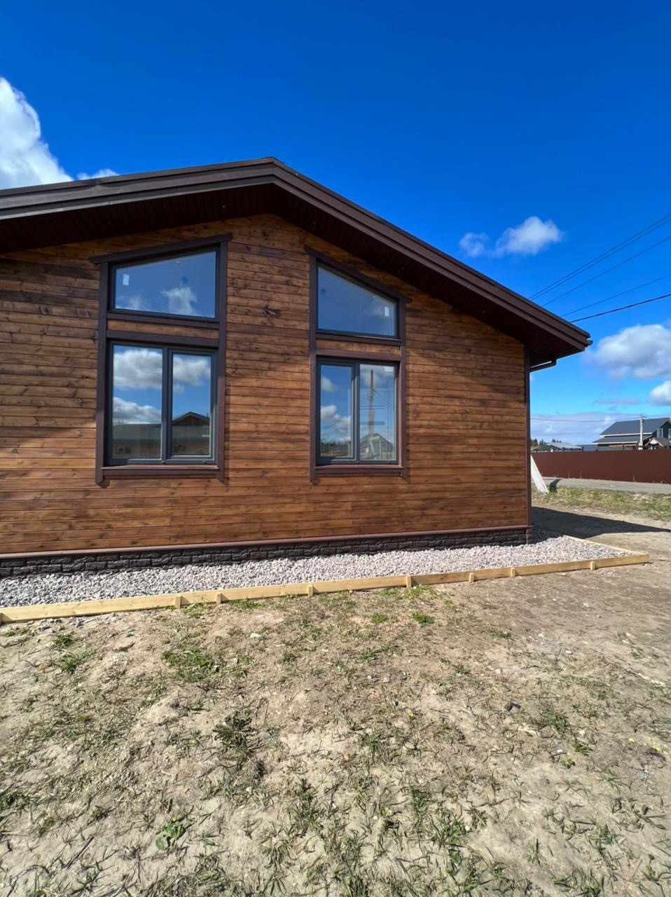 Дом каркасный, полностью обработан огне-биозащитой, установлена сетка от грызунов. Снаружи обшит имитацией бруса.