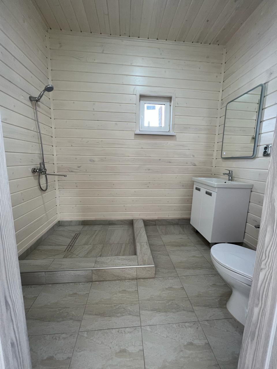 Отделка в комнатах - имитация бруса, пол - керамогранит.