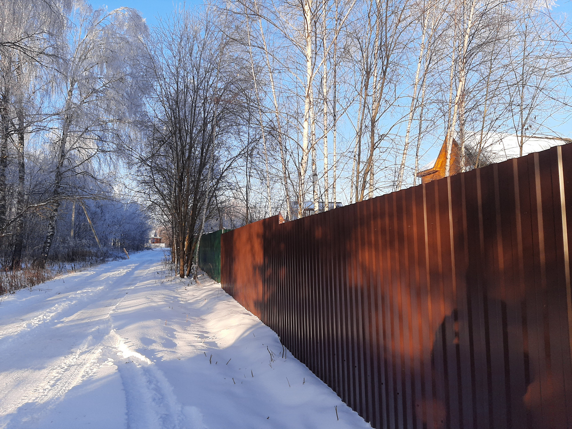 Участок огорожен забором из профлиста, подъезд отличный круглый год.Многие соседи - постоянные жители.