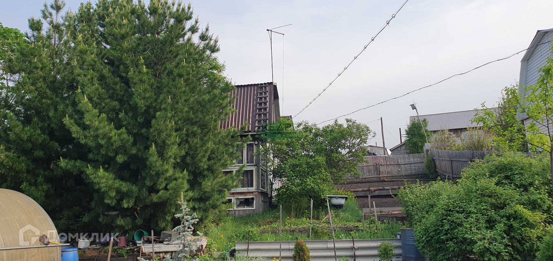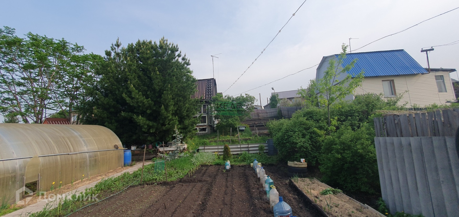 Участок огорожен комбинированным забором с установленными воротами из профлиста, выделена зона отдыха под тремя пушистыми кедрами.