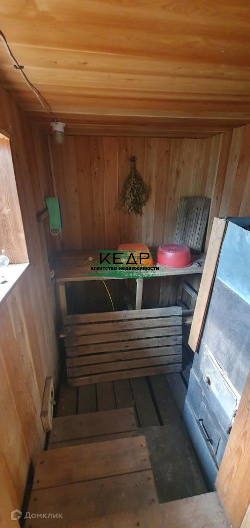 Баня построена из бруса, обшита деревянной вагонкой, имеет 2 помещения: парилка с печкой, камнями, помывочная.
